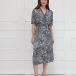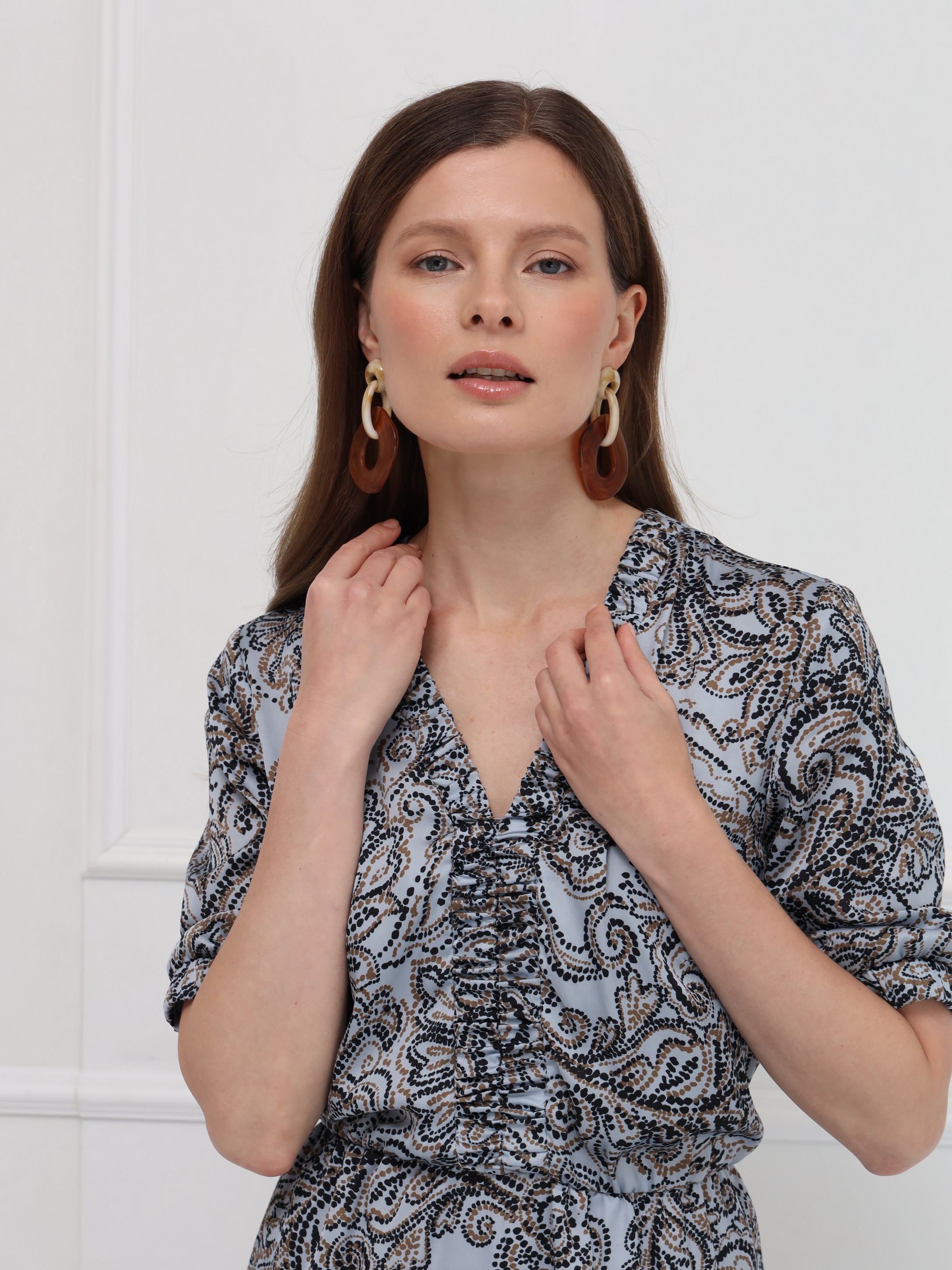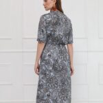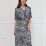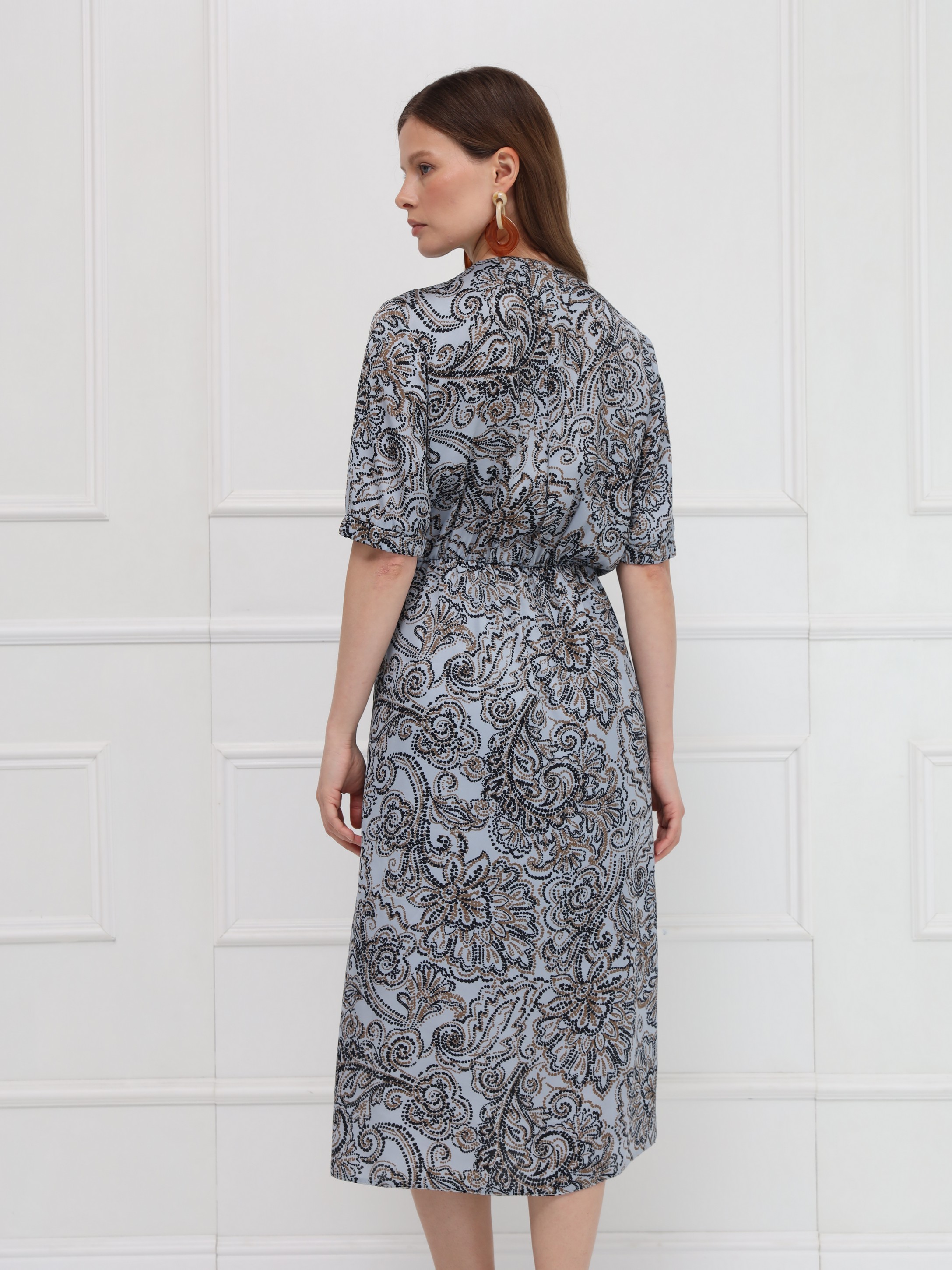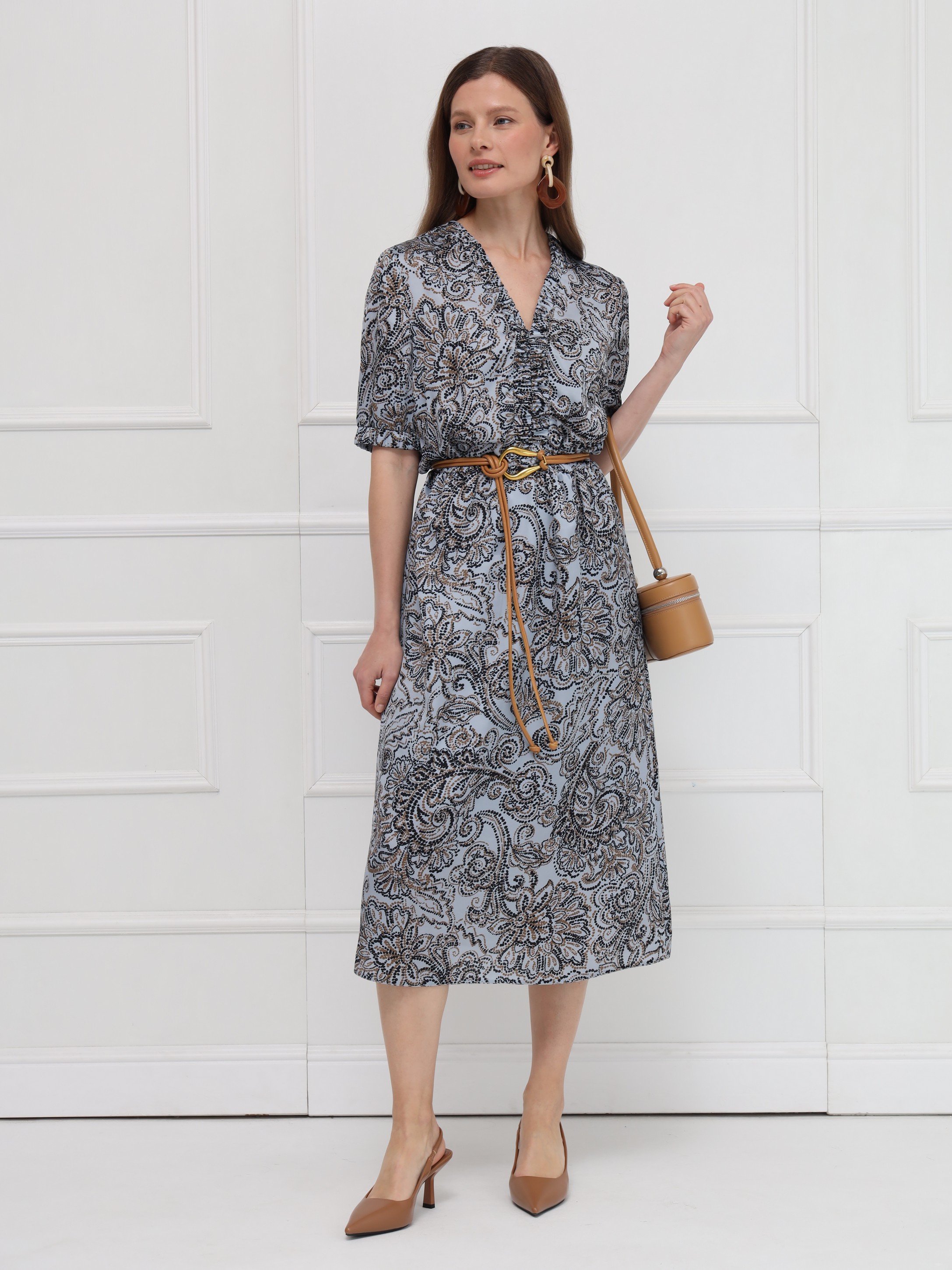 Платье миди из искусственного шёлка выполнено в женственном силуэте: отрезное по талии и с юбкой-трапецией, которая мягко струится при движении. V-образная горловина и центральная часть лифа украшены присборенными планками, создающими изящный акцент. Такая же деликатная отделка повторяется по низу коротких рукавов, поддерживая цельность дизайна. Талия фиксируется мягкой тонкой резинкой изнутри, обеспечивая комфортную посадку. Нижняя часть платья дополнена подкладкой для удобства и лучшего прилегания. Привлекает внимание выразительный принт - россыпь камней и бисера в коричневых оттенках на сером фоне, который делает образ утончённым и запоминающимся.