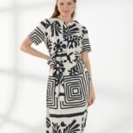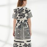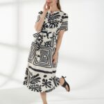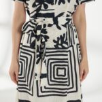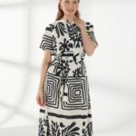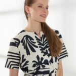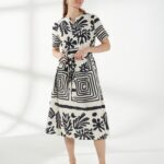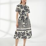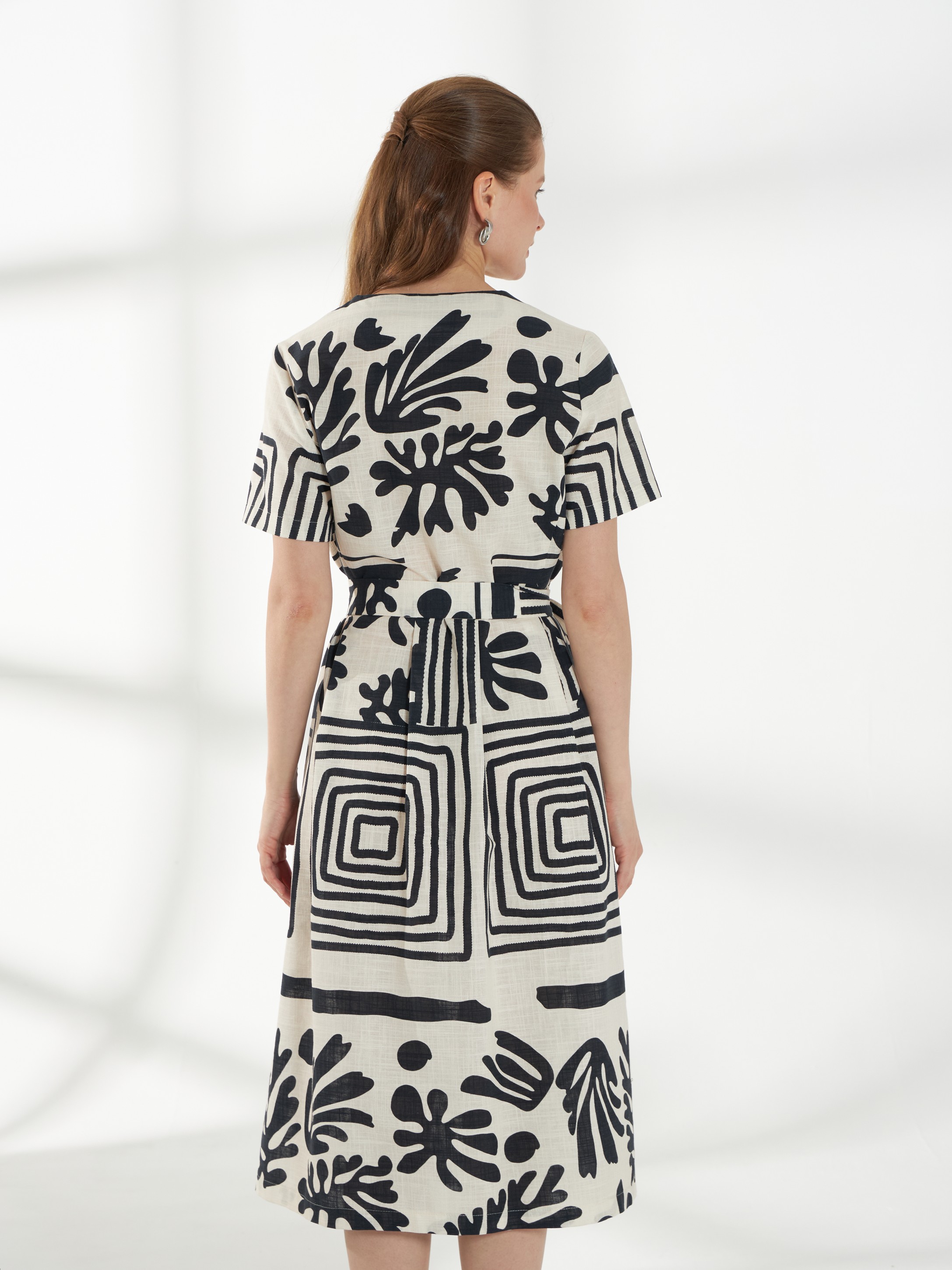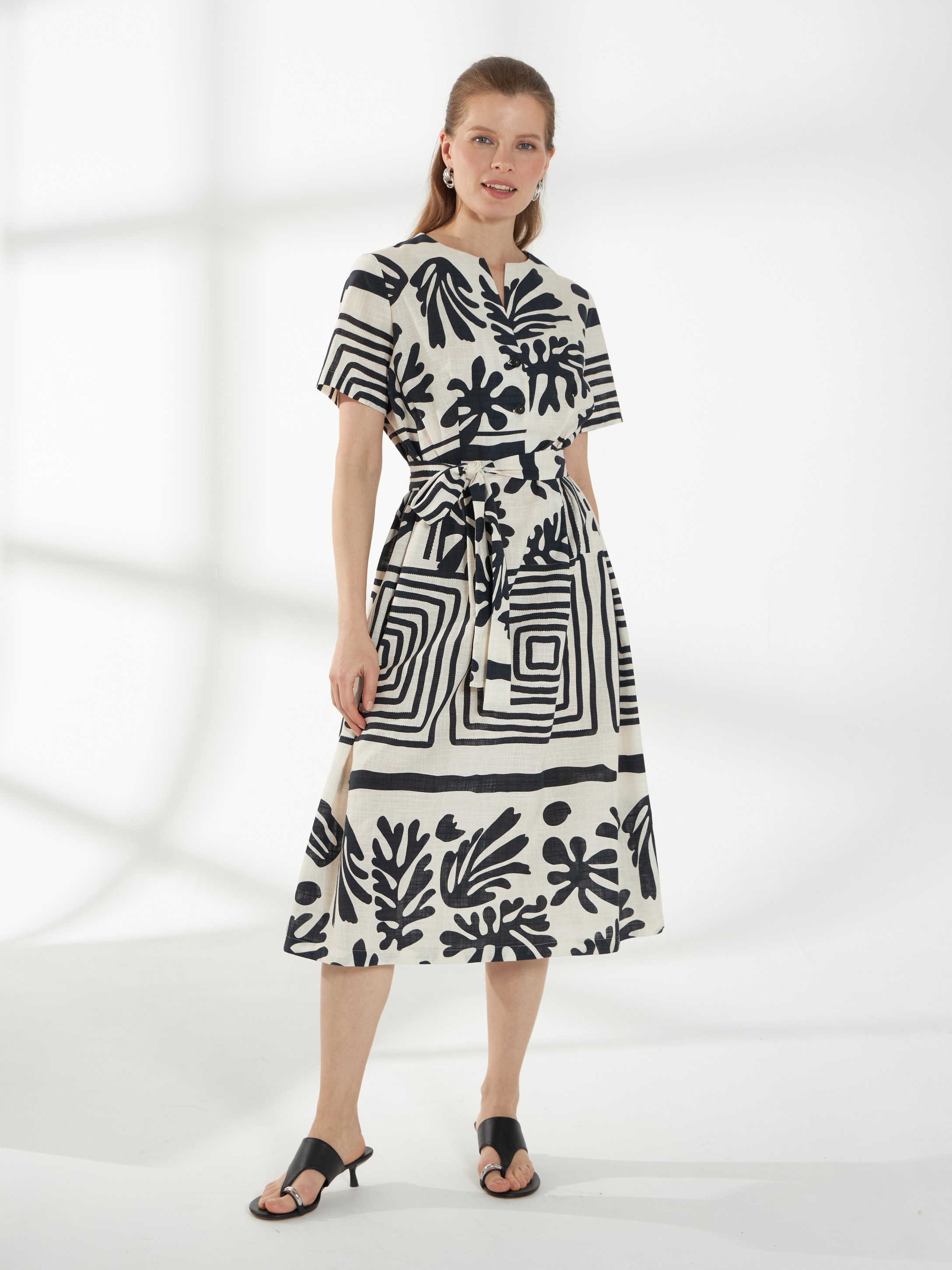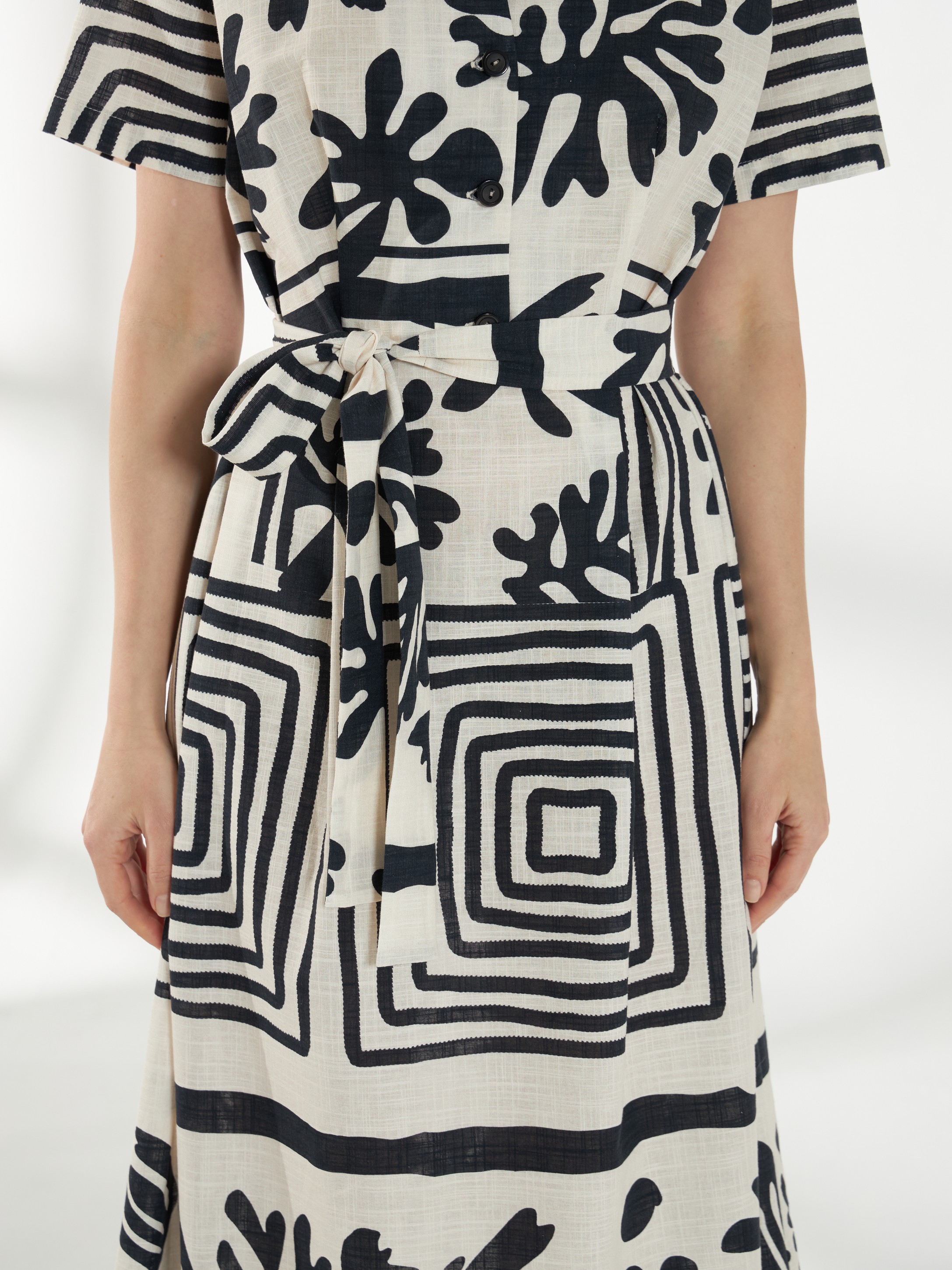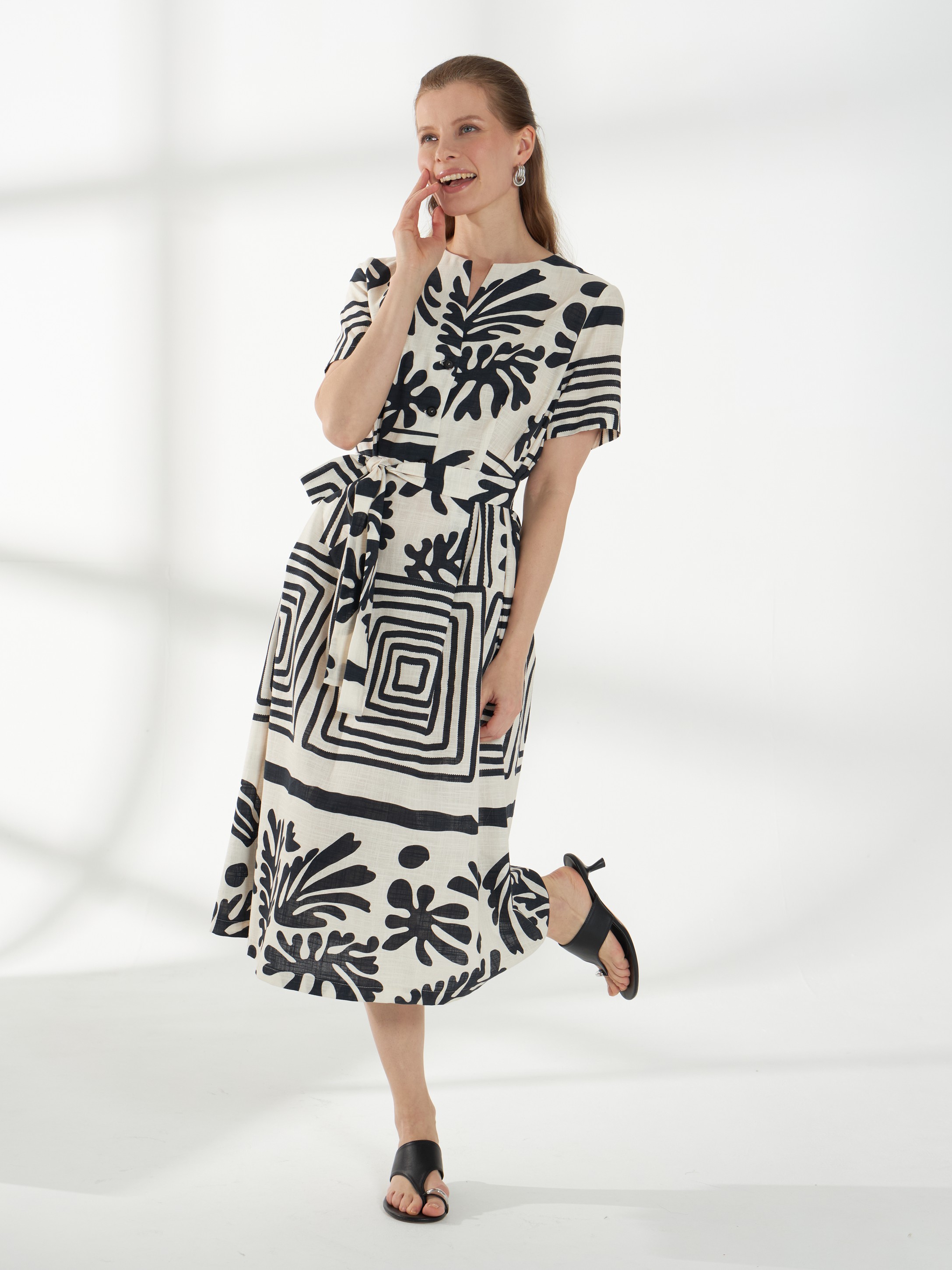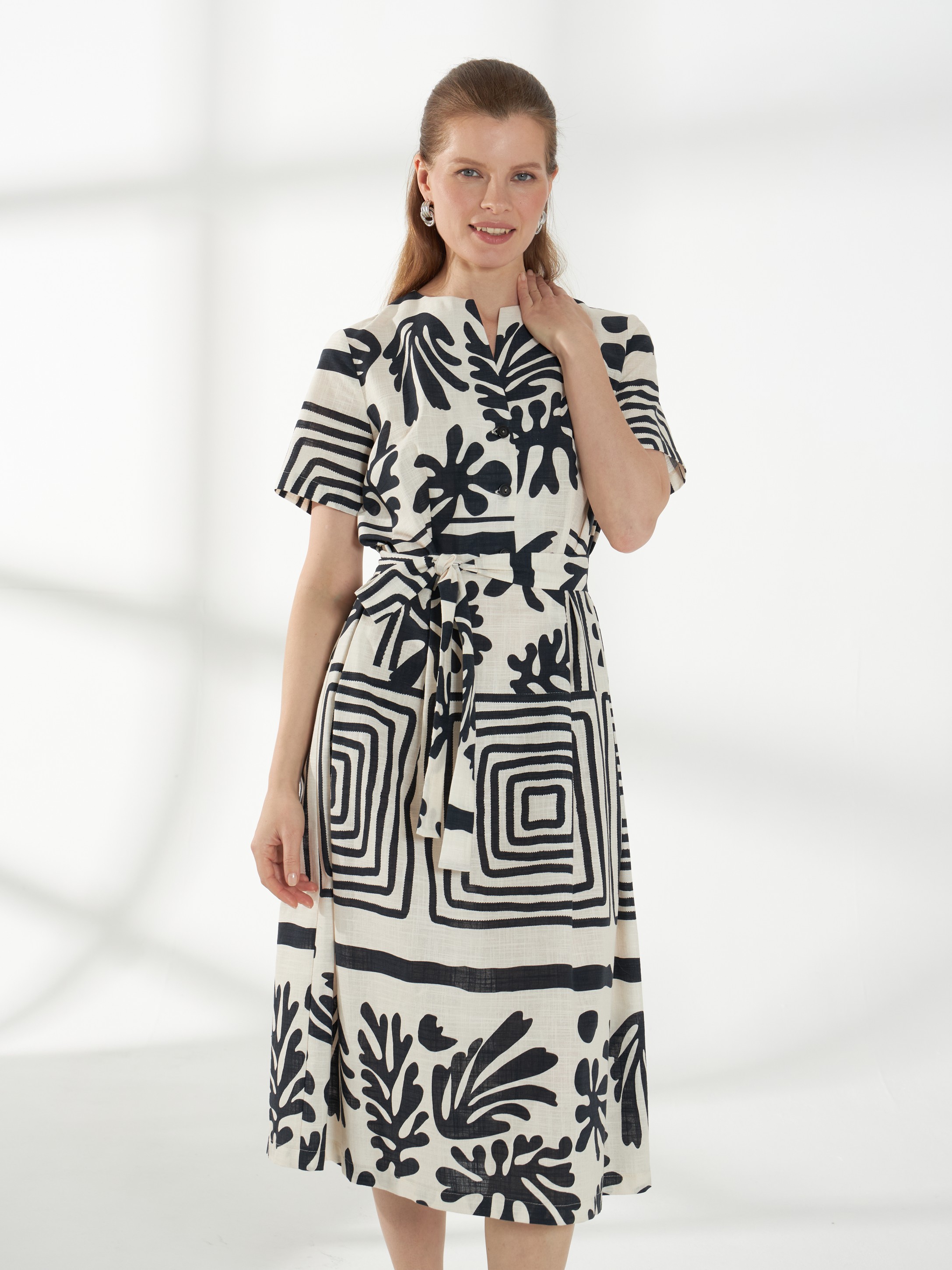 Легкое платье из хлопка, с крупным арт-дизайном на молочном фоне, который привлекает внимание и подчеркивает индивидуальность. Модель, отрезная по талии, короткими рукавами, с широкой юбкой в мягкие складки. Лиф с фигурным вырезом, застегивается на пуговицы. Завершает образ пояс-лента, подчеркивающий талию.