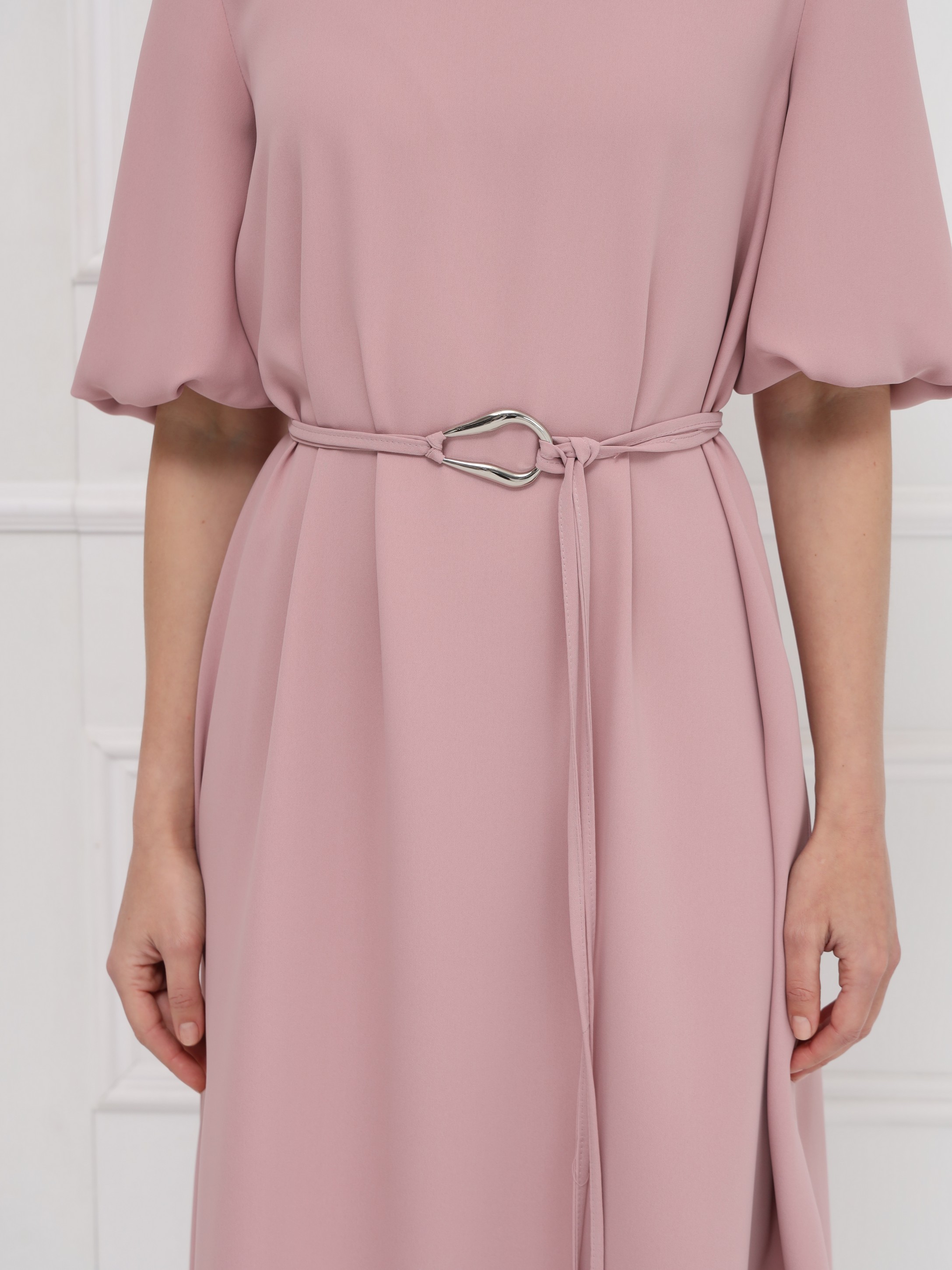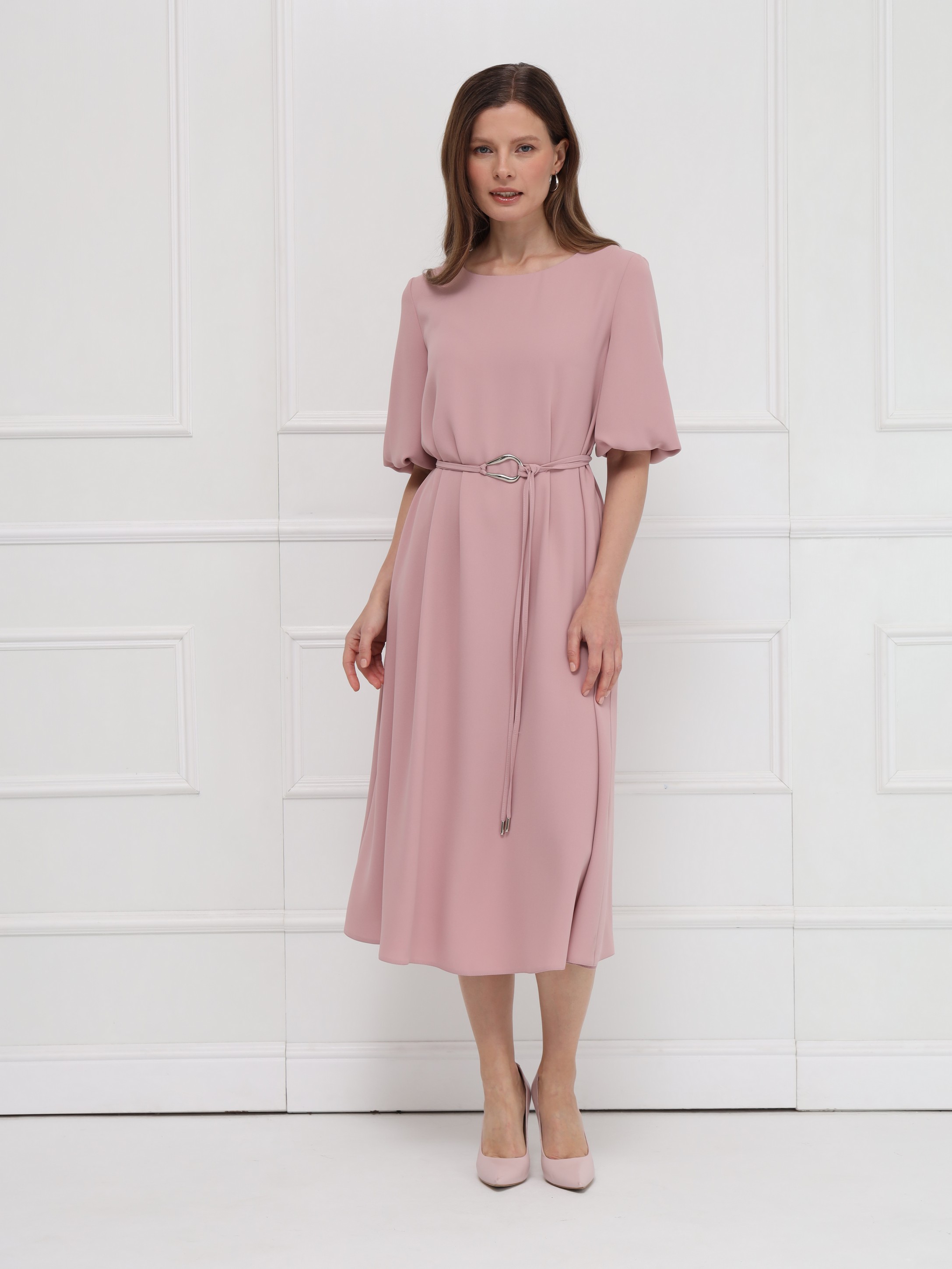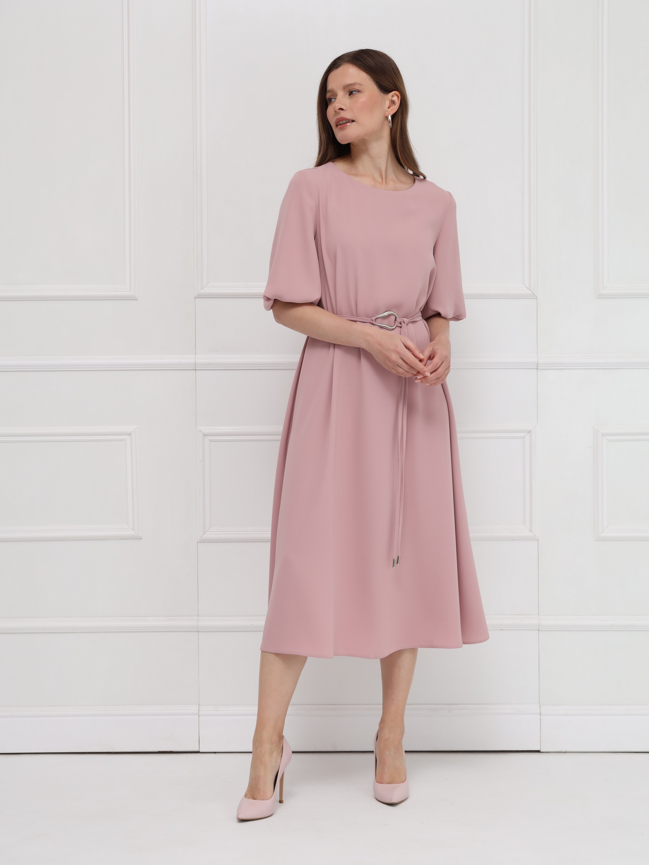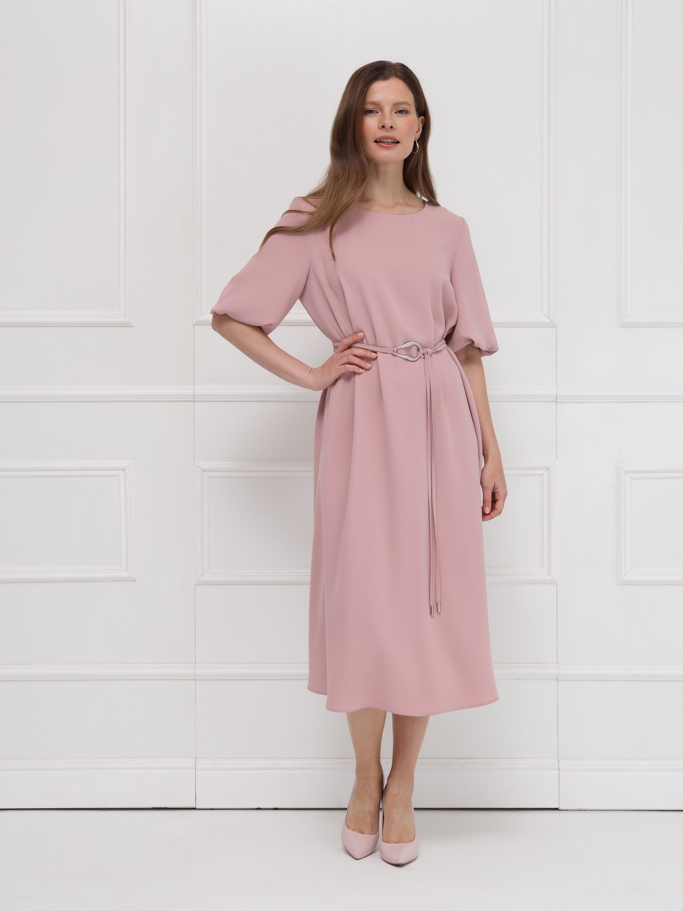 Платье-миди из тонкого крепа имеет расширенный книзу силуэт, создающий лёгкость и плавность линий. Овальная горловина подчёркивает изящество шеи, а рукава-баллоны с мягкой линией низа, обработанные подкладкой, сохраняют объёмную форму и придают образу романтичность. Узкий пояс с изящной пряжкой аккуратно подчёркивает талию, делая силуэт женственным и гармоничным. Идеальная модель для лёгких весенних образов с изысканным настроением.