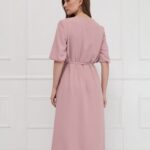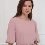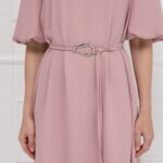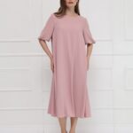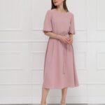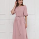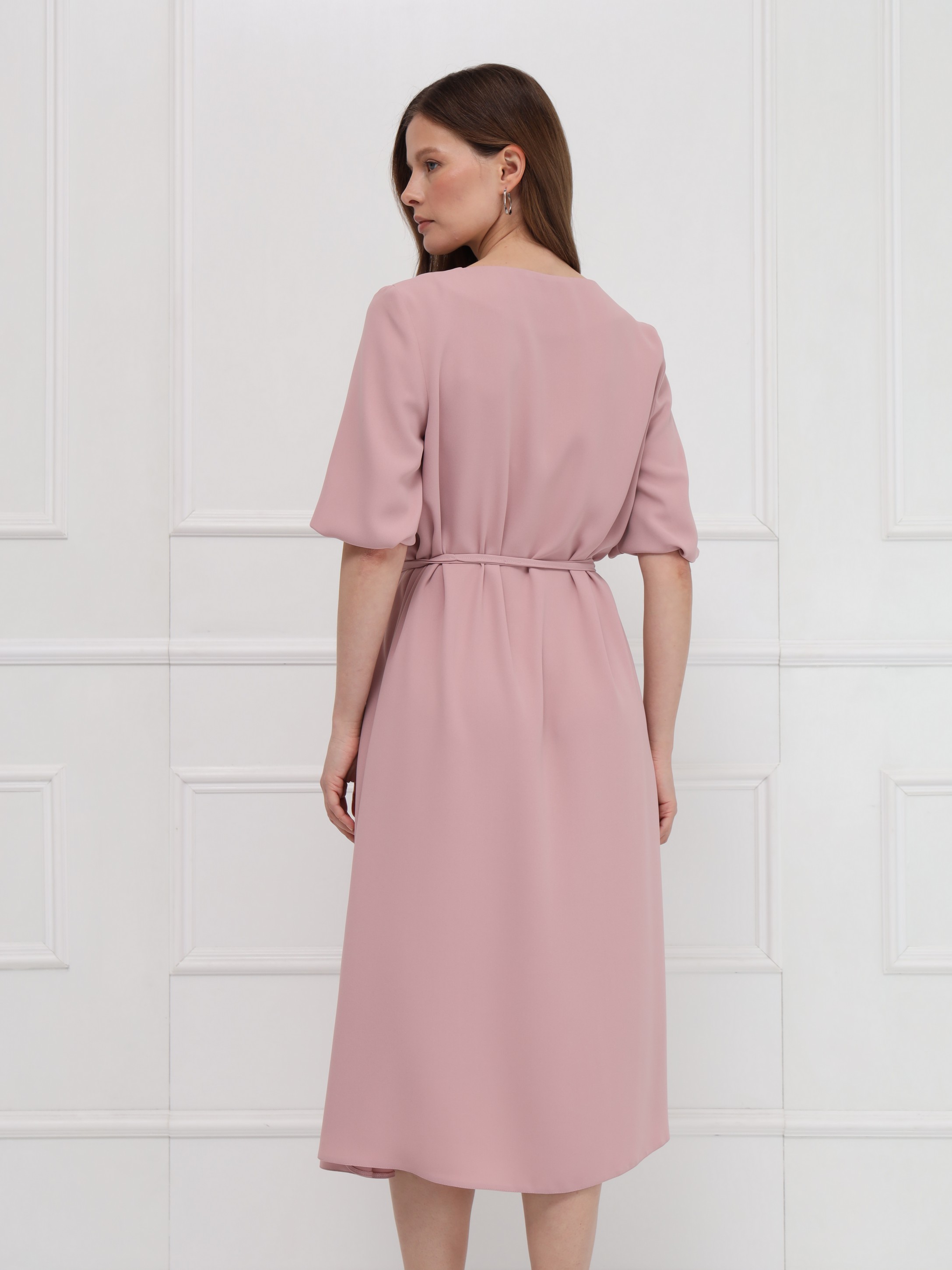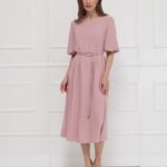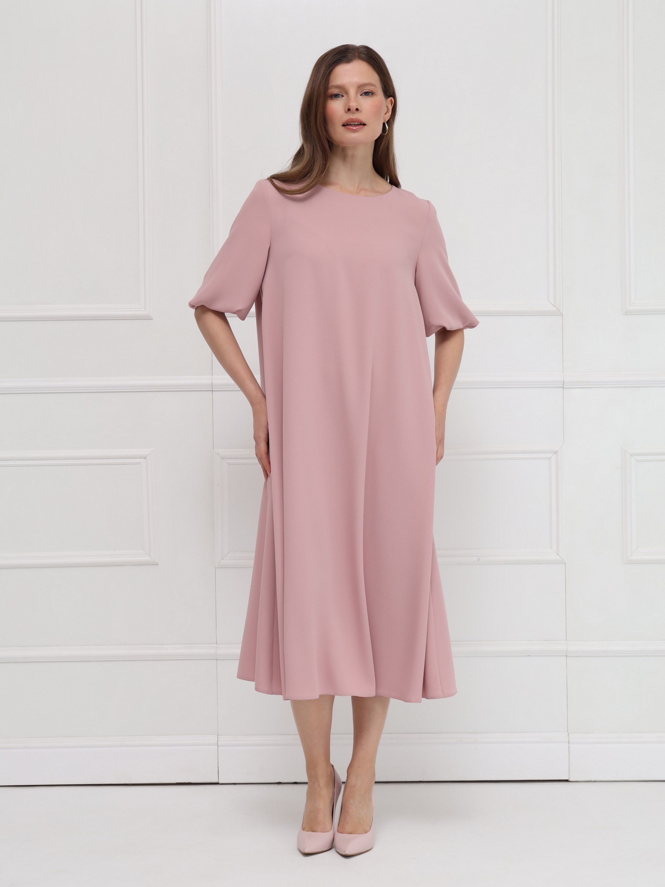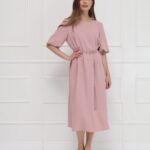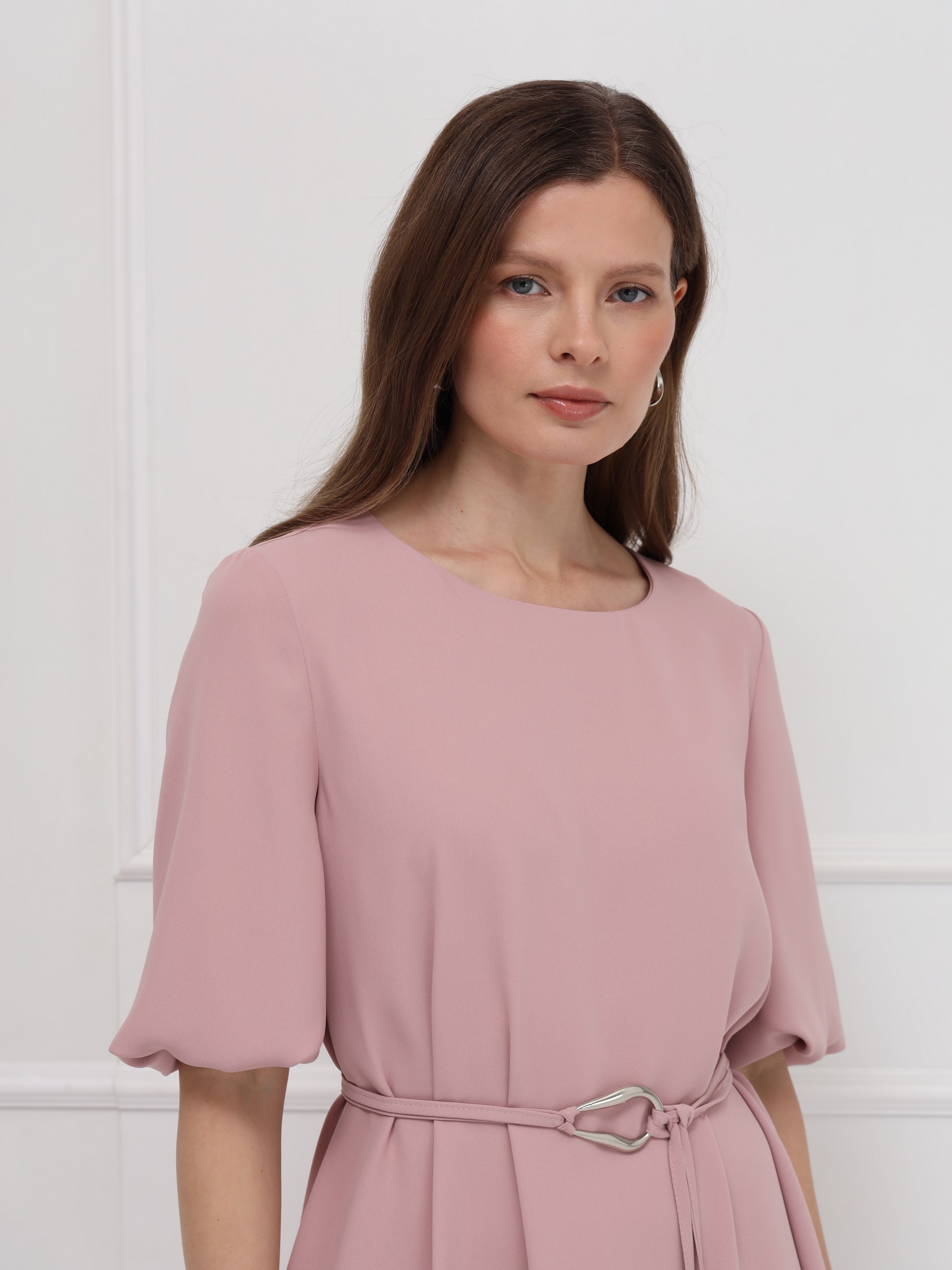 Платье-миди из тонкого крепа имеет расширенный книзу силуэт, создающий лёгкость и плавность линий. Овальная горловина подчёркивает изящество шеи, а рукава-баллоны с мягкой линией низа, обработанные подкладкой, сохраняют объёмную форму и придают образу романтичность. Узкий пояс с изящной пряжкой аккуратно подчёркивает талию, делая силуэт женственным и гармоничным. Идеальная модель для лёгких весенних образов с изысканным настроением.