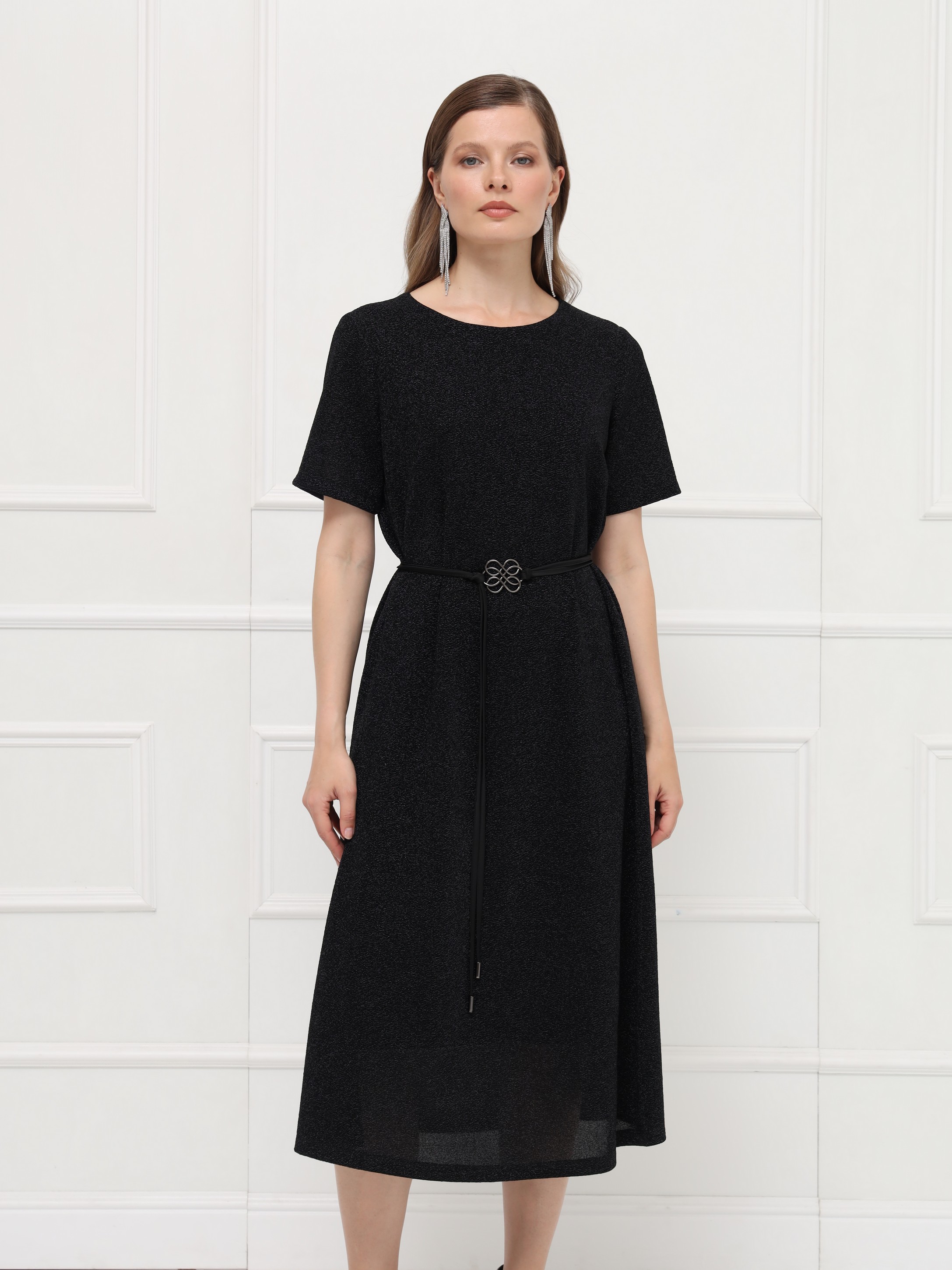 Изысканное черное платье миди, из тонкого трикотажа с деликатным мерцанием, создаёт лёгкий, женственный образ. Лаконичная горловина и короткие рукава подчёркивают линию плеч, а тонкий пояс-тесьма с элегантной пряжкой красиво акцентирует талию. Платье выполнено на подкладке для безупречной посадки, а лёгкая ткань струится вниз, придавая силуэту особую воздушность.
