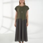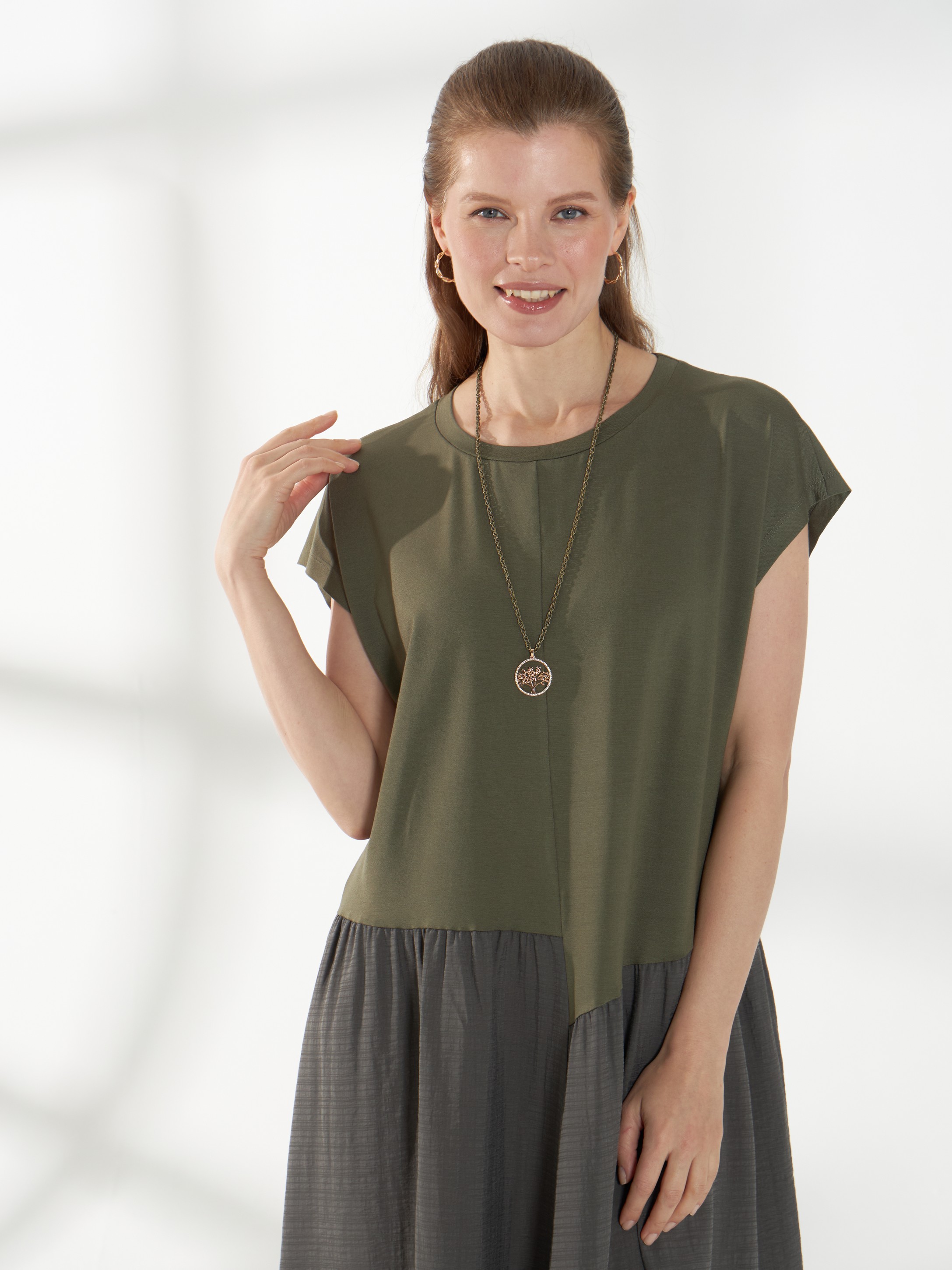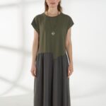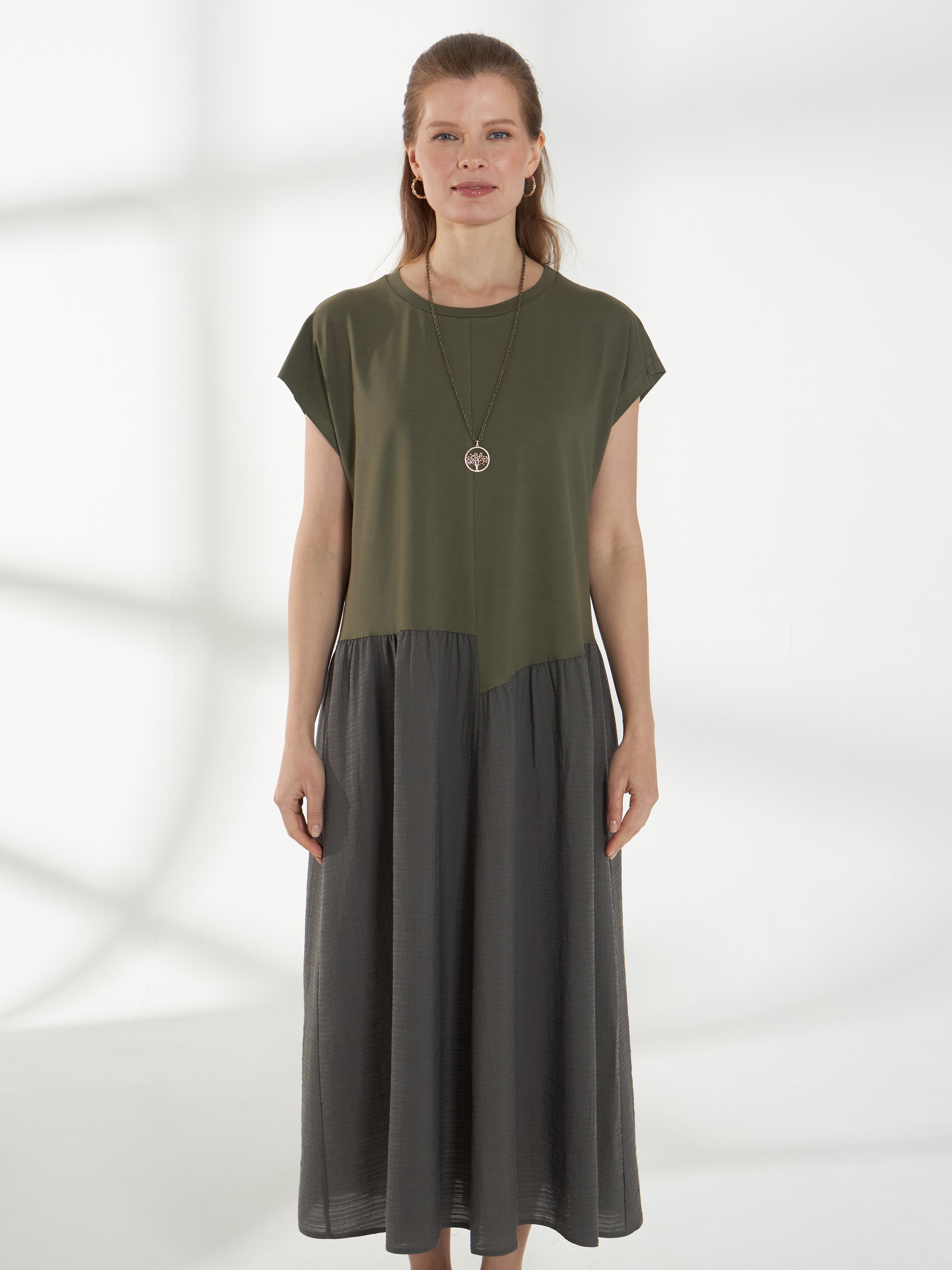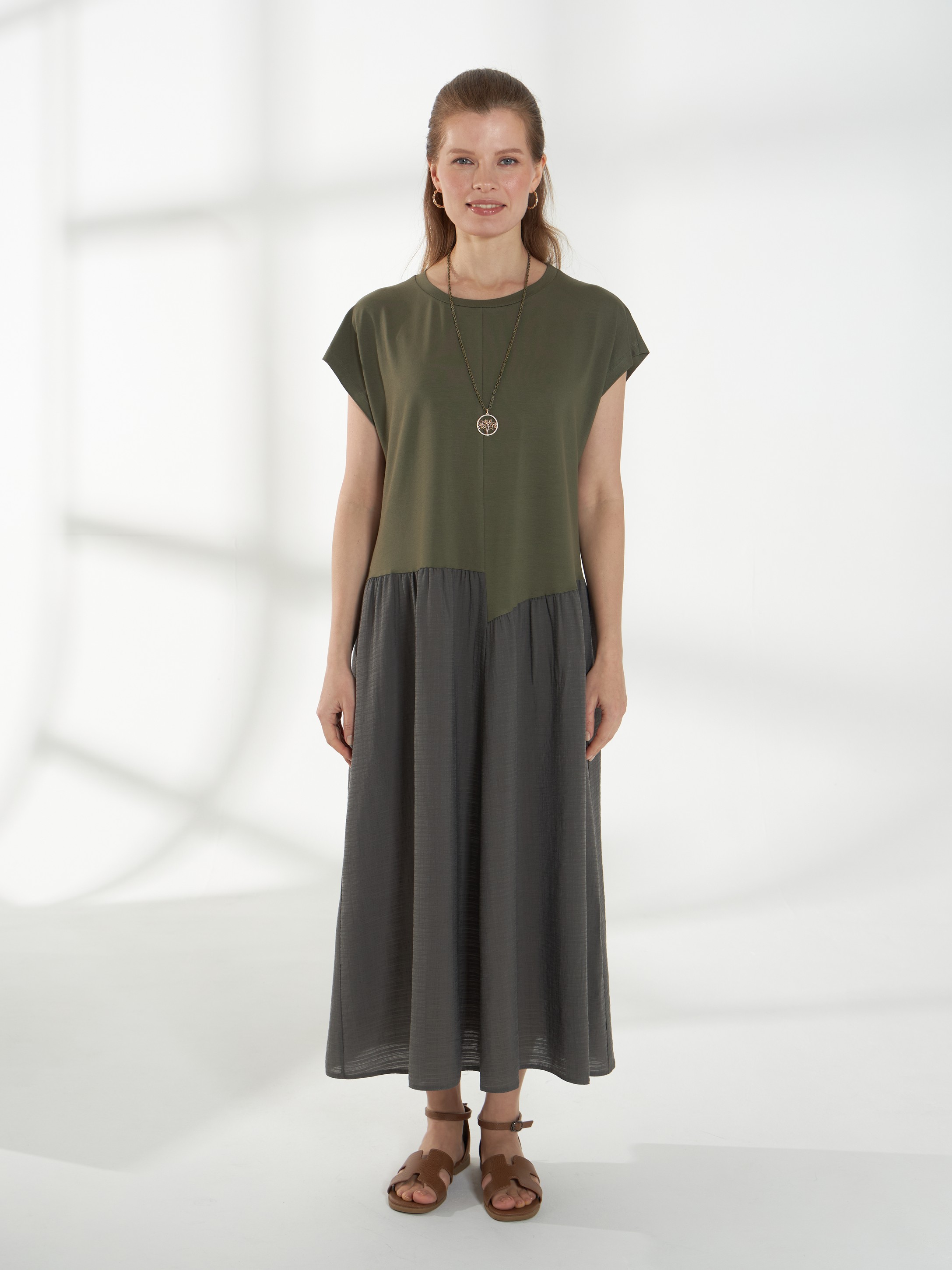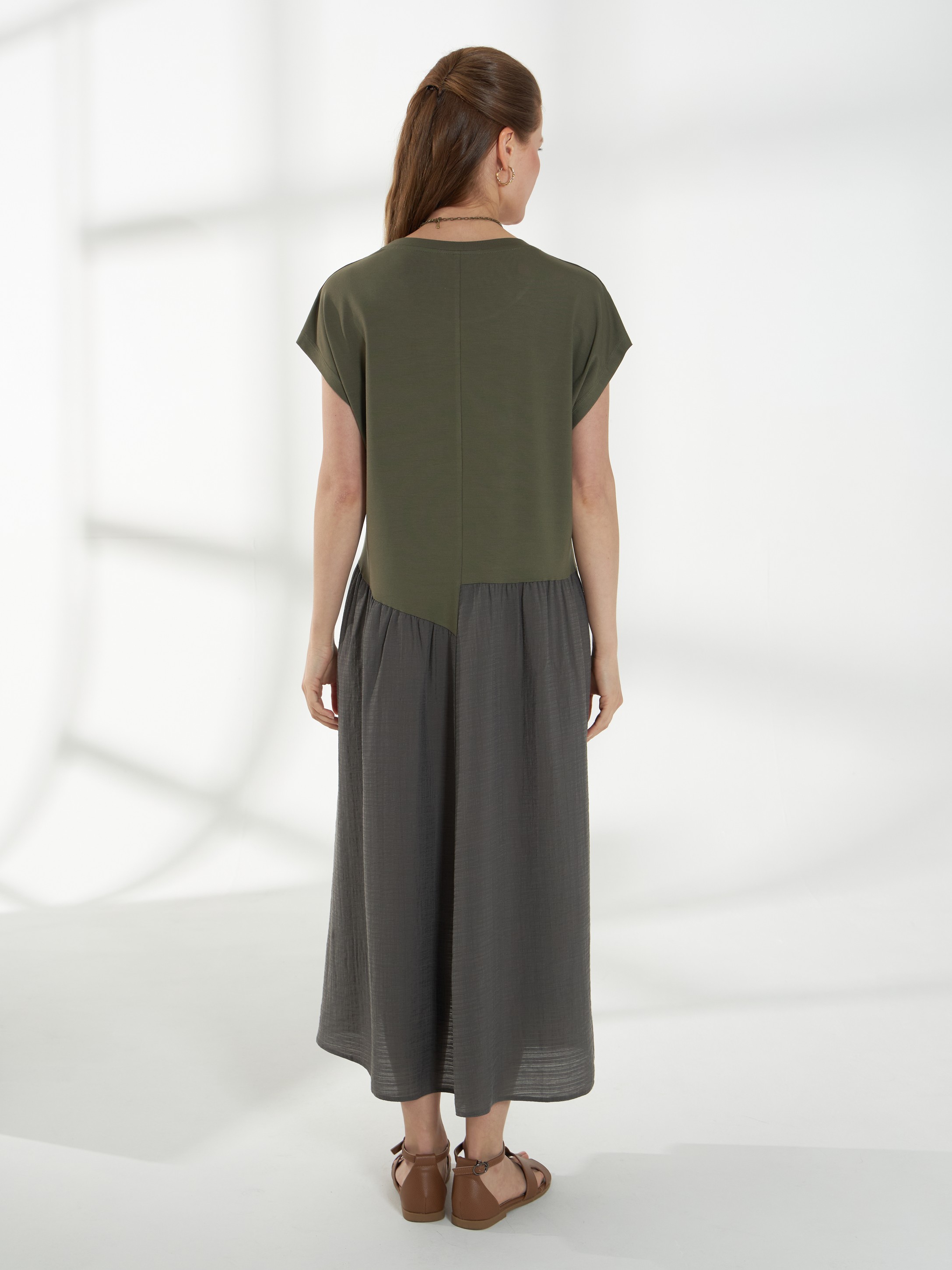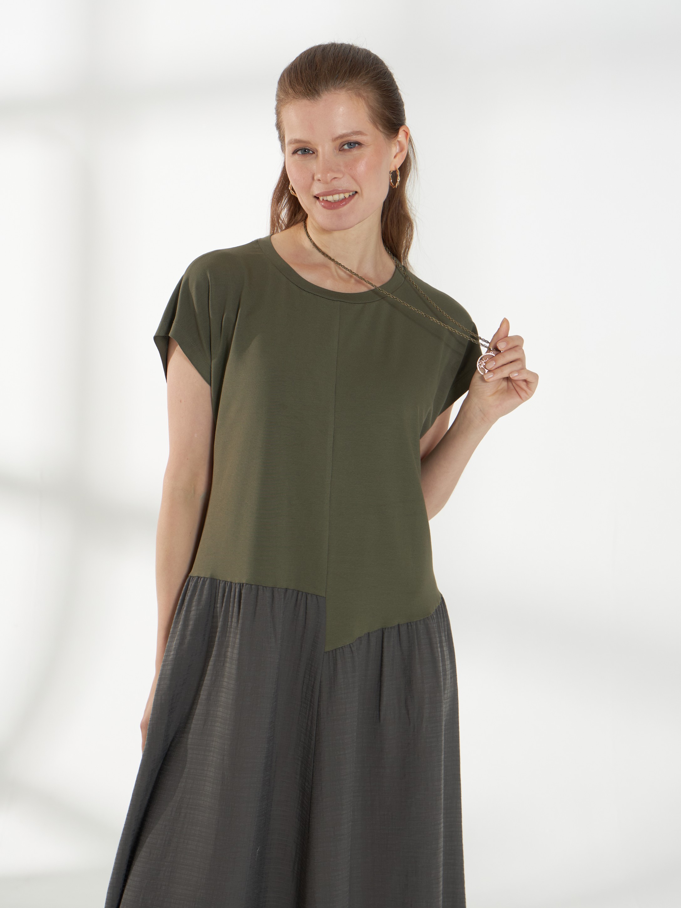 Свободное комбинированное платье, в стиле бохо. Верхняя часть выполнена из мягкого вискозного трикотажа, нижняя-из легкой вискозной ткани, что создаёт комфортный и воздушный силуэт. Ассиметричный крой и лёгкая сборка добавляют динамики и непринужденной элегантности образу, делая длинное платье идеальным для повседневного ношения и летних прогулок.