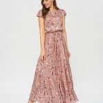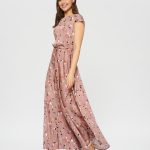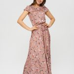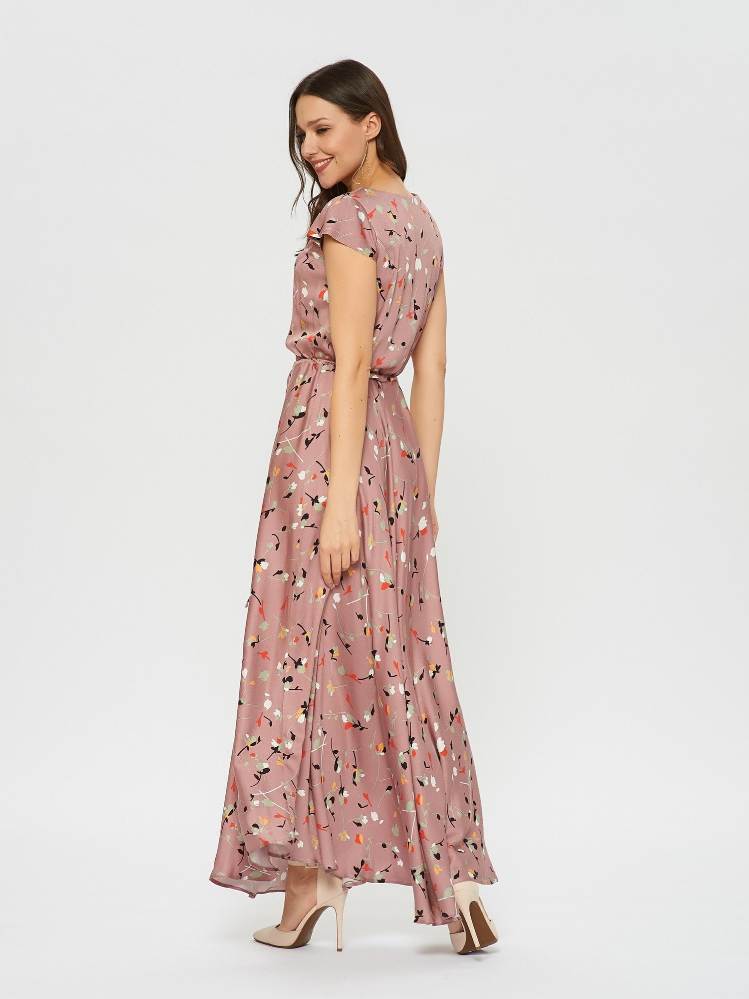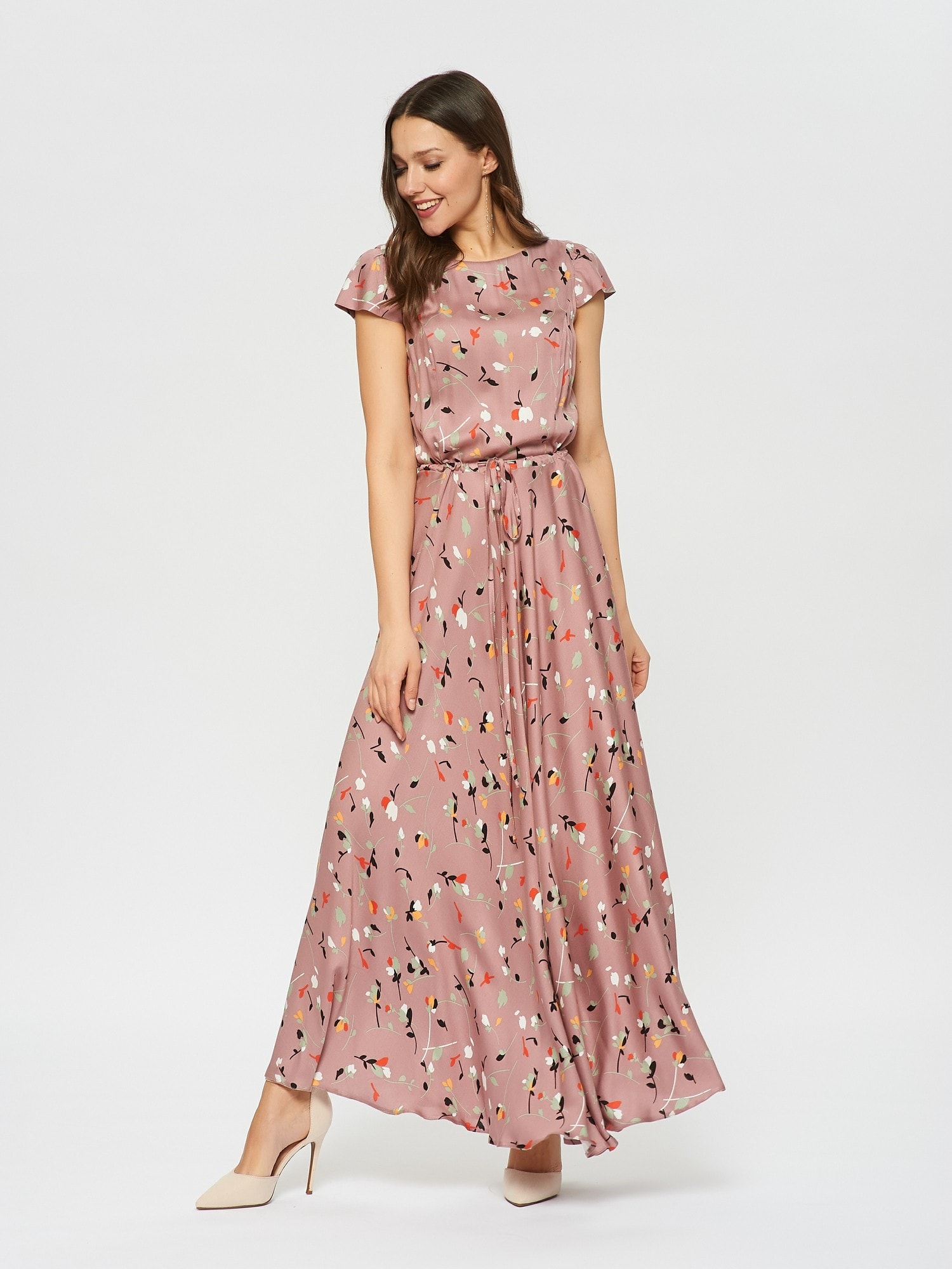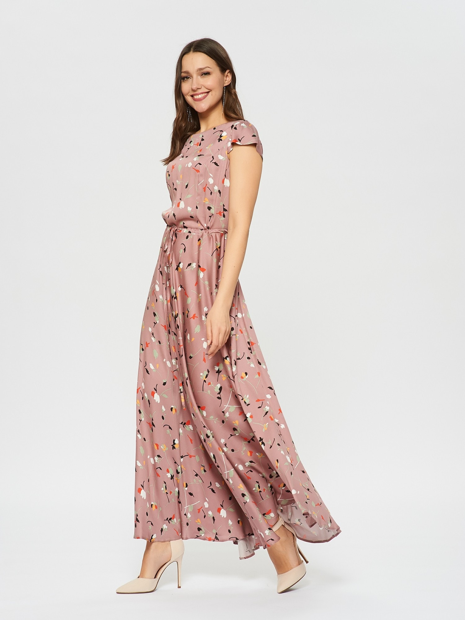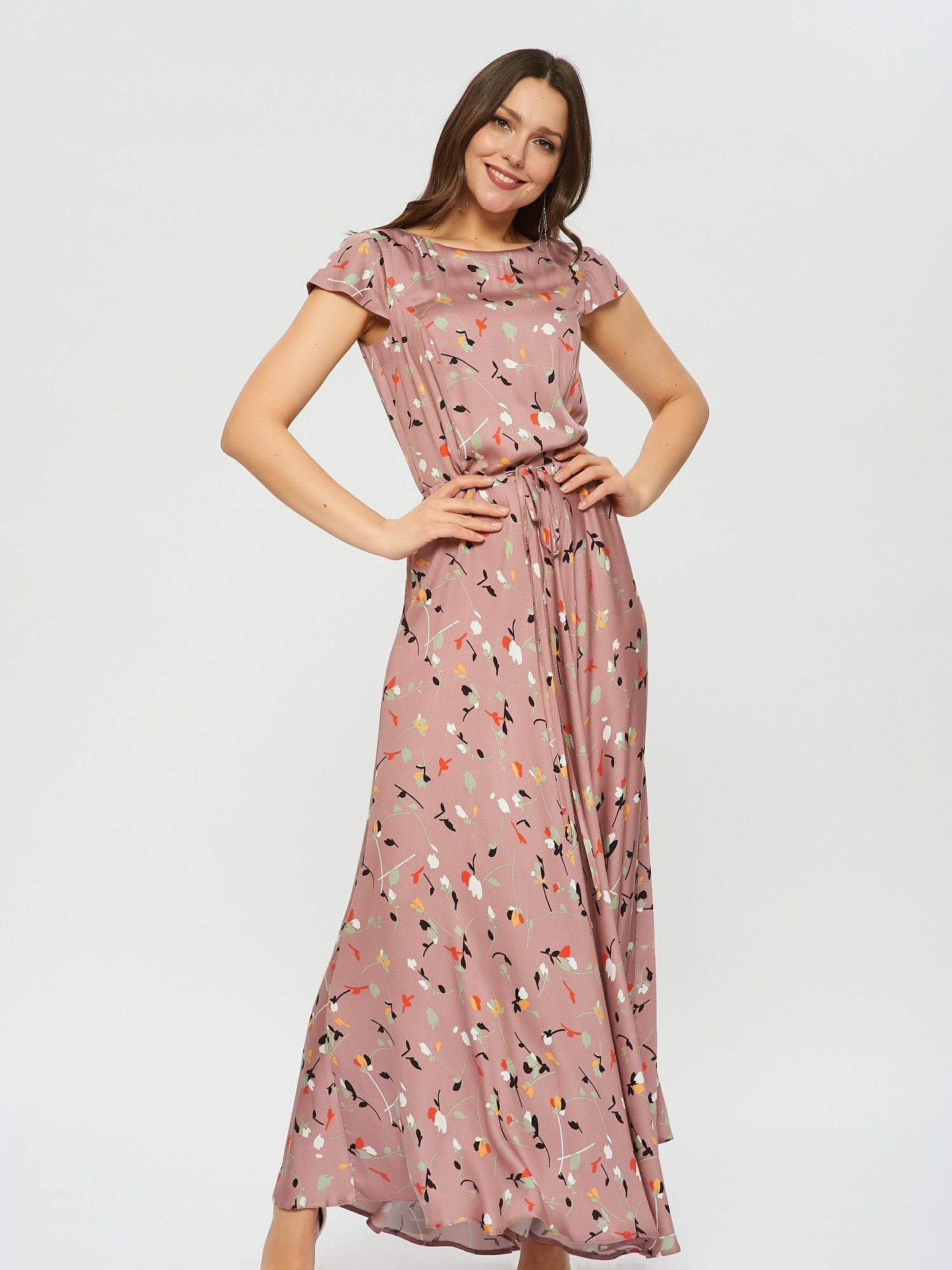 Нежное платье в цветочек оттенка цветущего миндаля. На талии расположена узкая кулиска , которая подчеркивает талию.