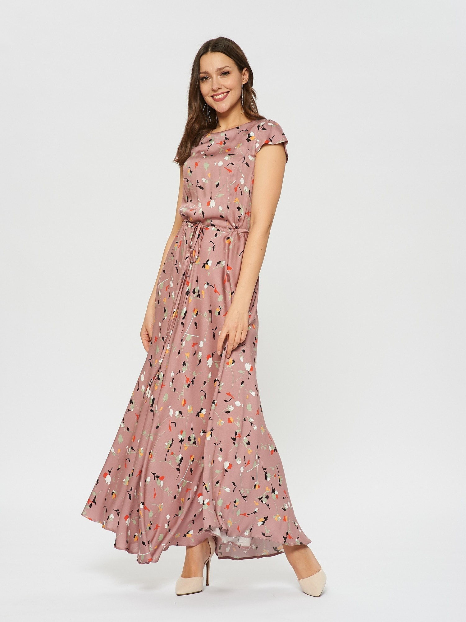 Нежное платье в цветочек оттенка цветущего миндаля. На талии расположена узкая кулиска , которая подчеркивает талию.