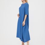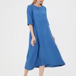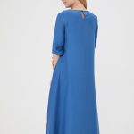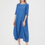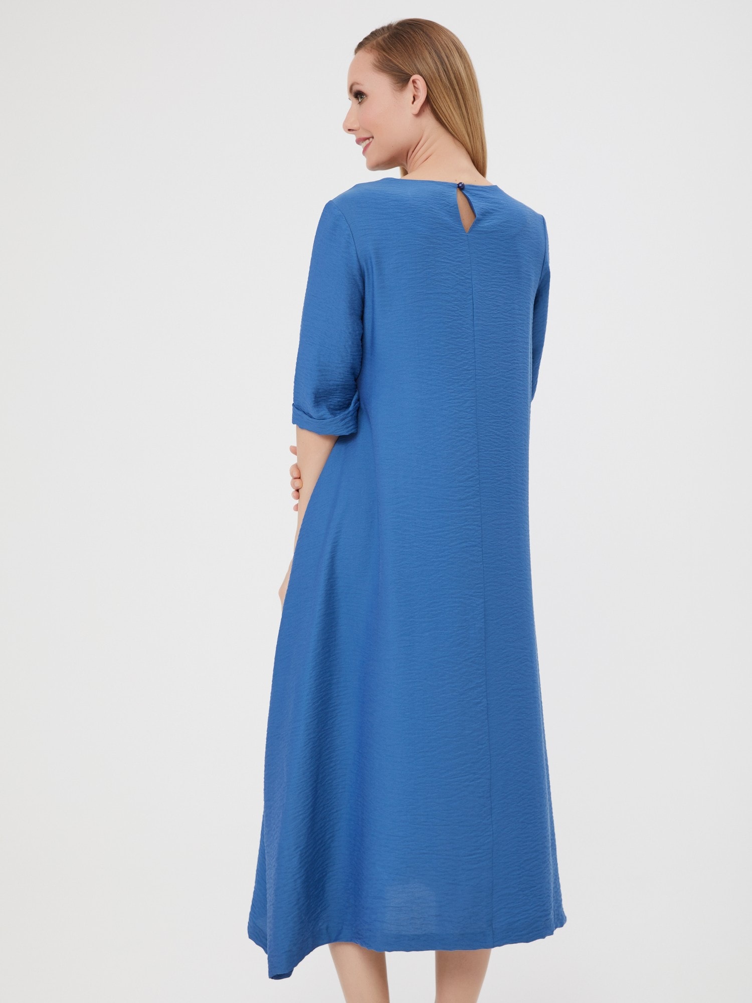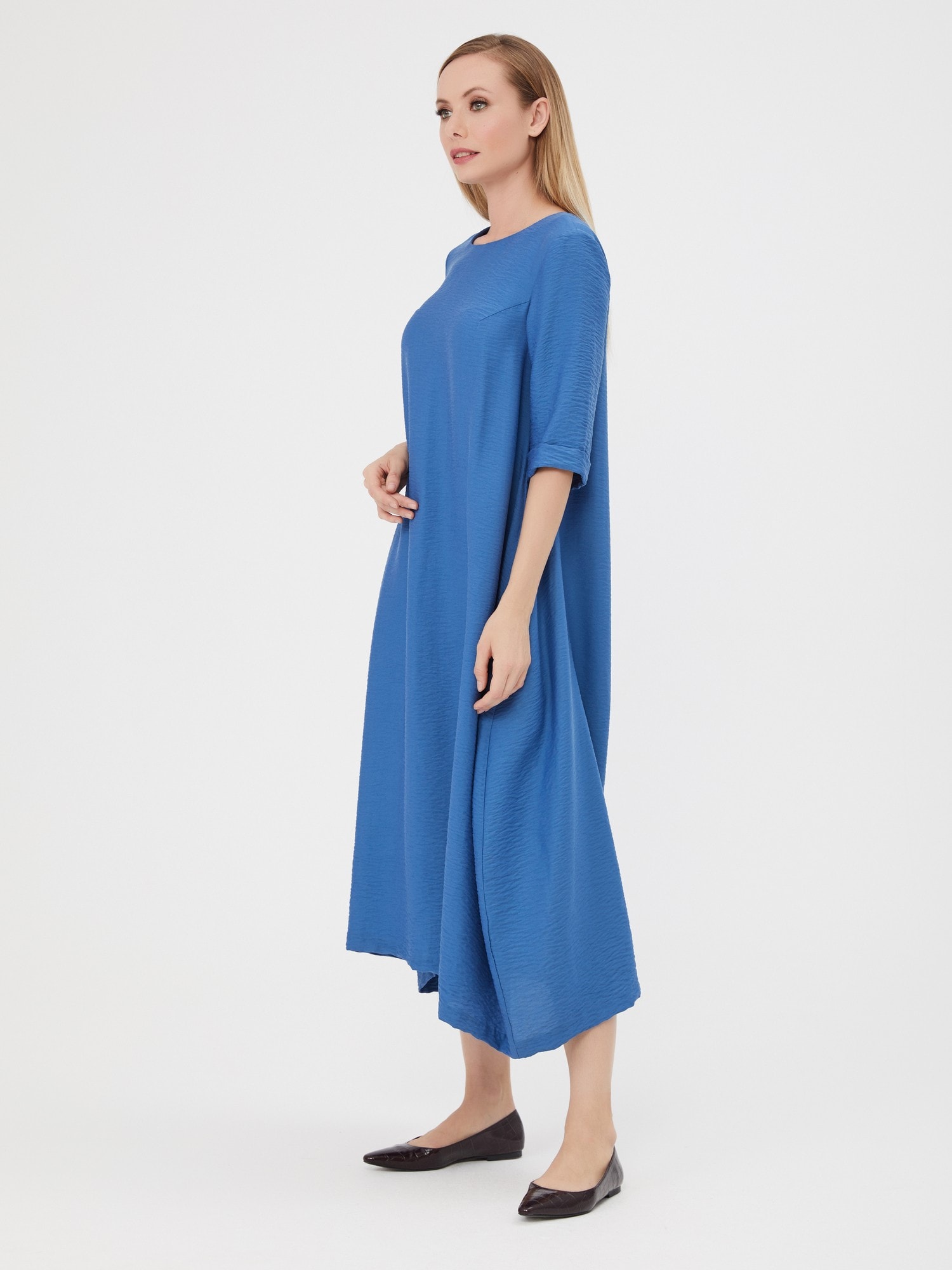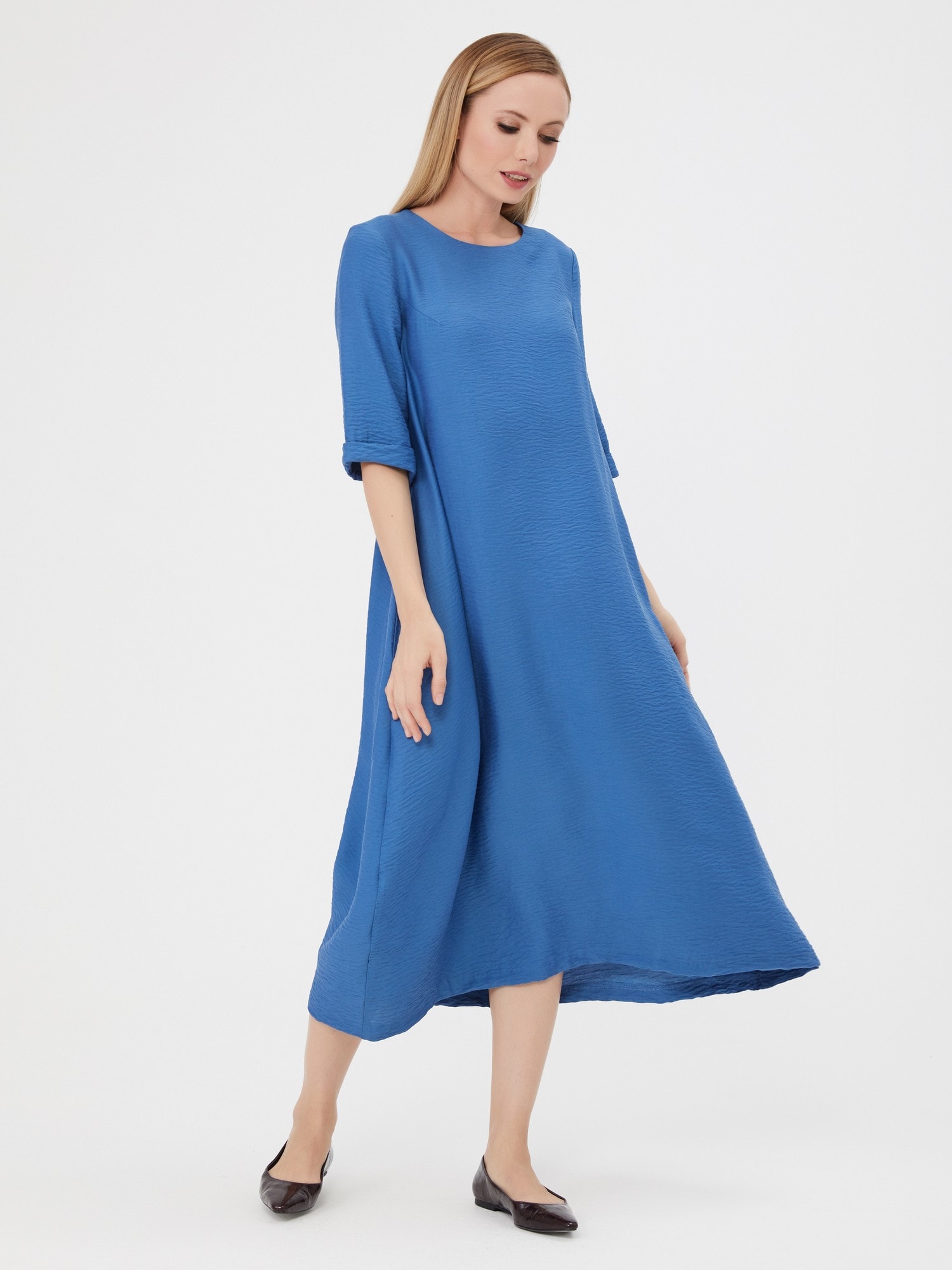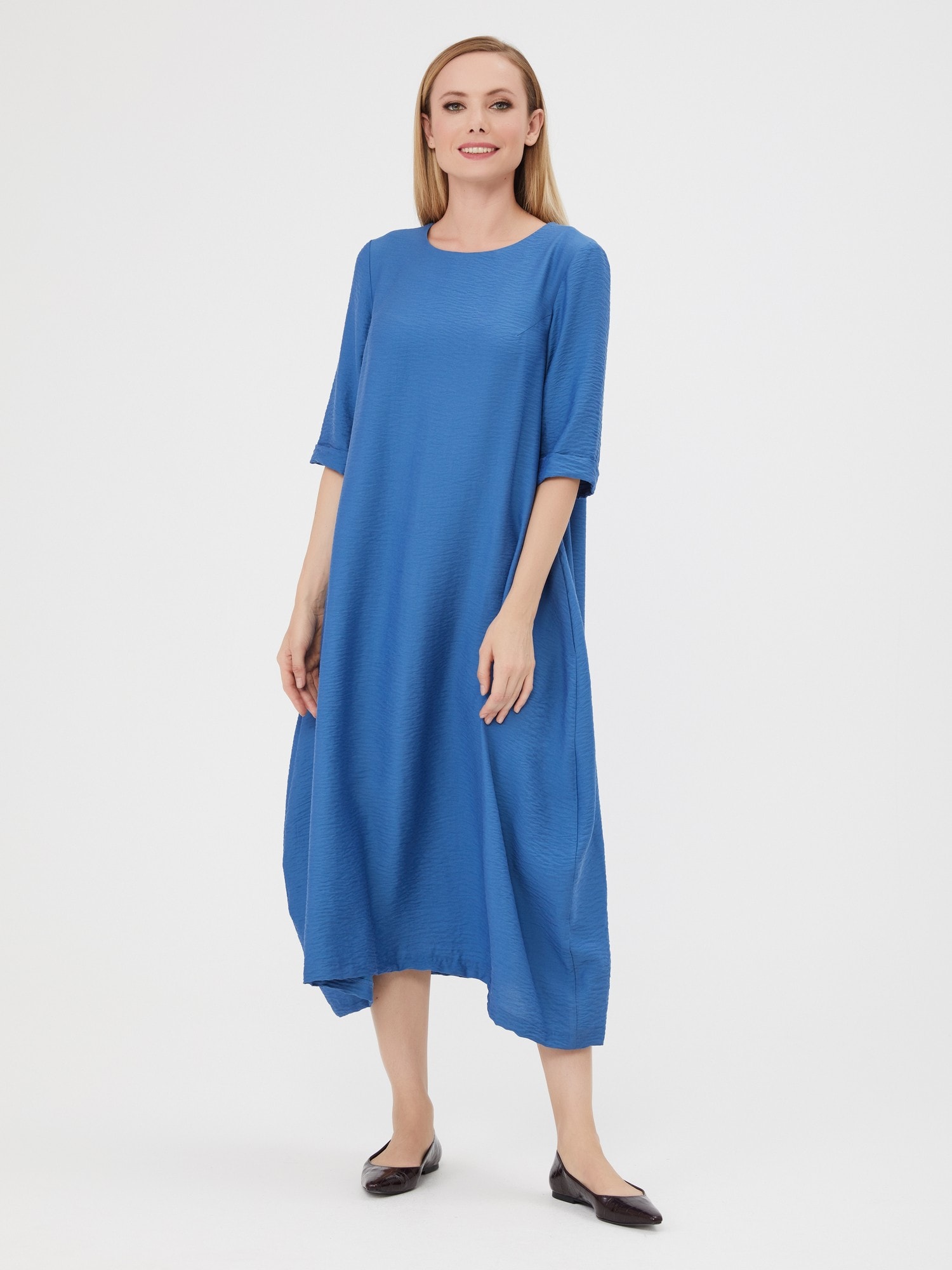 Яркое синее свободное платье. Объемный силуэт и насыщенный цвет задают настроение, на рукавах отвороты.