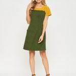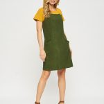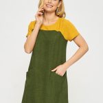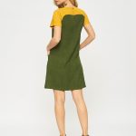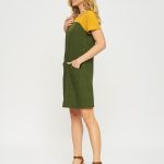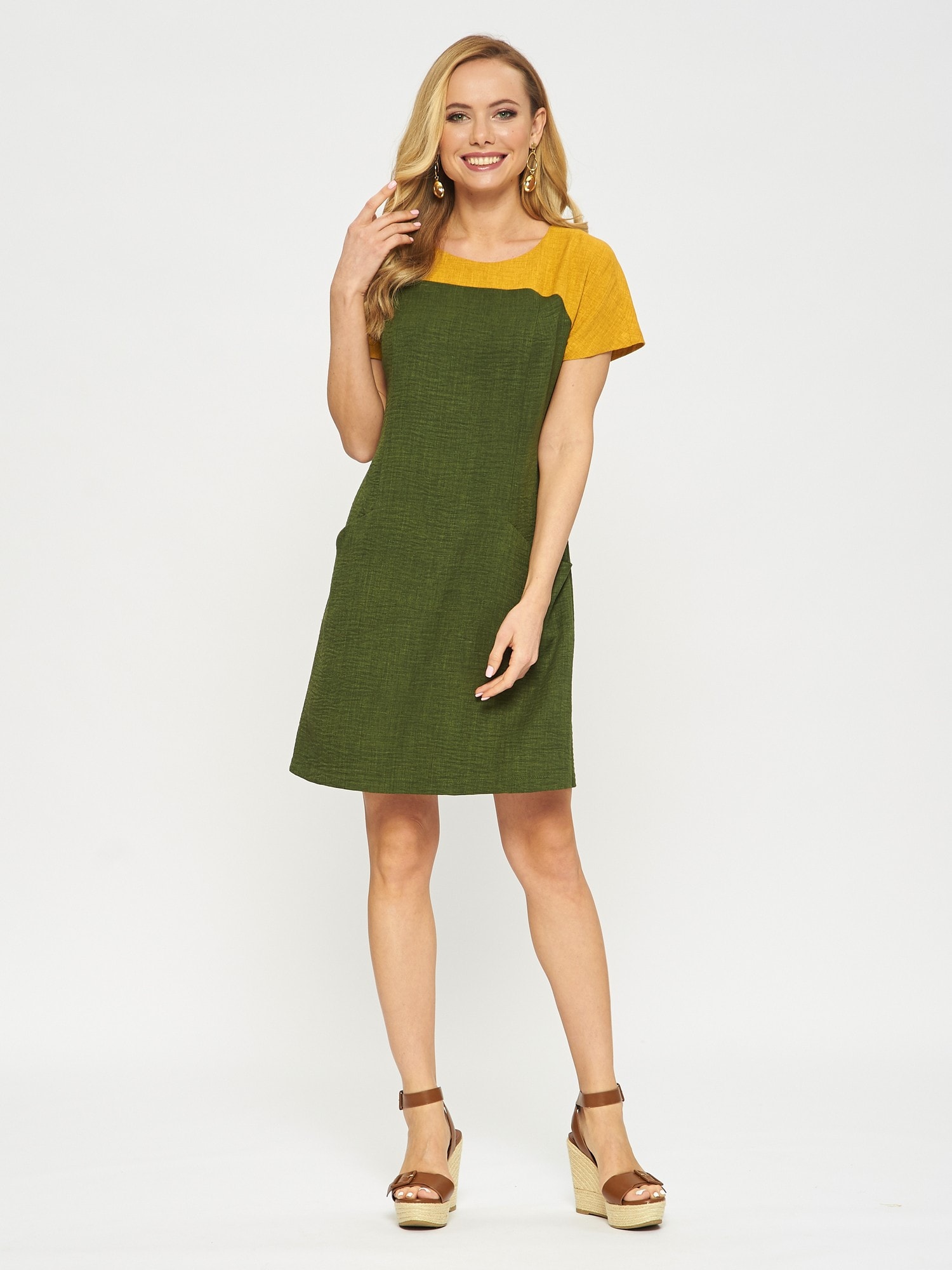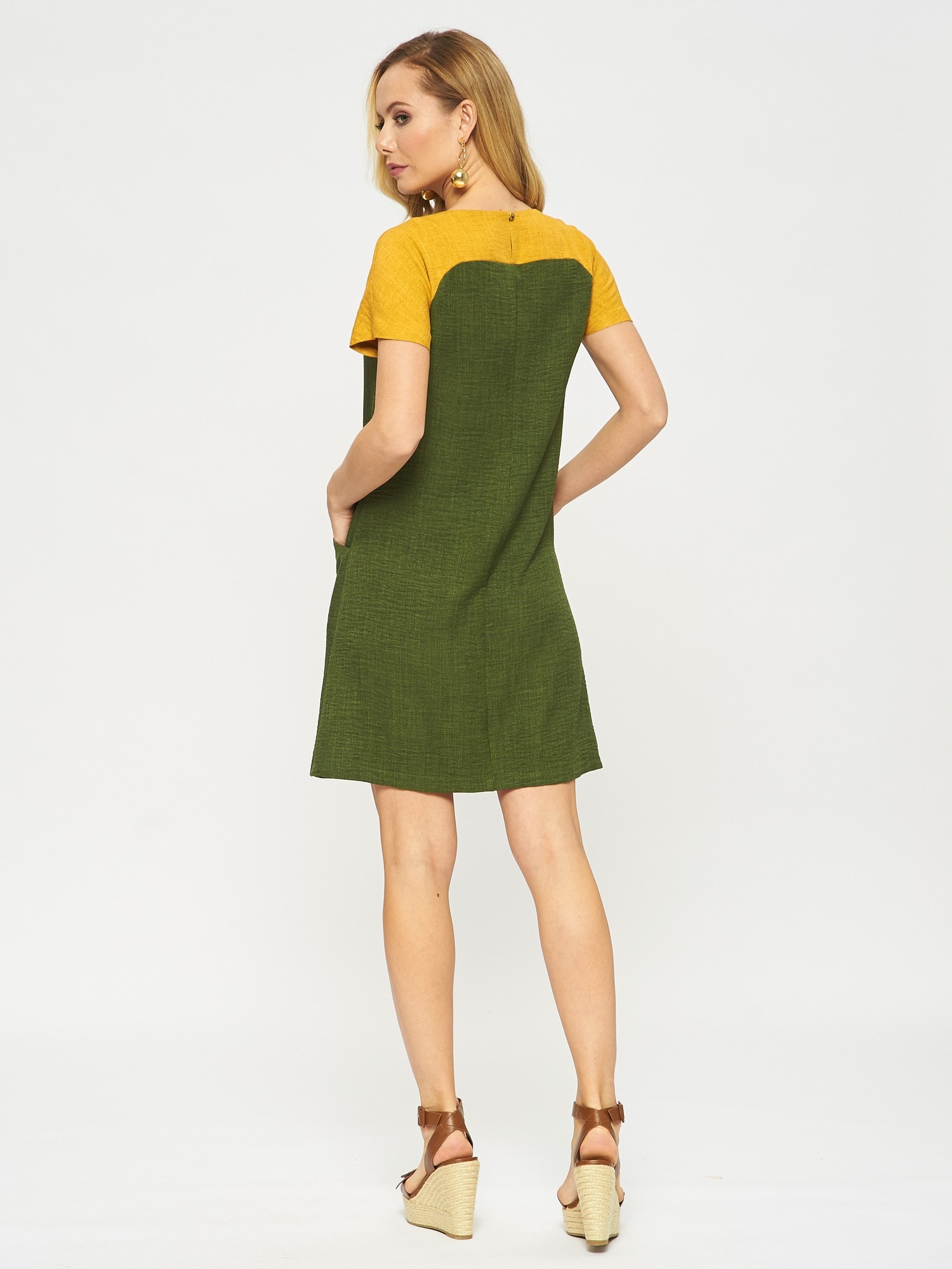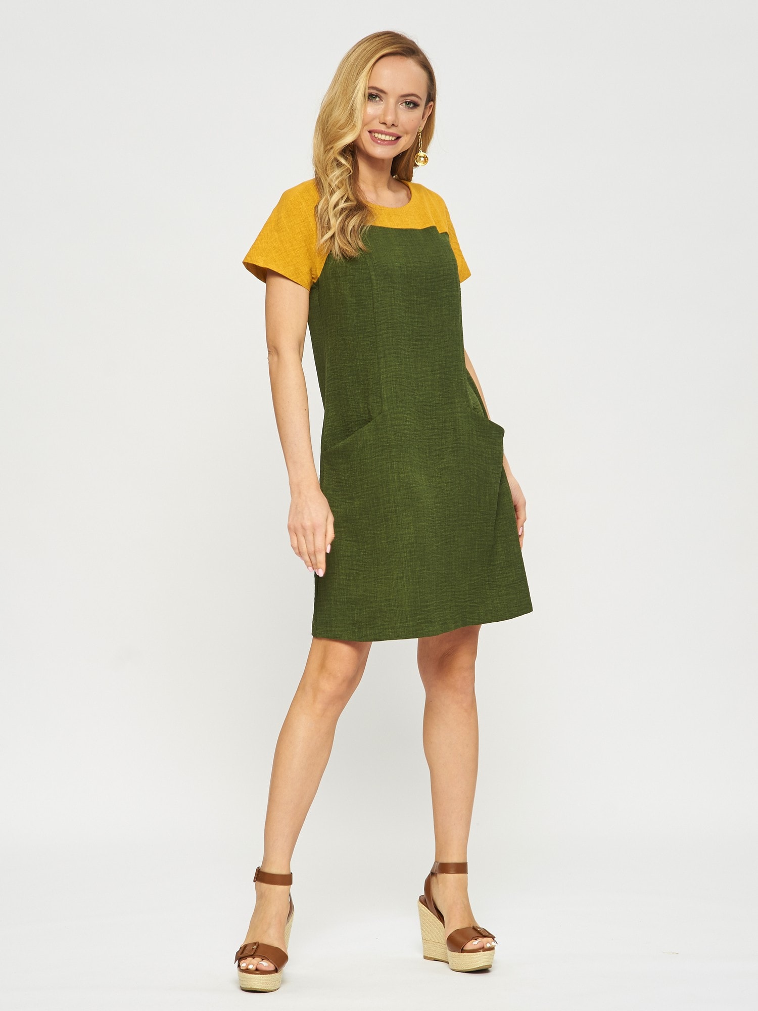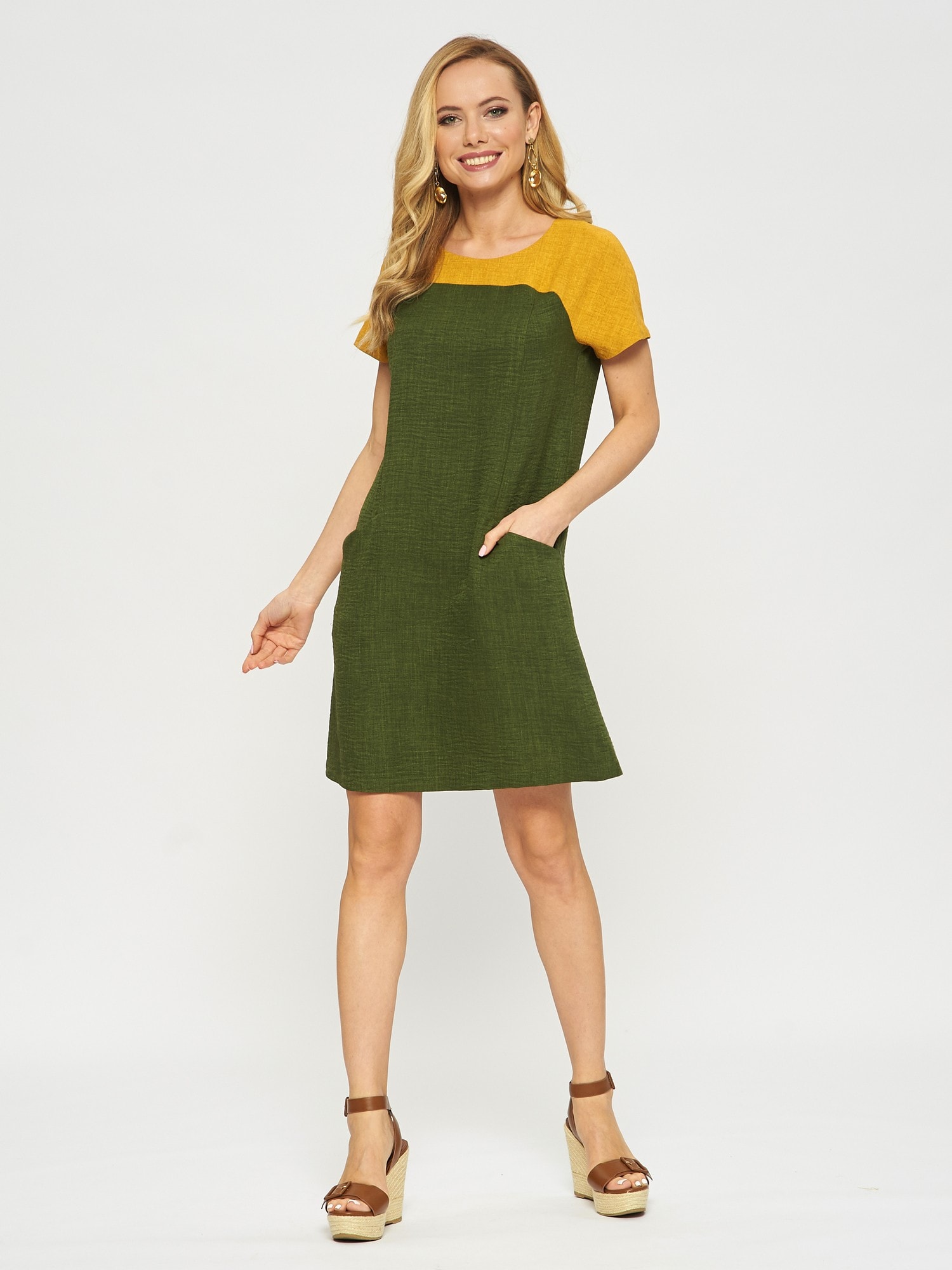 Короткое платье свободного силуэта с карманами, встроенными в конструктивные швы. Трендовый силуэт и интересное сочетание оттенков делают образ модным и ярким. Застежка на пуговицу на спинке.