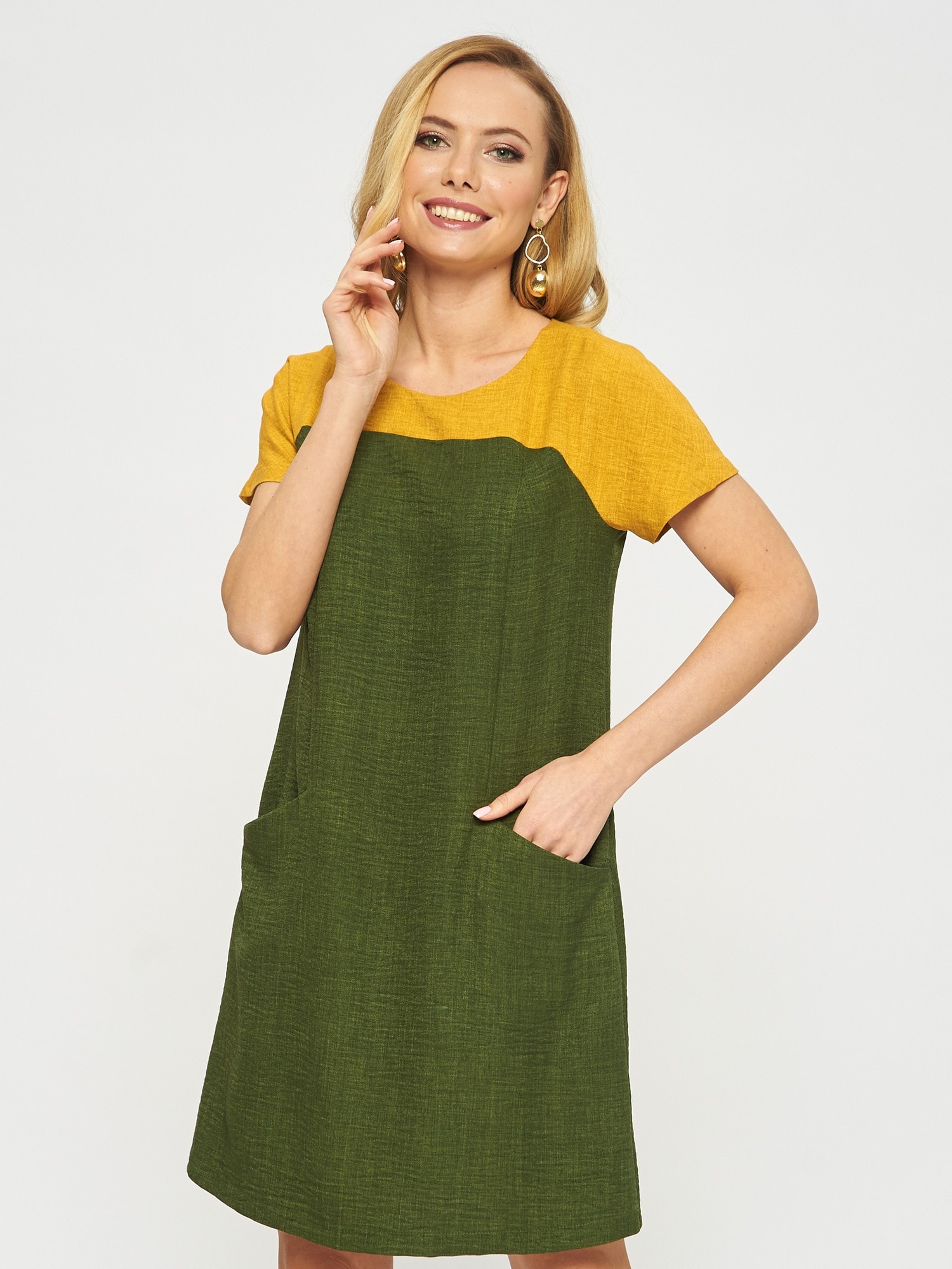 Короткое платье свободного силуэта с карманами, встроенными в конструктивные швы. Трендовый силуэт и интересное сочетание оттенков делают образ модным и ярким. Застежка на пуговицу на спинке.