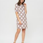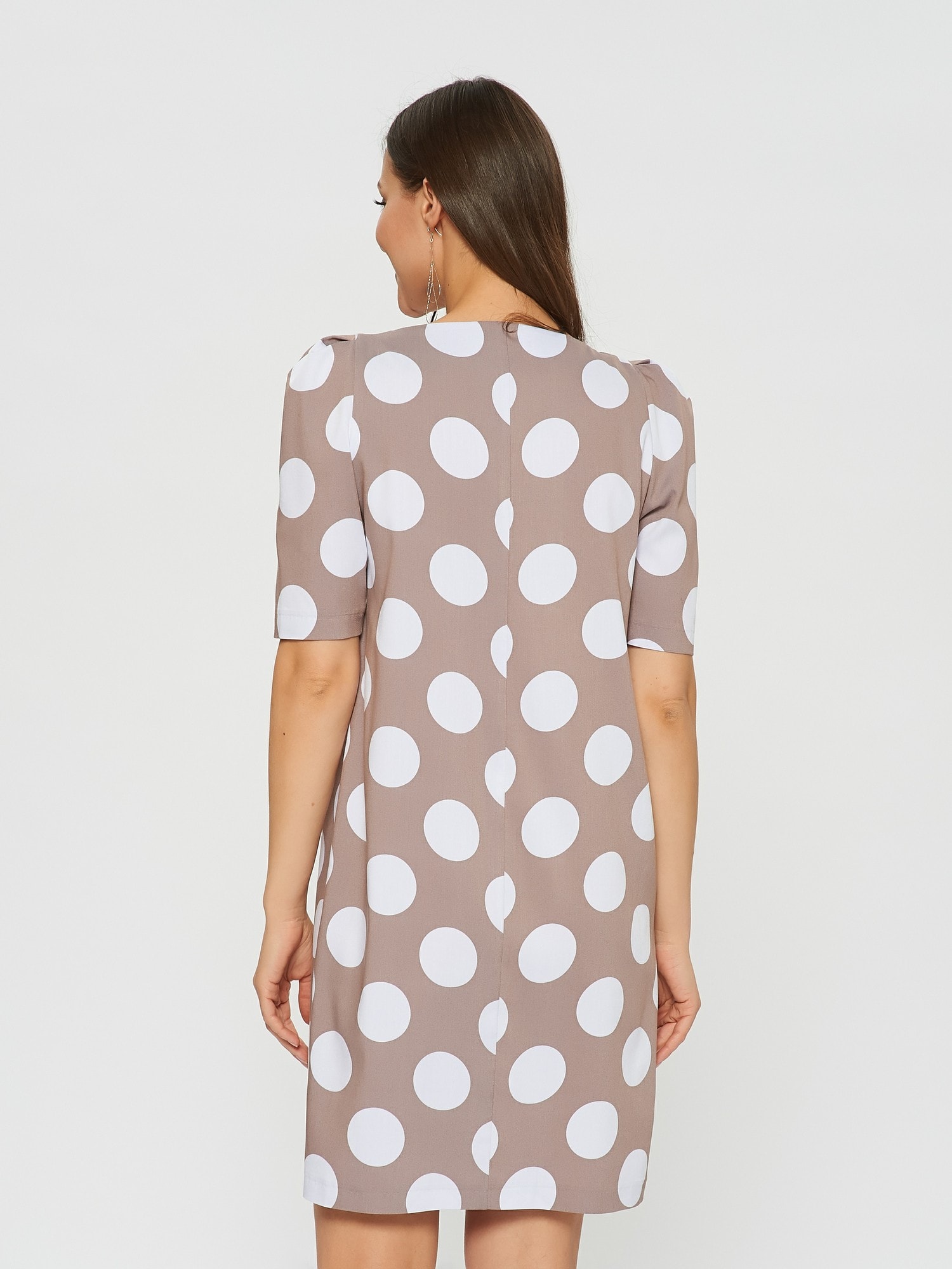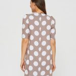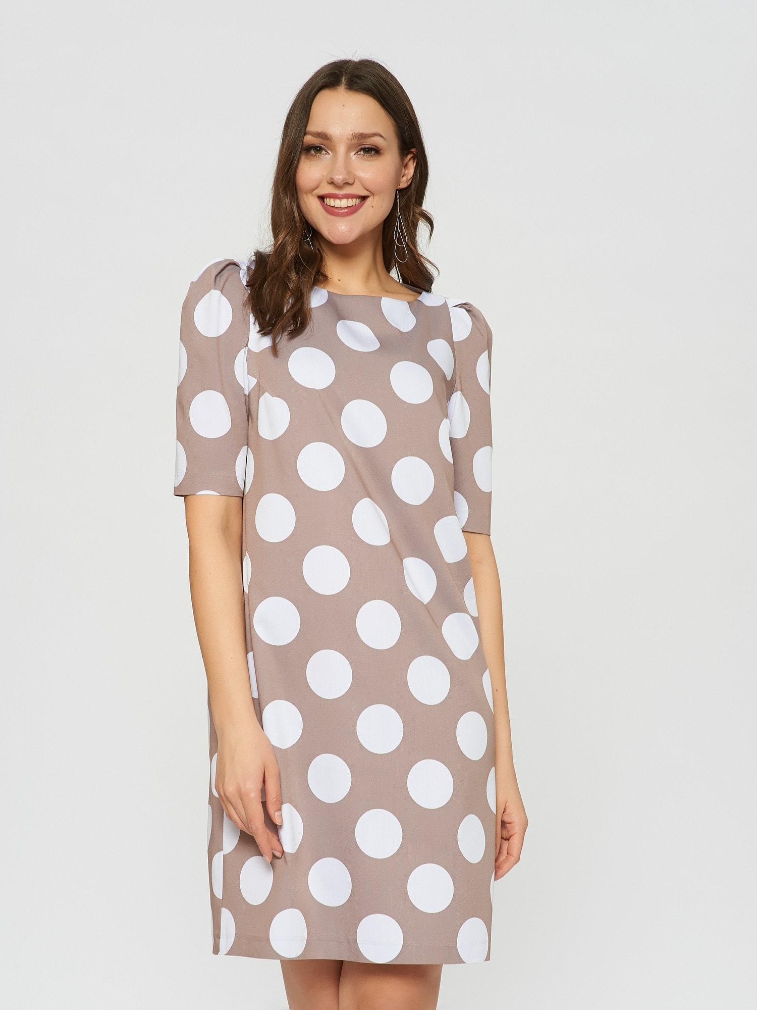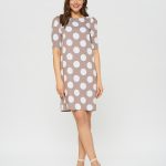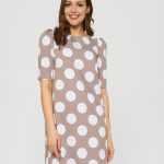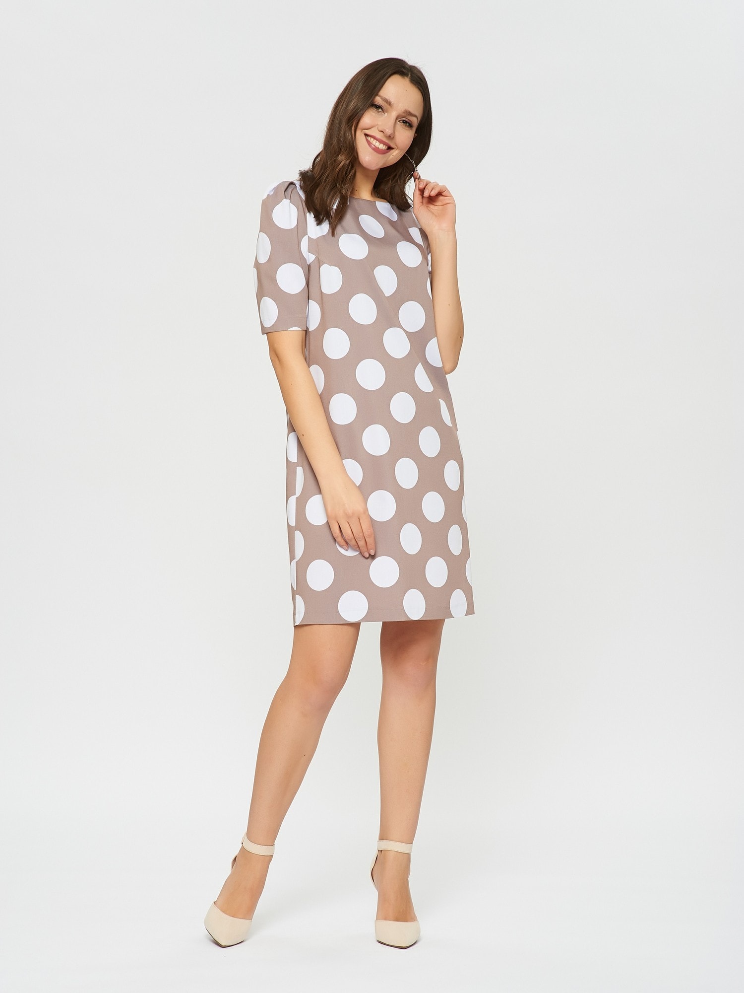 Платье кофейного цвета в принт горошек. Рукав по плечу немного приподнят и собран в складочки, что придает еще большего эффекта ретро. Длина до колена и прямой крой делают это платье идеальным для летних дней в офисе.