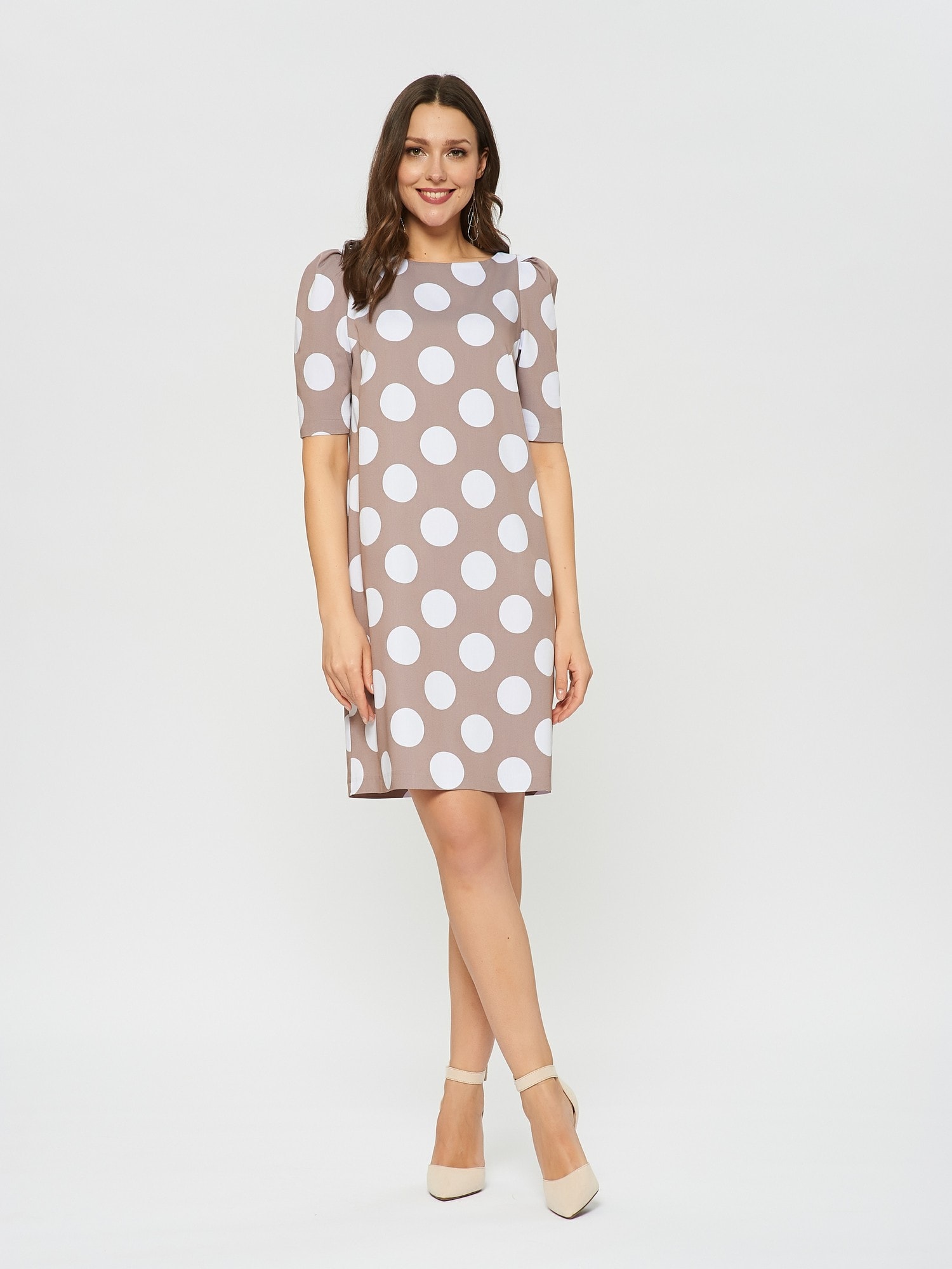 Платье кофейного цвета в принт горошек. Рукав по плечу немного приподнят и собран в складочки, что придает еще большего эффекта ретро. Длина до колена и прямой крой делают это платье идеальным для летних дней в офисе.