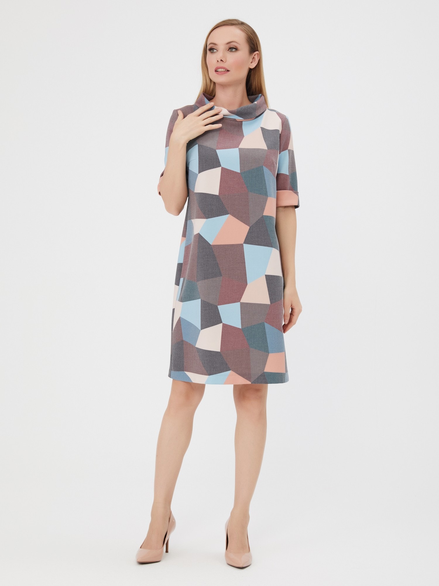 Элегантное платье с отложным воротником-хомутом. Приглушенные оттенки абстрактного принта в сочетании с лаконичной формой делают платье идеальным на каждый день. Изготовлено из приятной, комфортной ткани.