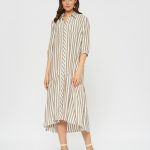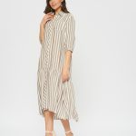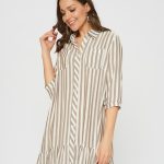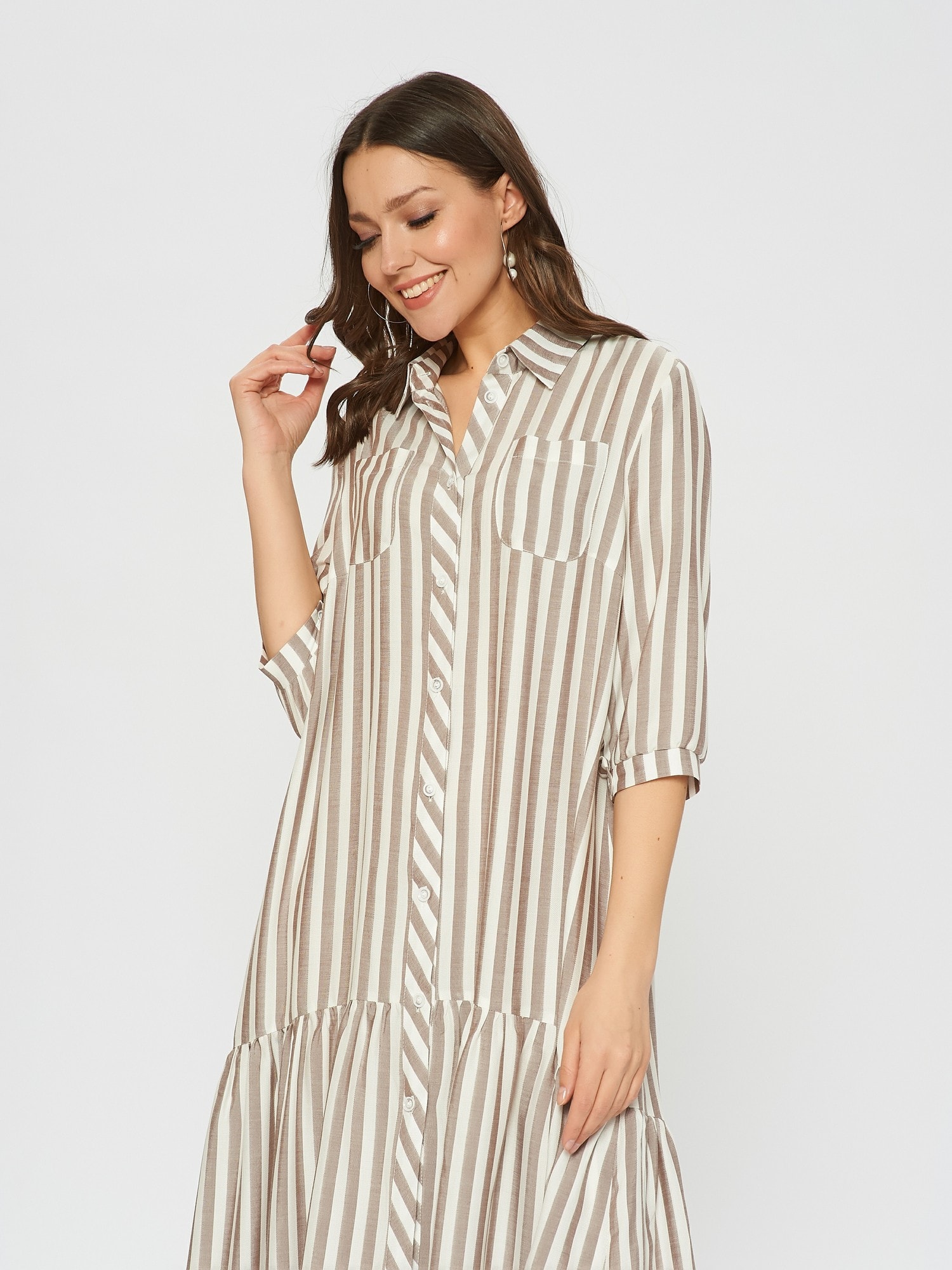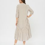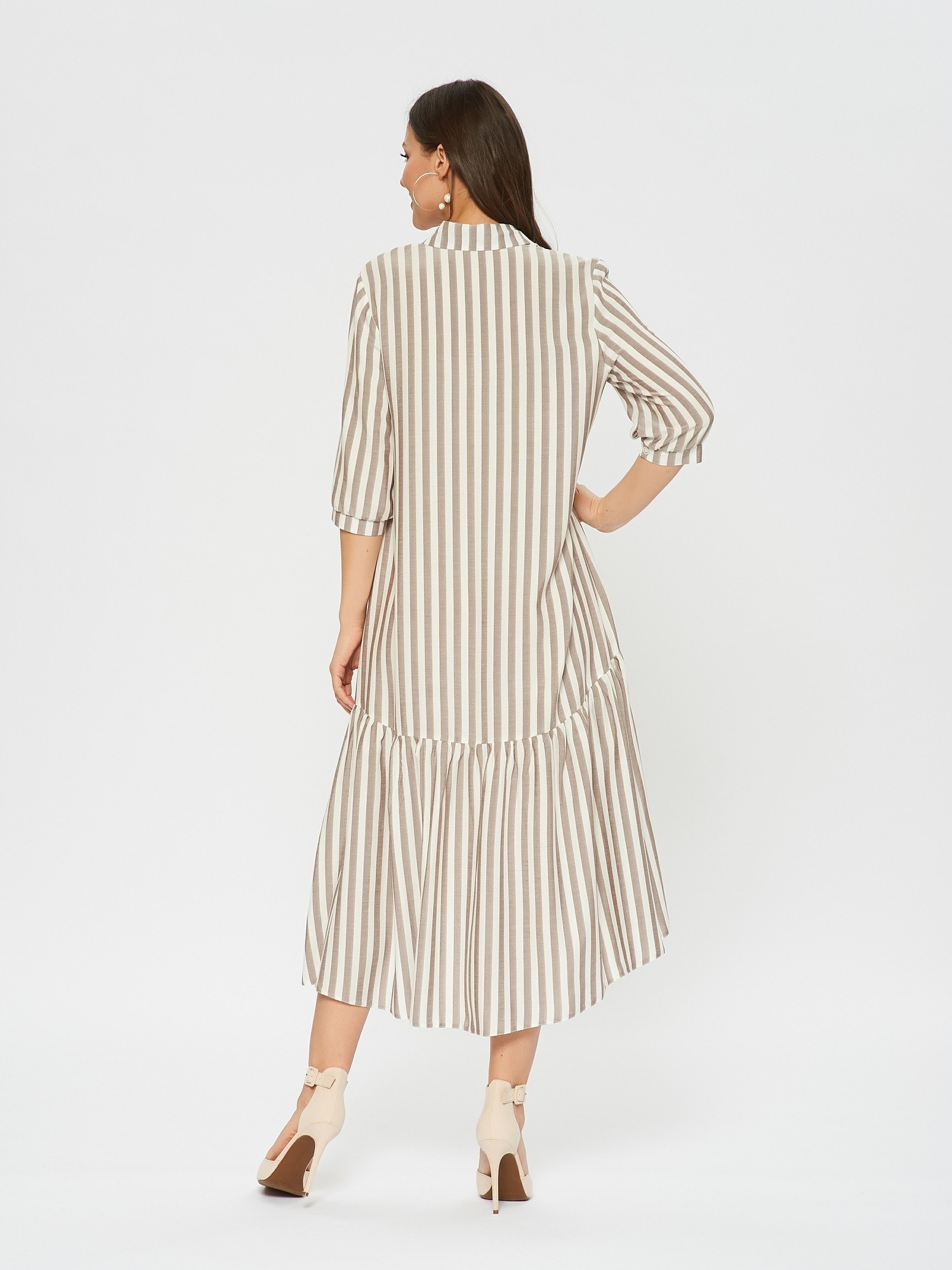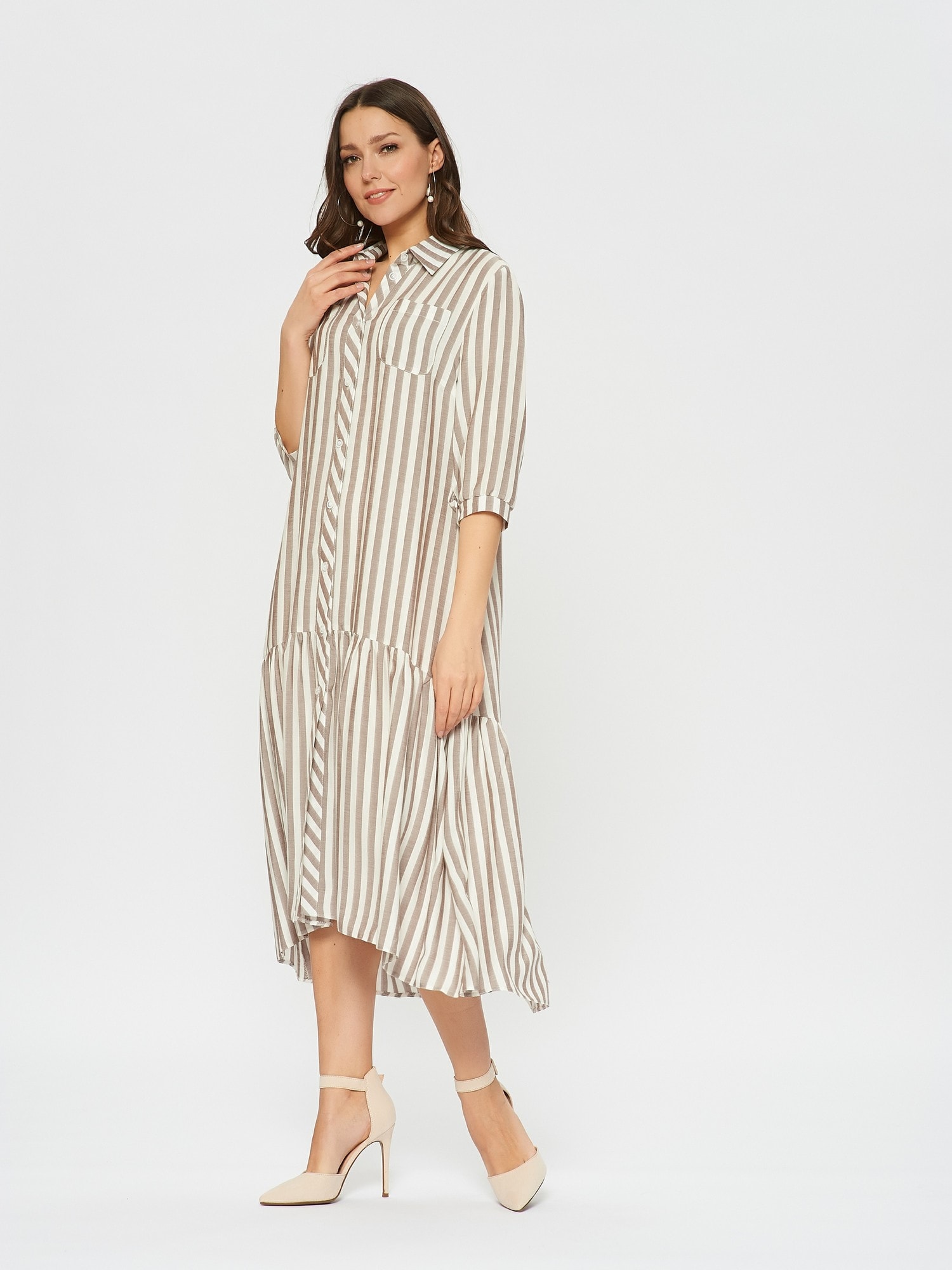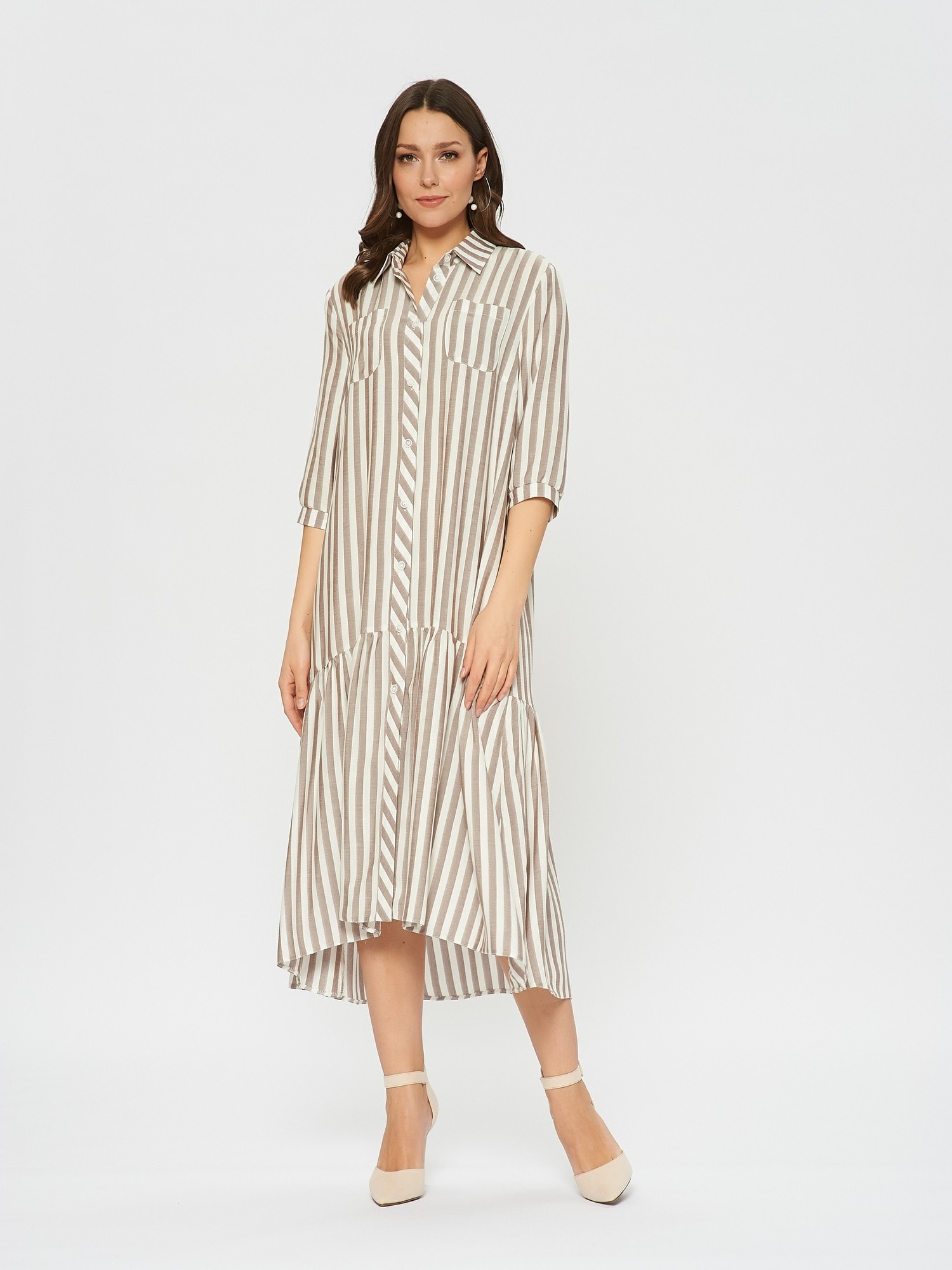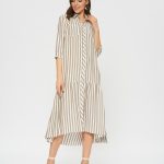 Платье-рубашка свободного кроя в полоску. По низу платья оформлен волан с удлинением по спинке. Отложной воротник, накладные карманы на груди.