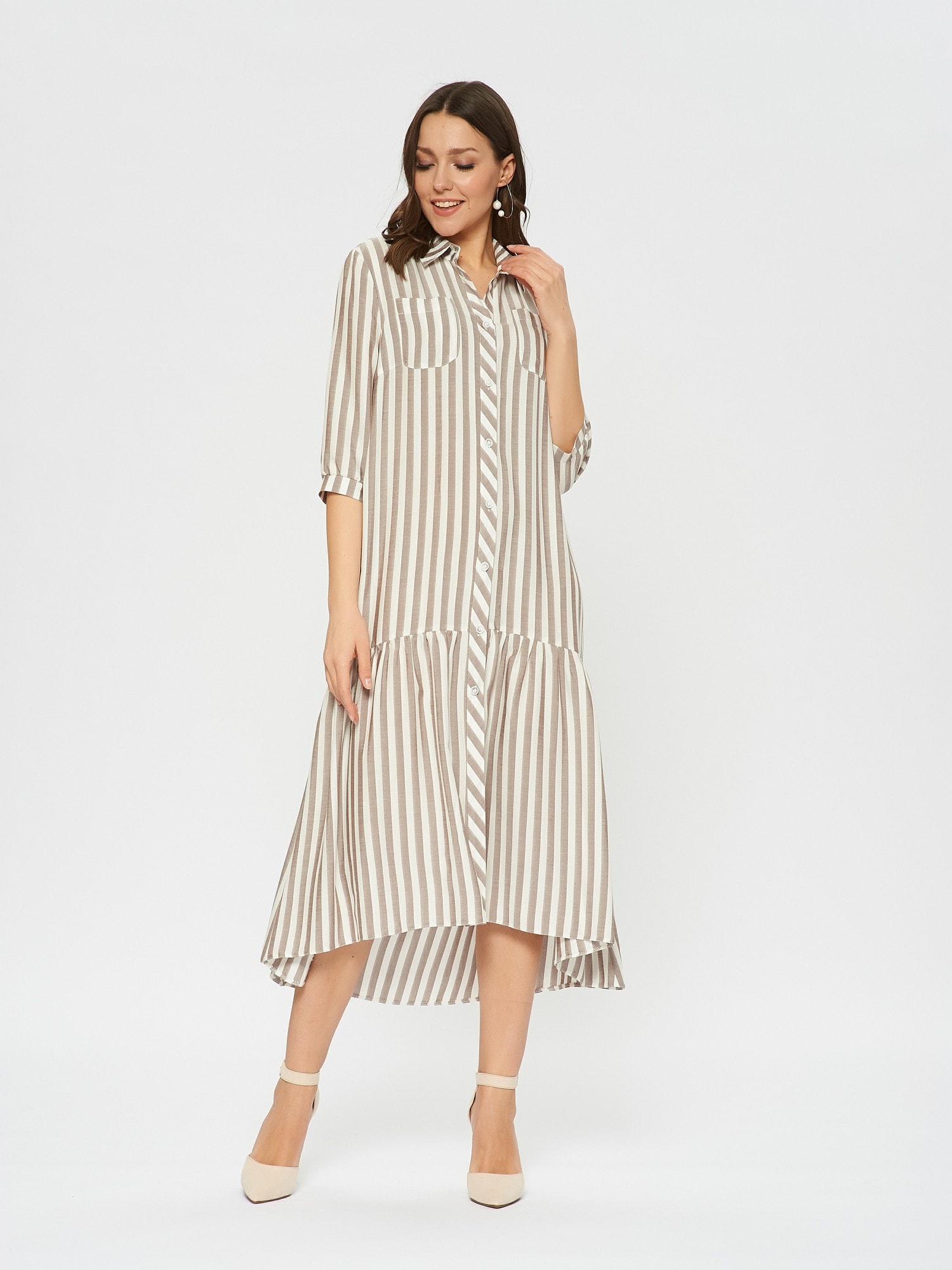 Платье-рубашка свободного кроя в полоску. По низу платья оформлен волан с удлинением по спинке. Отложной воротник, накладные карманы на груди.