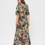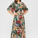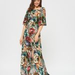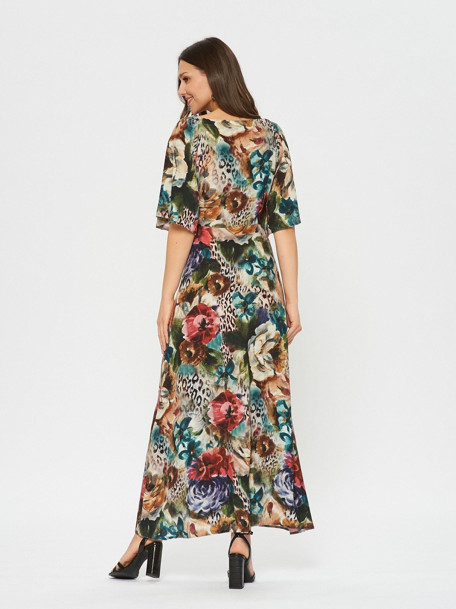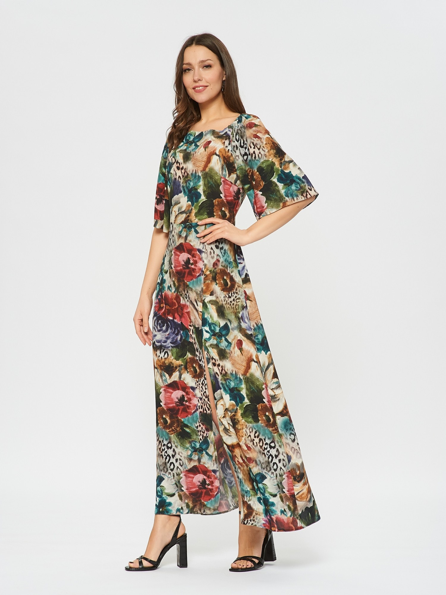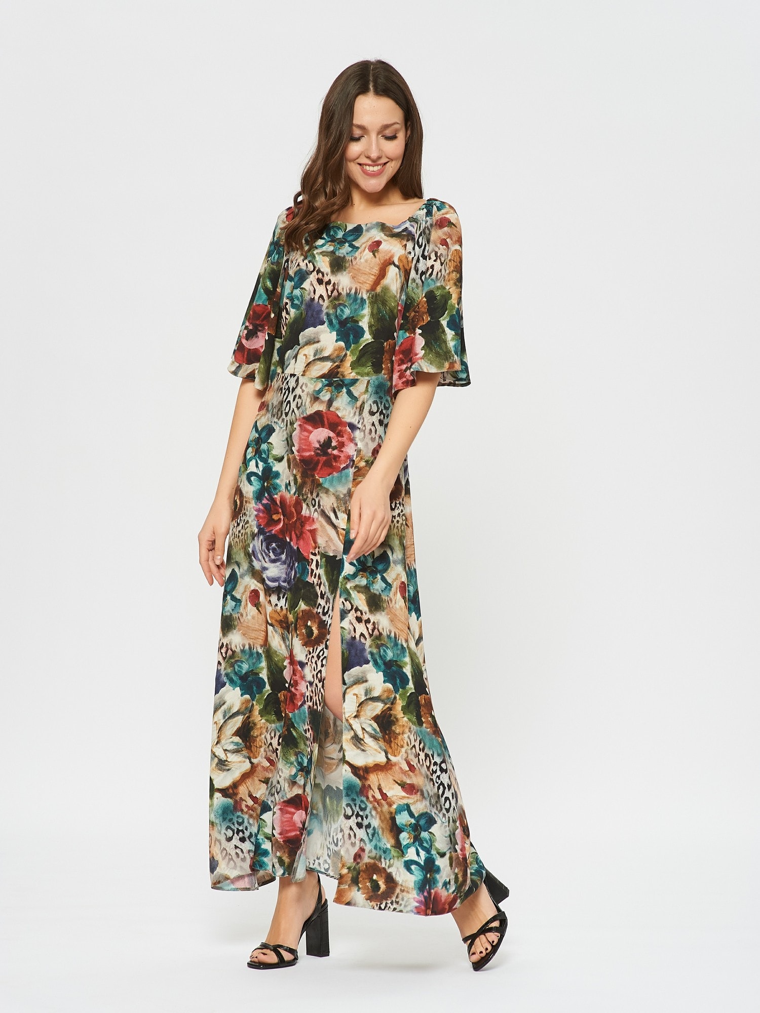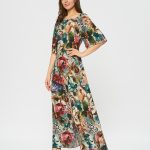 Платье расслабленного силуэта с резинкой на линии плеч, с помощью которой его можно носить как с закрытыми, так и оголенными плечами. Широкий рукав, высокий разрез на бедре. Принт платья отражает тенденцию на смешение и микс принтов: в нем сочетаются анималистичные и цветочные мотивы