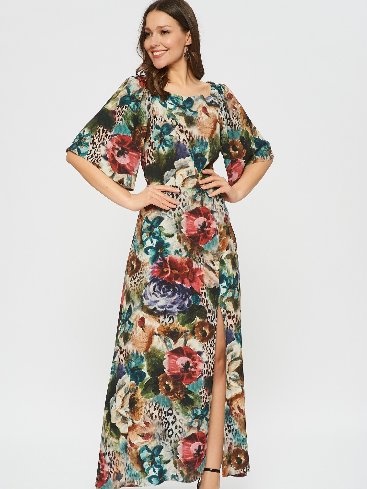 Платье расслабленного силуэта с резинкой на линии плеч, с помощью которой его можно носить как с закрытыми, так и оголенными плечами. Широкий рукав, высокий разрез на бедре. Принт платья отражает тенденцию на смешение и микс принтов: в нем сочетаются анималистичные и цветочные мотивы
