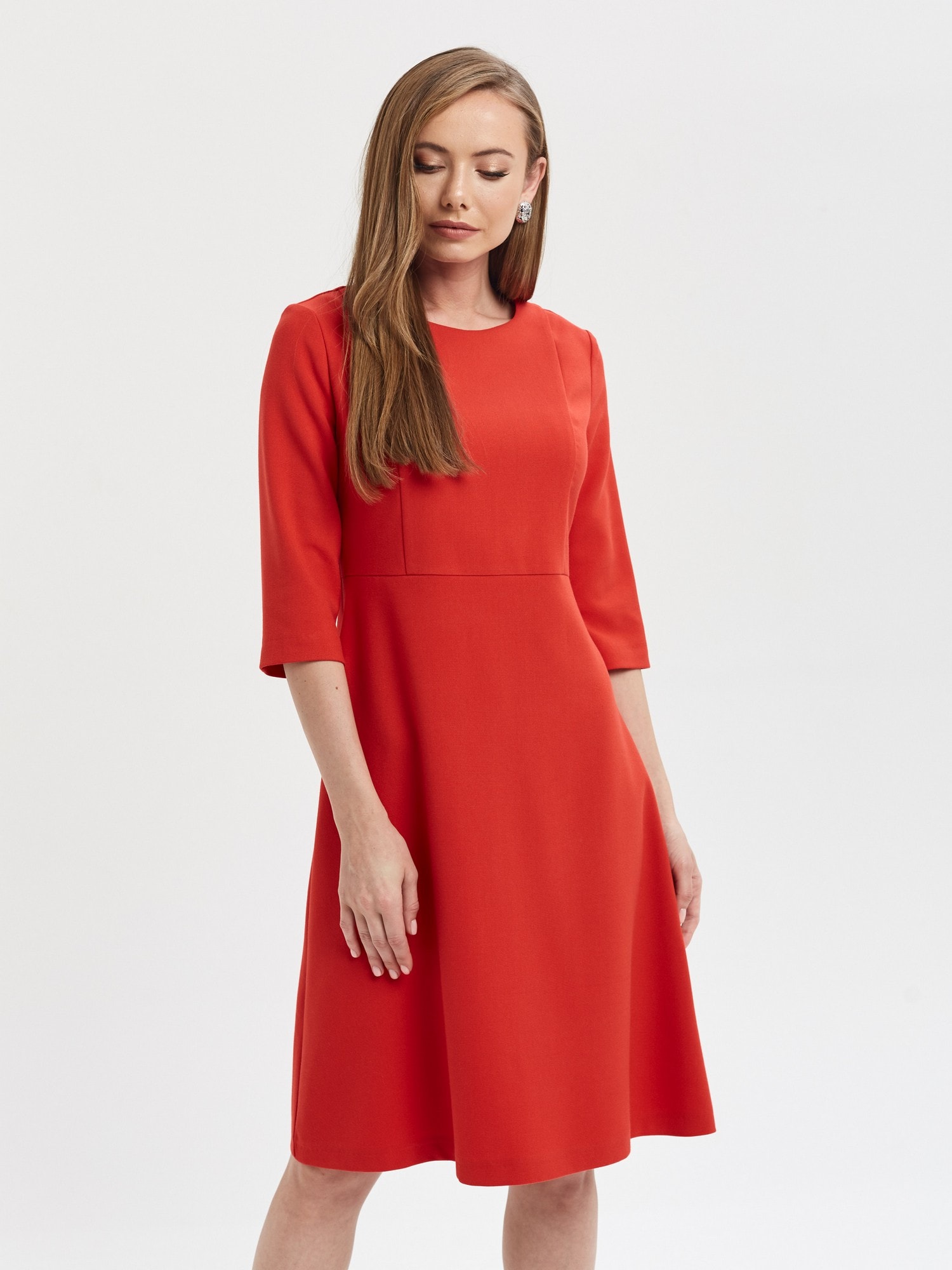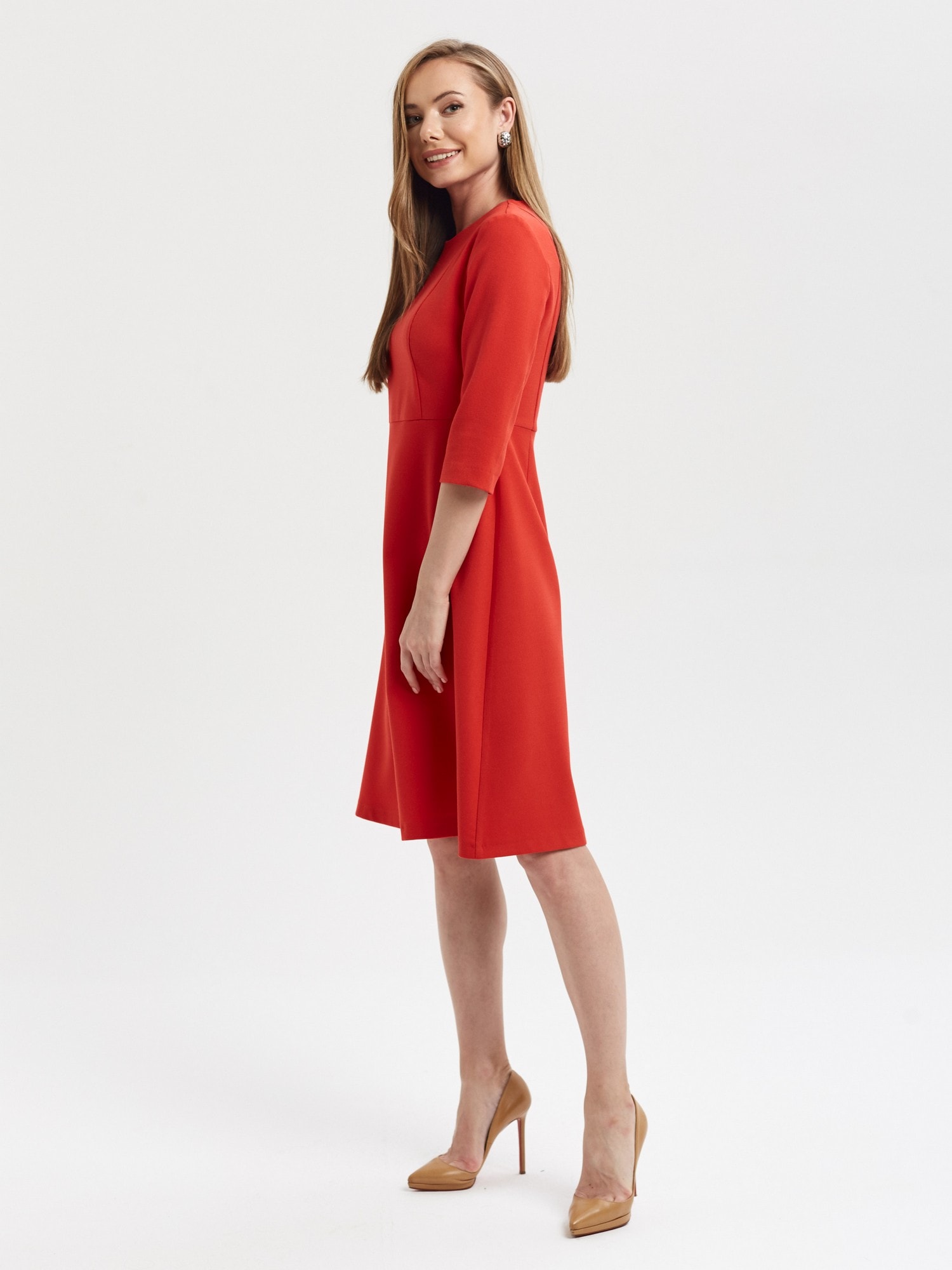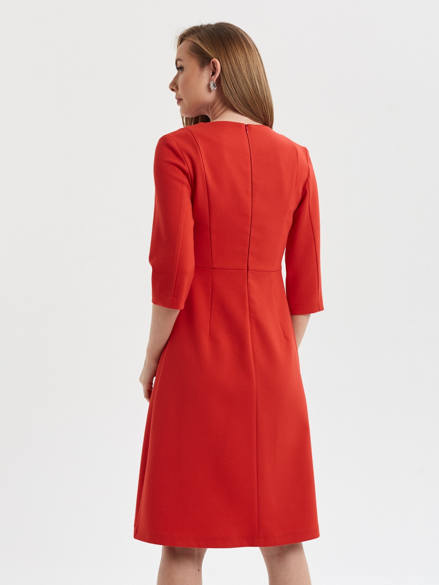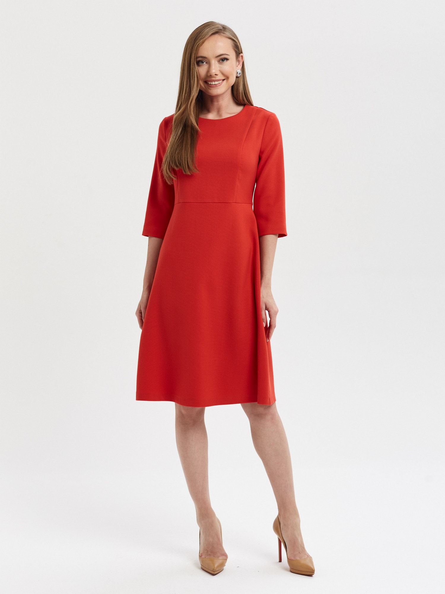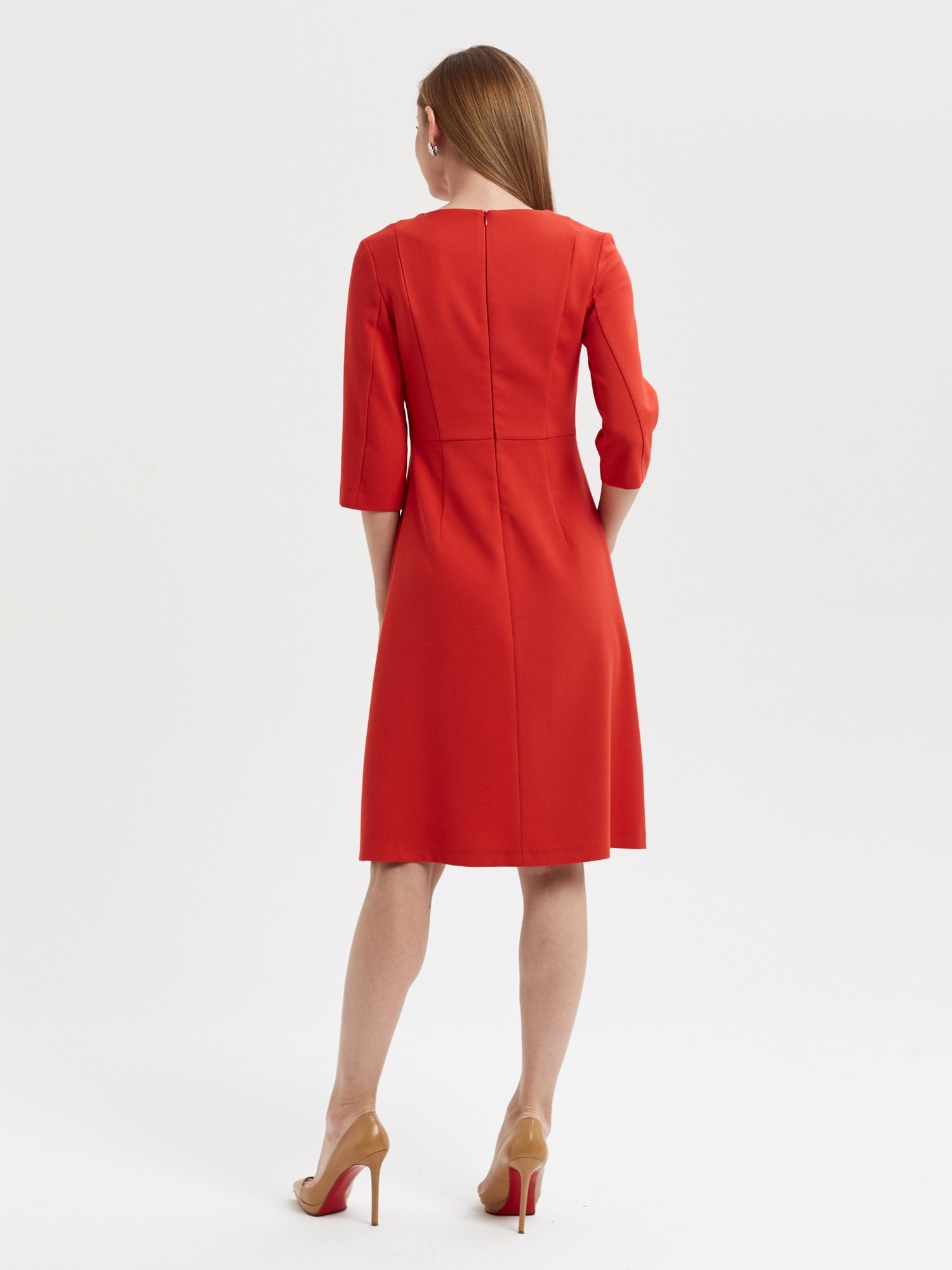 64% вискоза, 34% полиэстер, 2% эластан Размеры 42-50 Рост модели 178 см Яркое платье насыщенного алого цвета. Отрезное по талии, рукав 3/4, застежка на потайую молнию на спинке. Безупречно сядет на любую фигуру.