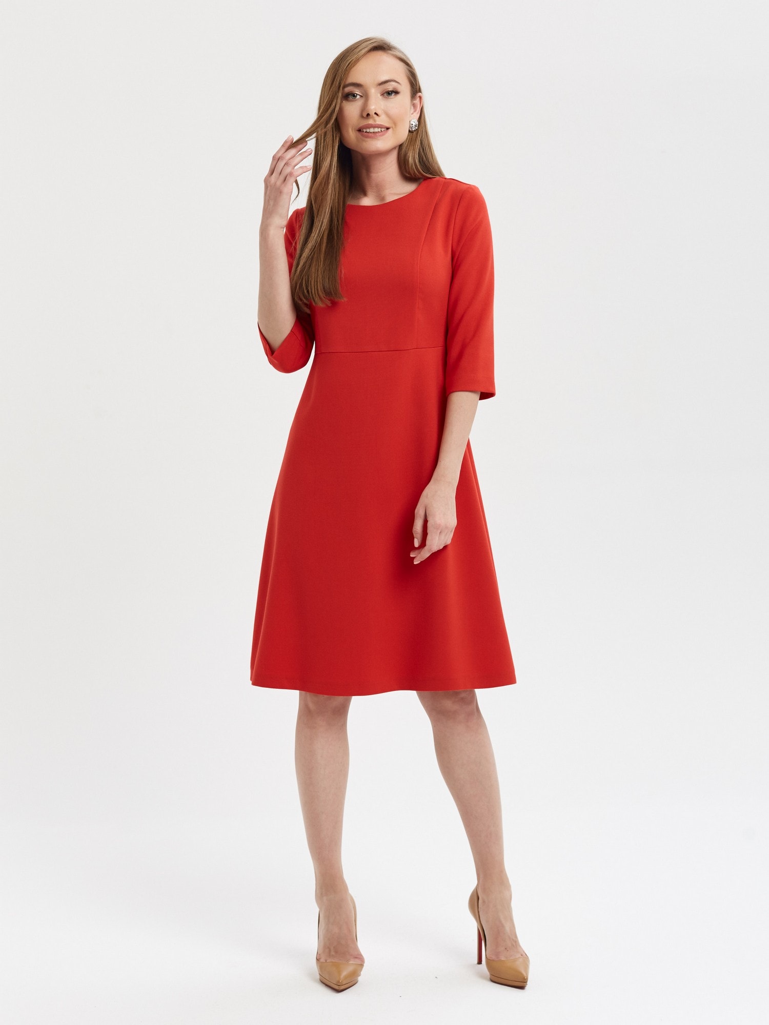 64% вискоза, 34% полиэстер, 2% эластан Размеры 42-50 Рост модели 178 см Яркое платье насыщенного алого цвета. Отрезное по талии, рукав 3/4, застежка на потайую молнию на спинке. Безупречно сядет на любую фигуру.
