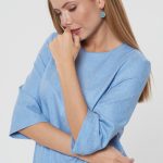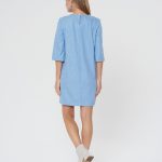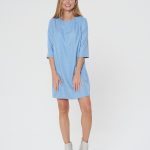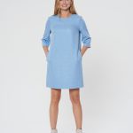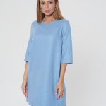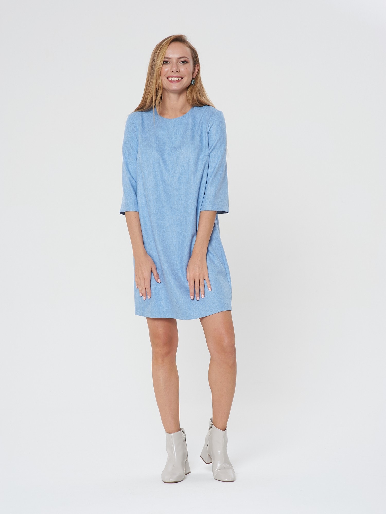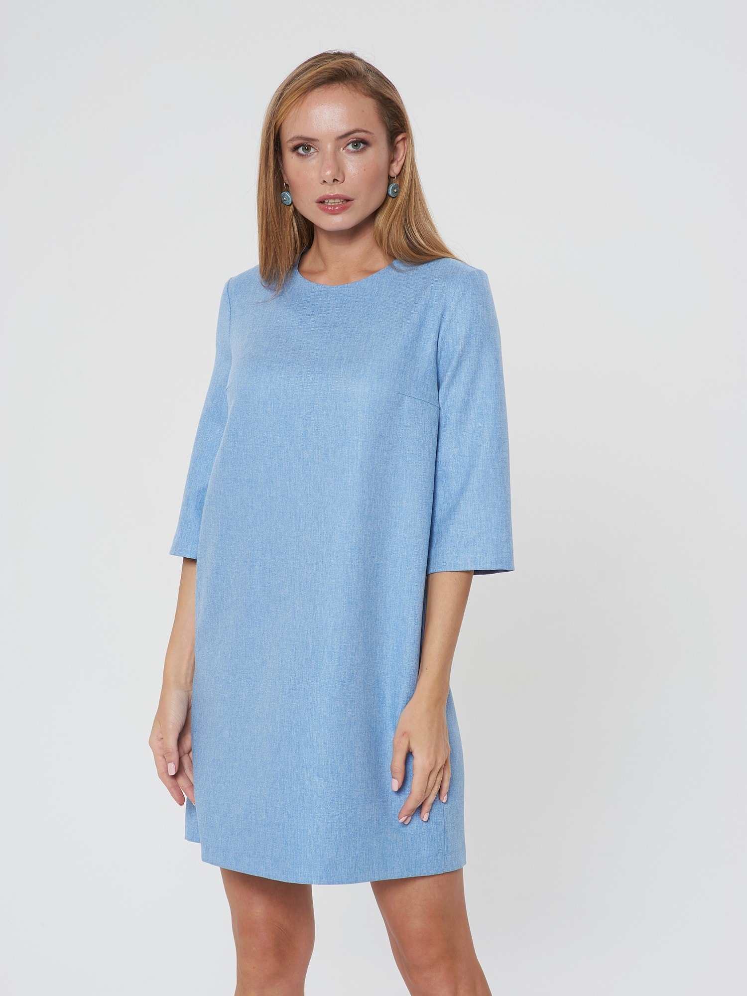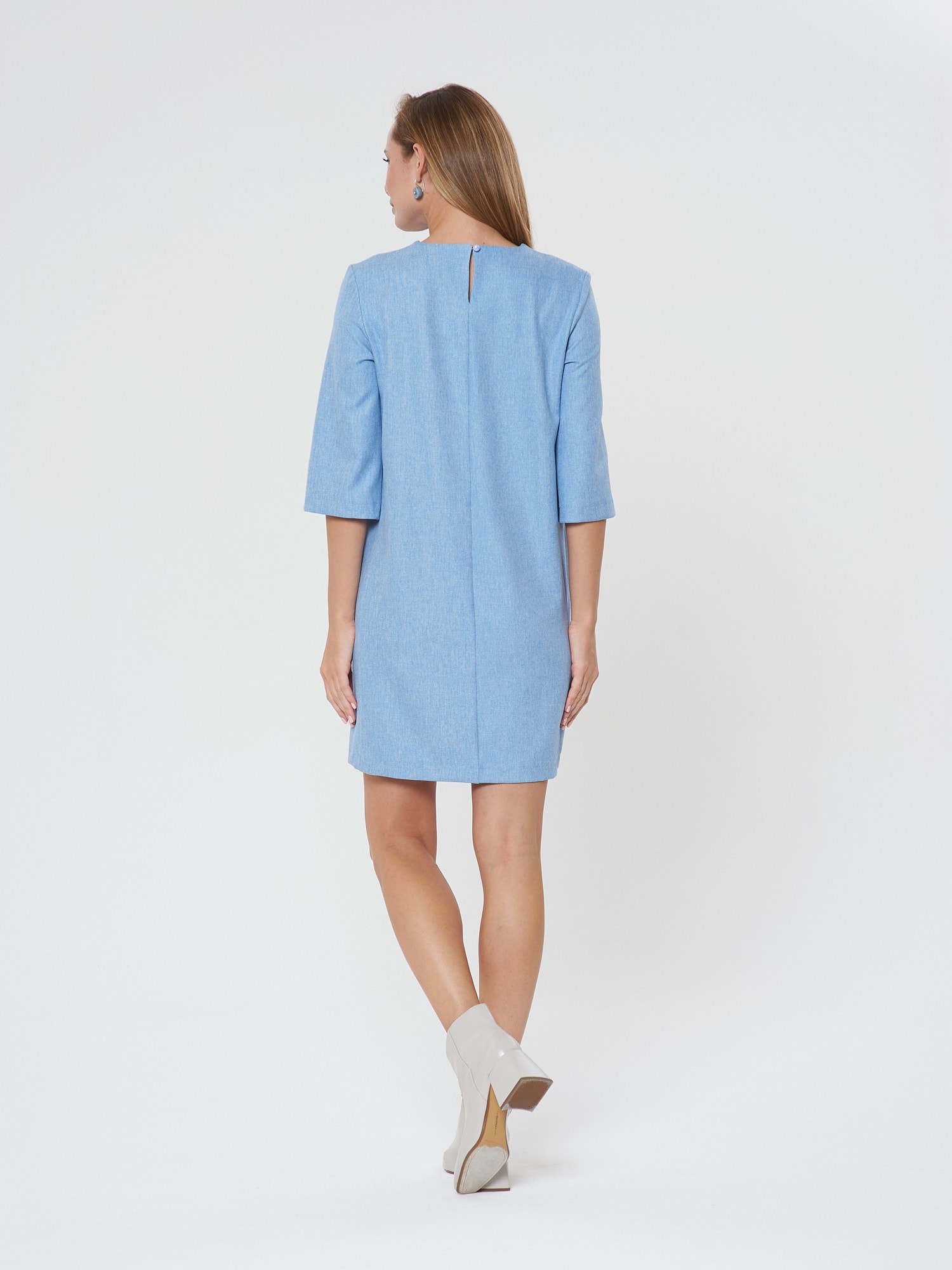 Платье лазурного цвета прямого силуэта. Рукава 3/4. Застежка на пуговицу на шее.