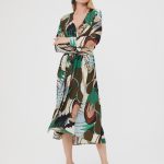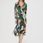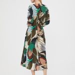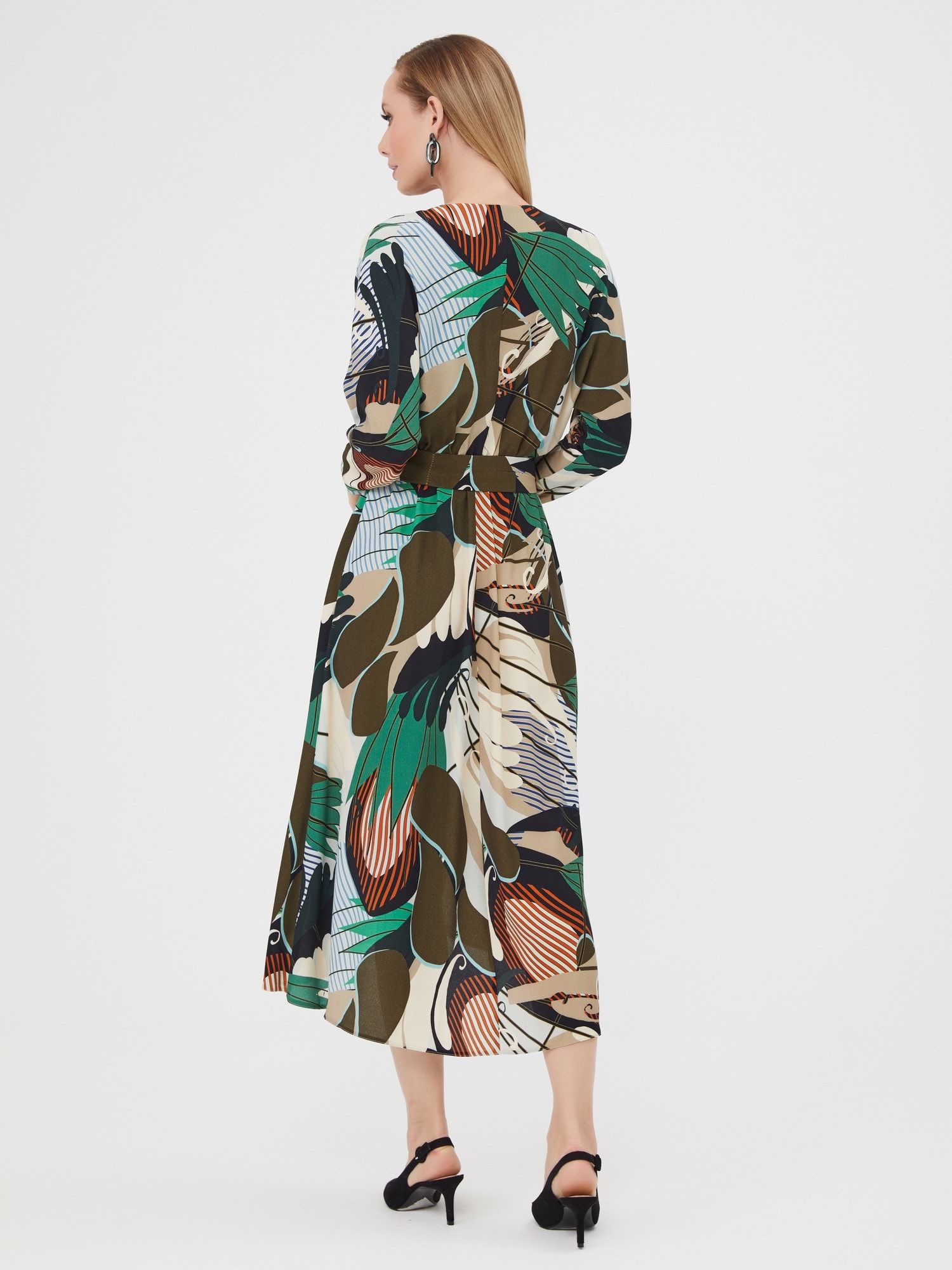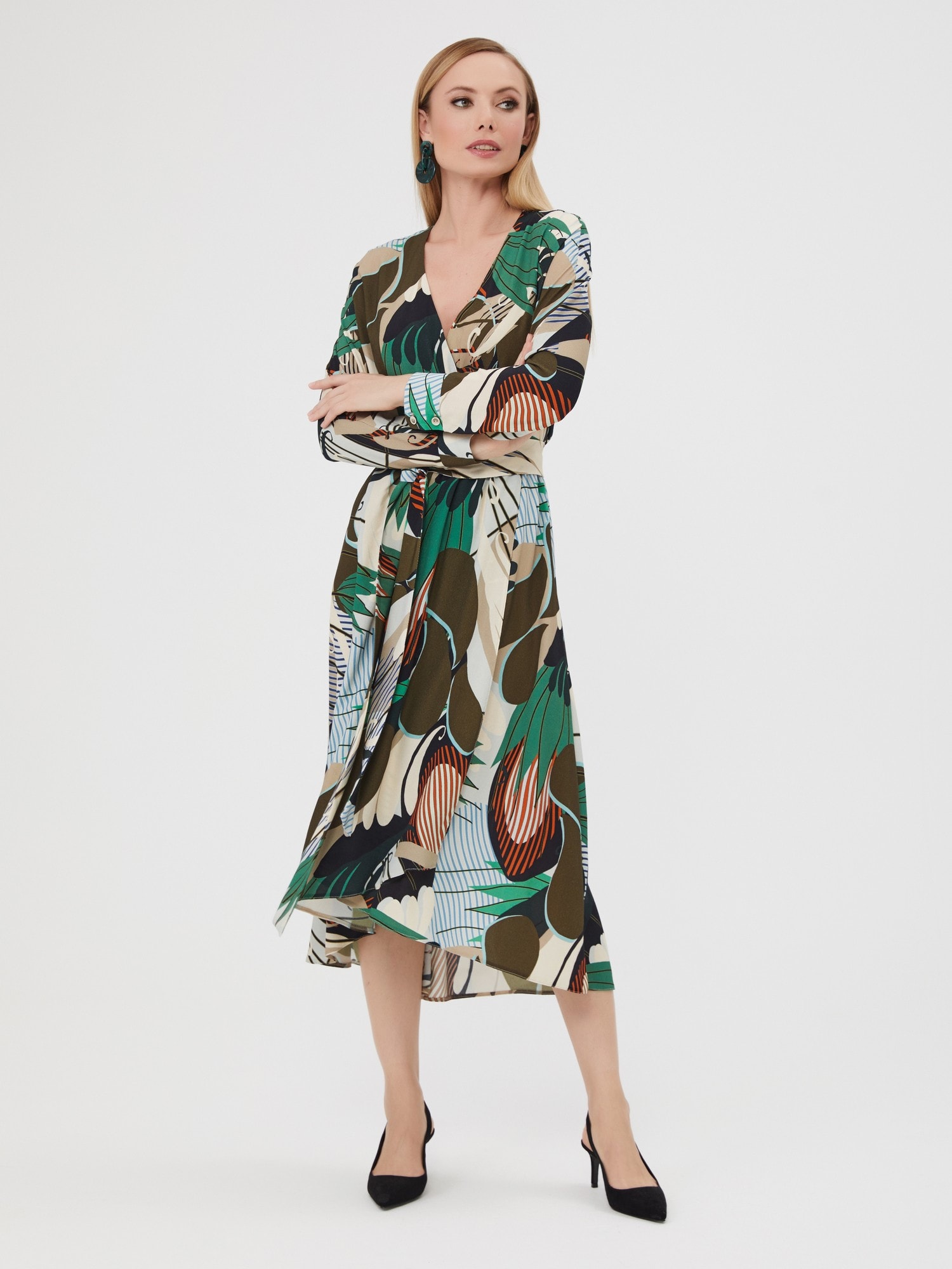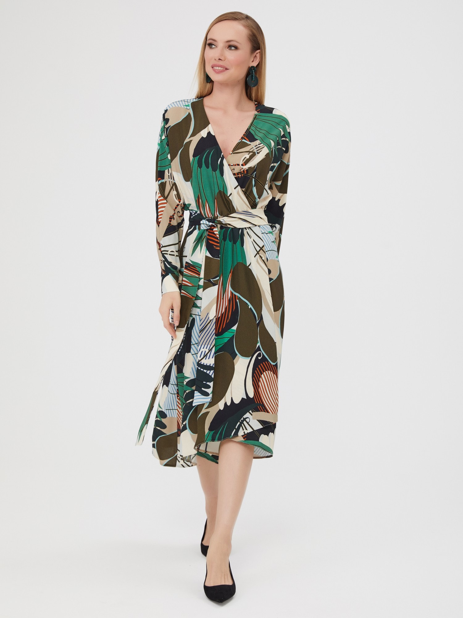 Состав ткани : Вискоза 100% Рост фотомоделей: 178 см Платье с тропическим узором с запахом. Талия на резинке, пояс в комплекте. Рукава с манжетами на пуговицах. Юбка также выполнена на запах.