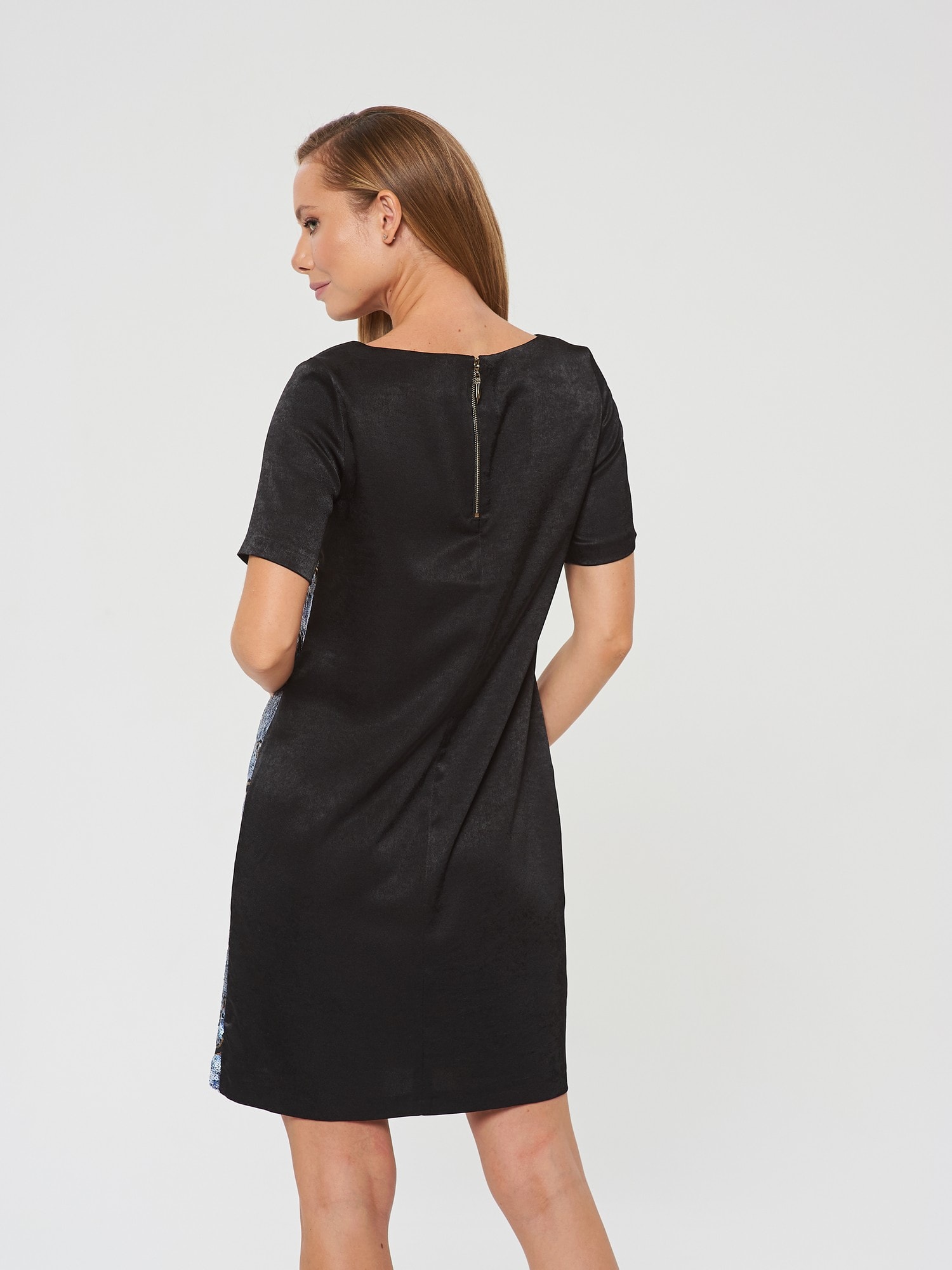 Платье с невероятной аппликацией-вышивкой из пайеток. Простой силуэт в сочетании с художественным принтом с сине-голубых тонах подойдет для особых случаев. Длина по колено, короткий рукав.