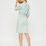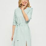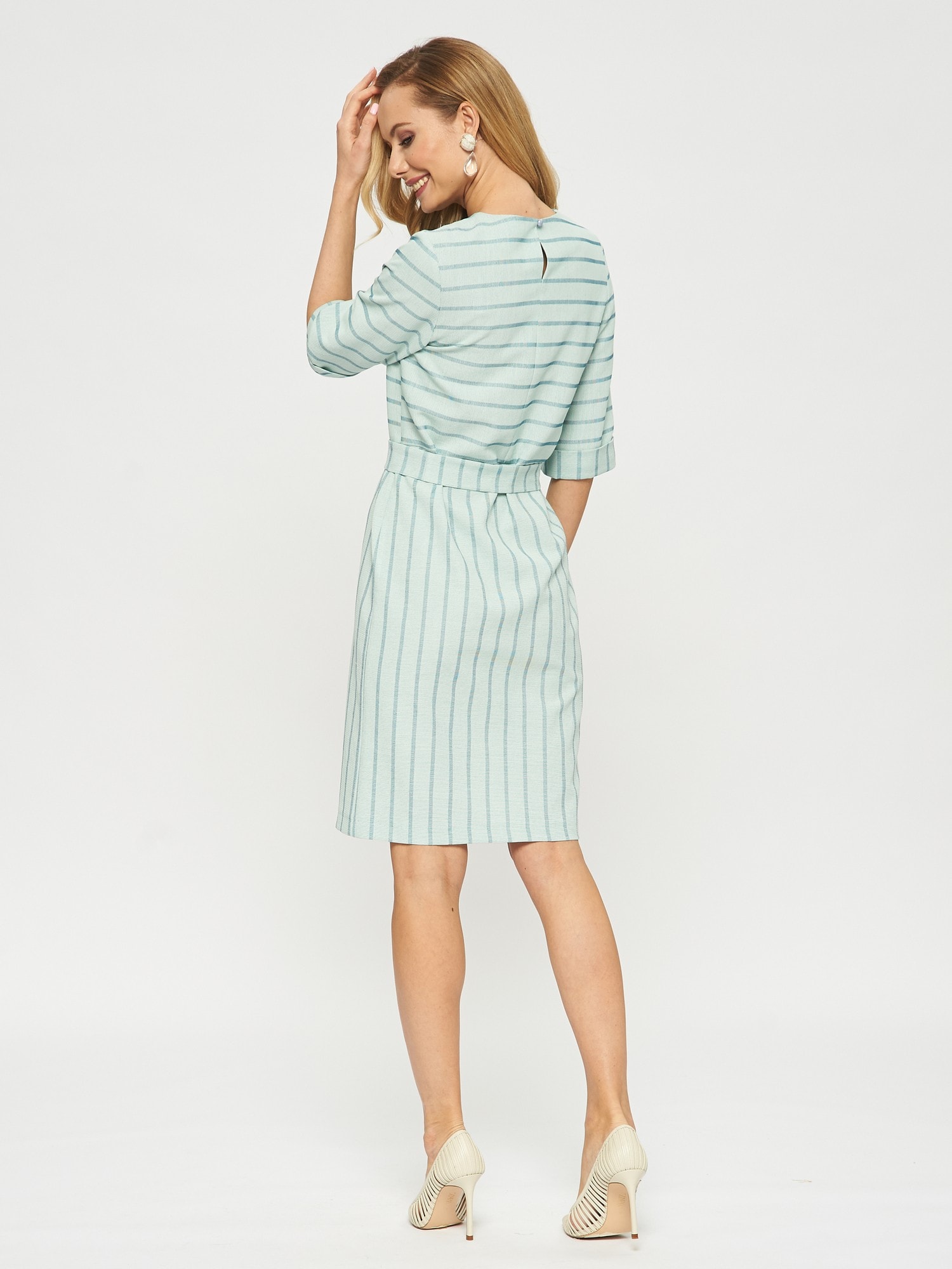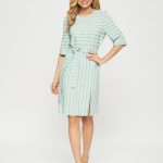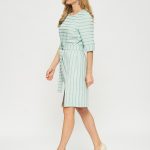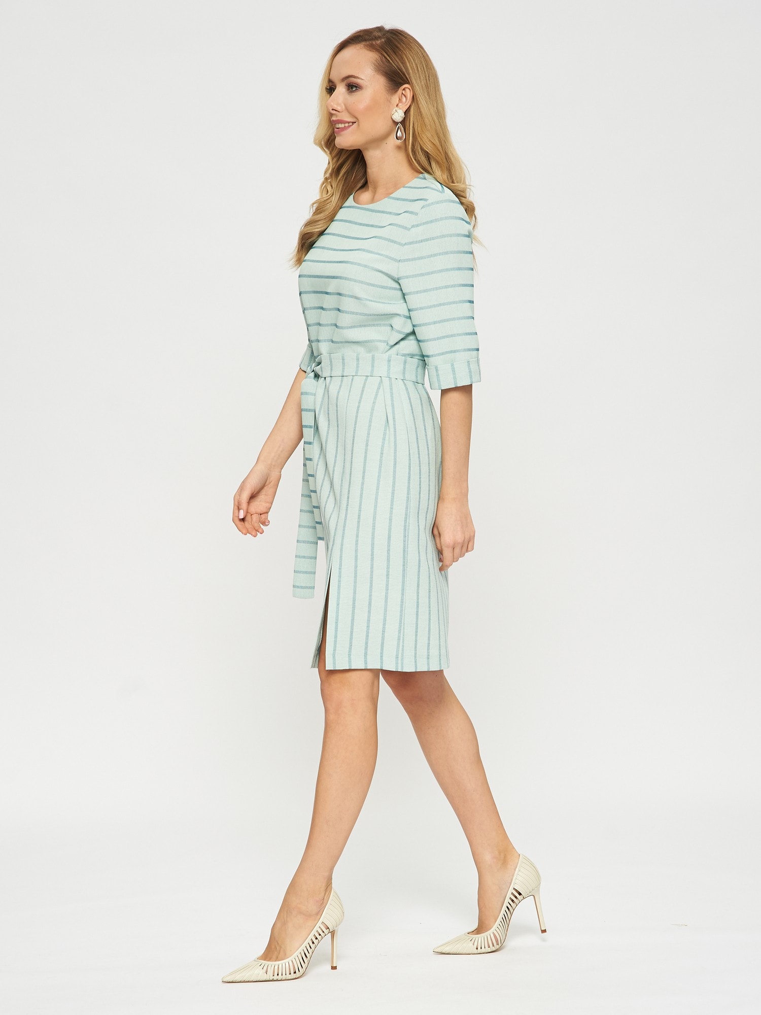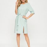 Прямое и эффектное платье в полоску с поясом. Рукава оформлены небольшим отворотом. Небольшой разрез по подолу. Приятные голубые оттенки и принт в морскую полоску не оставит равнодушной ни одну женщину.
