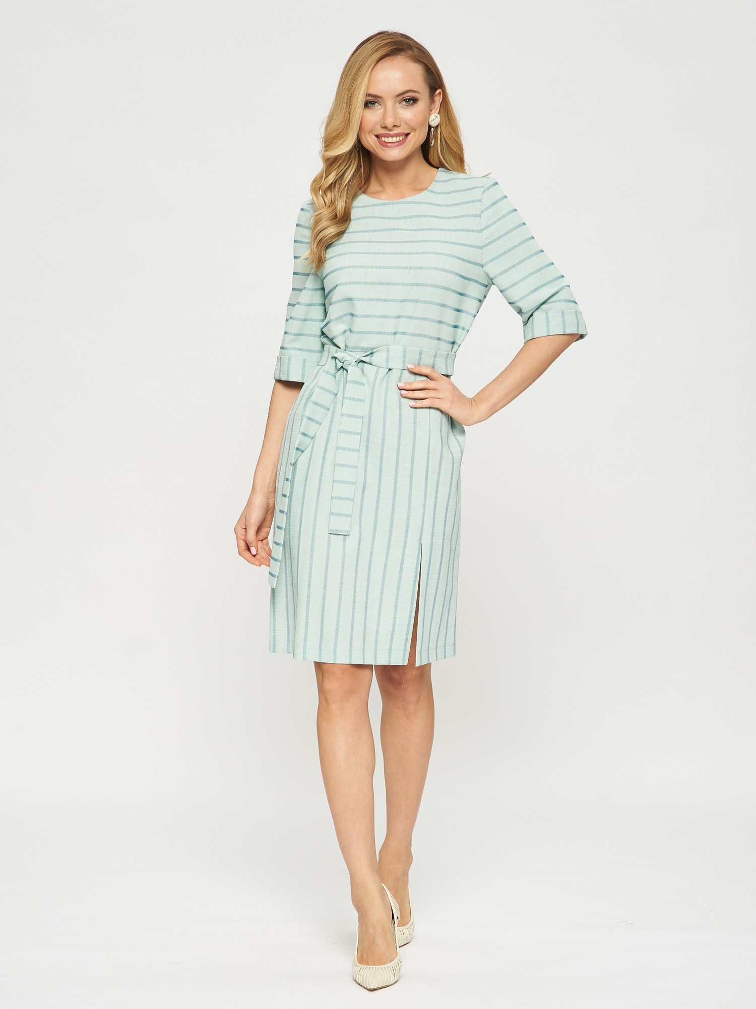 Прямое и эффектное платье в полоску с поясом. Рукава оформлены небольшим отворотом. Небольшой разрез по подолу. Приятные голубые оттенки и принт в морскую полоску не оставит равнодушной ни одну женщину.