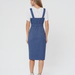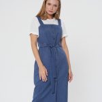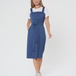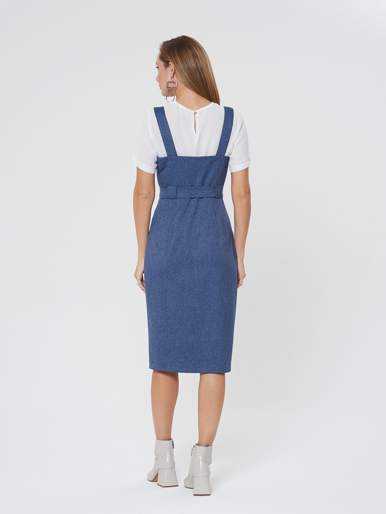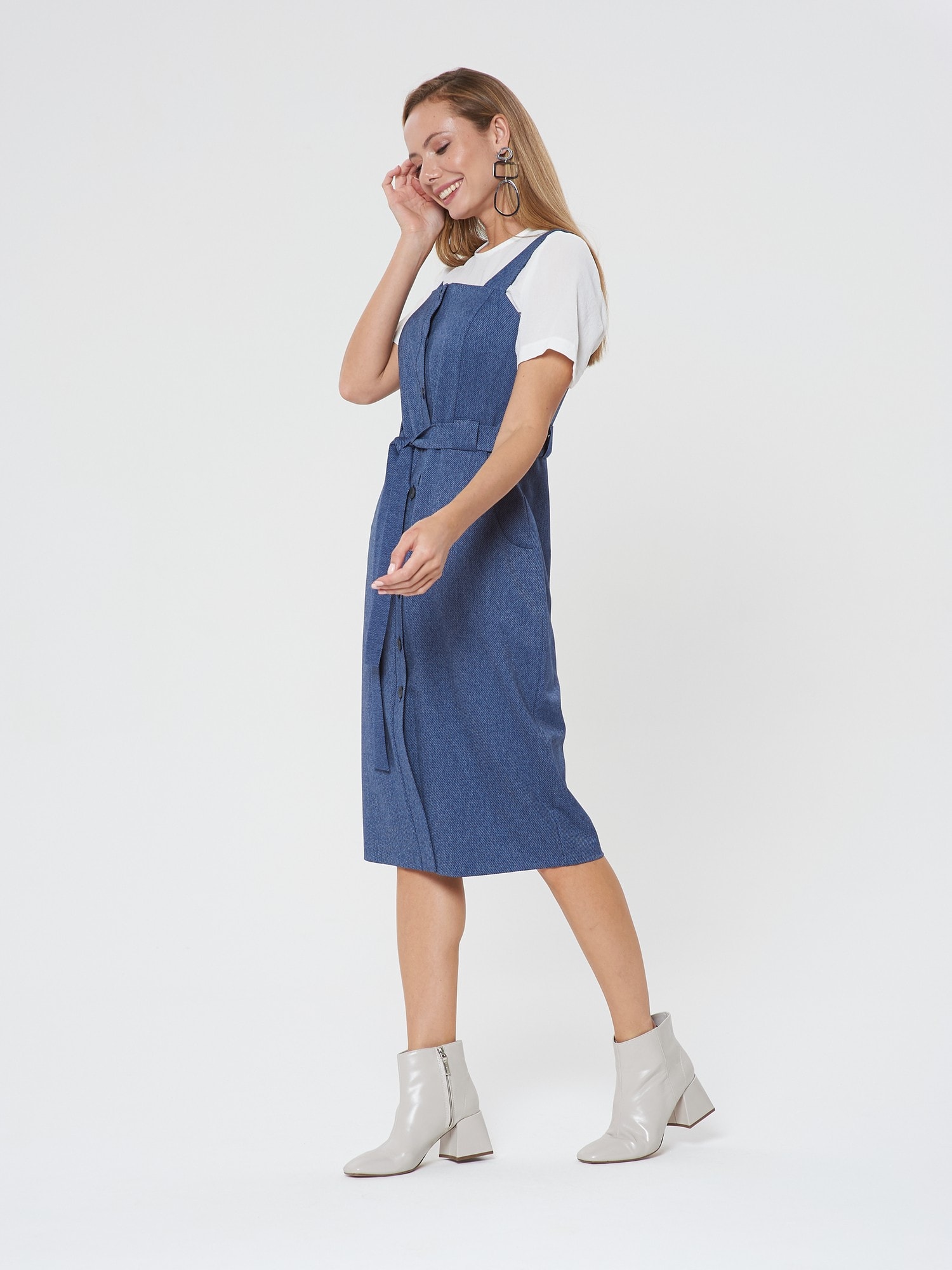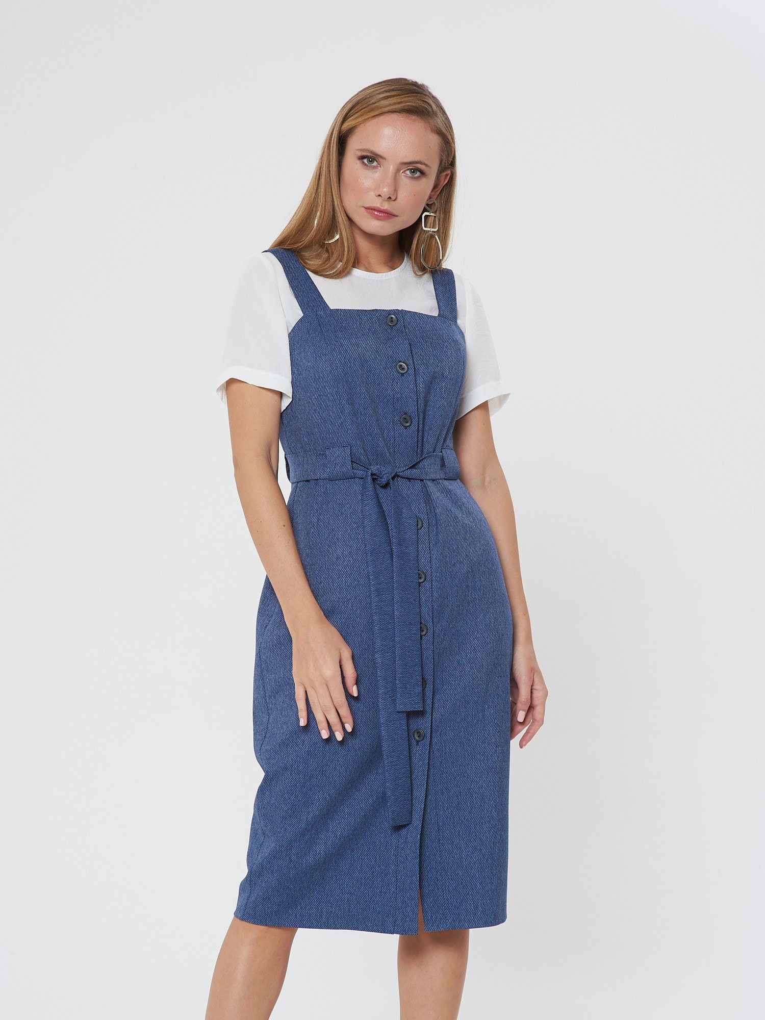 Платье-сарафан из ткани имитации денима. Широкие лямки и полуприлегающий силуэт. Планка с пуговицами по всей длине и пояс на талии. Дополните блузкой Д-810 ПЛ(В20)