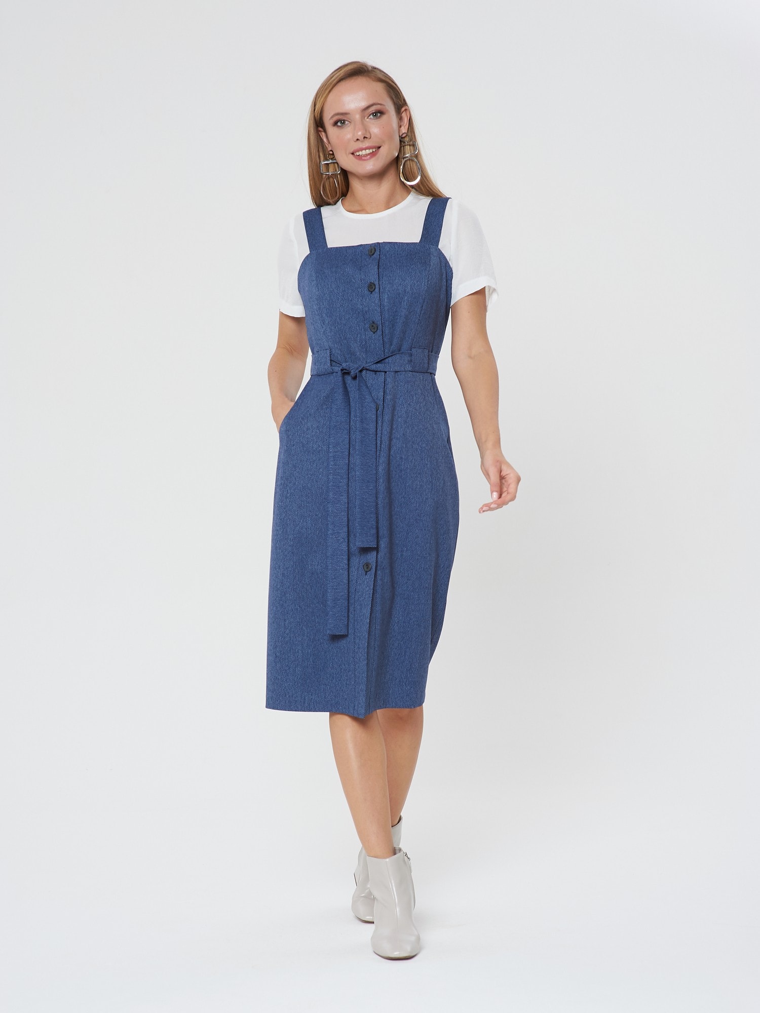 Платье-сарафан из ткани имитации денима. Широкие лямки и полуприлегающий силуэт. Планка с пуговицами по всей длине и пояс на талии. Дополните блузкой Д-810 ПЛ(В20)