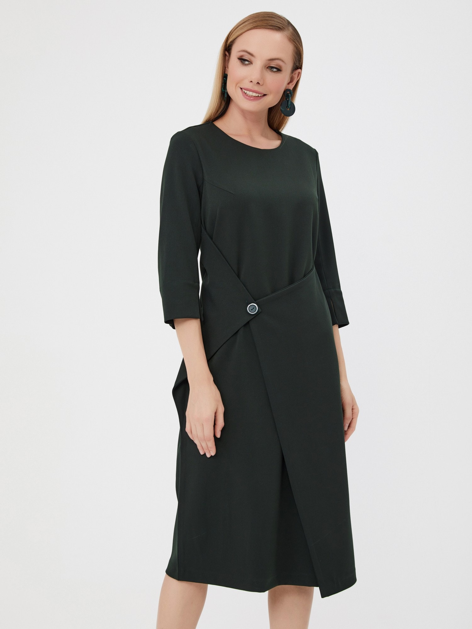 Платье-трансформер с ассиметричной деталью. Хит этой осени! Выполнено из насыщенного изумрудного цвета. Это платье выделит вас из толпы своей оригинальностью и идеальной посадкой. Деталь можно застегнуть как спереди, так и сзади.