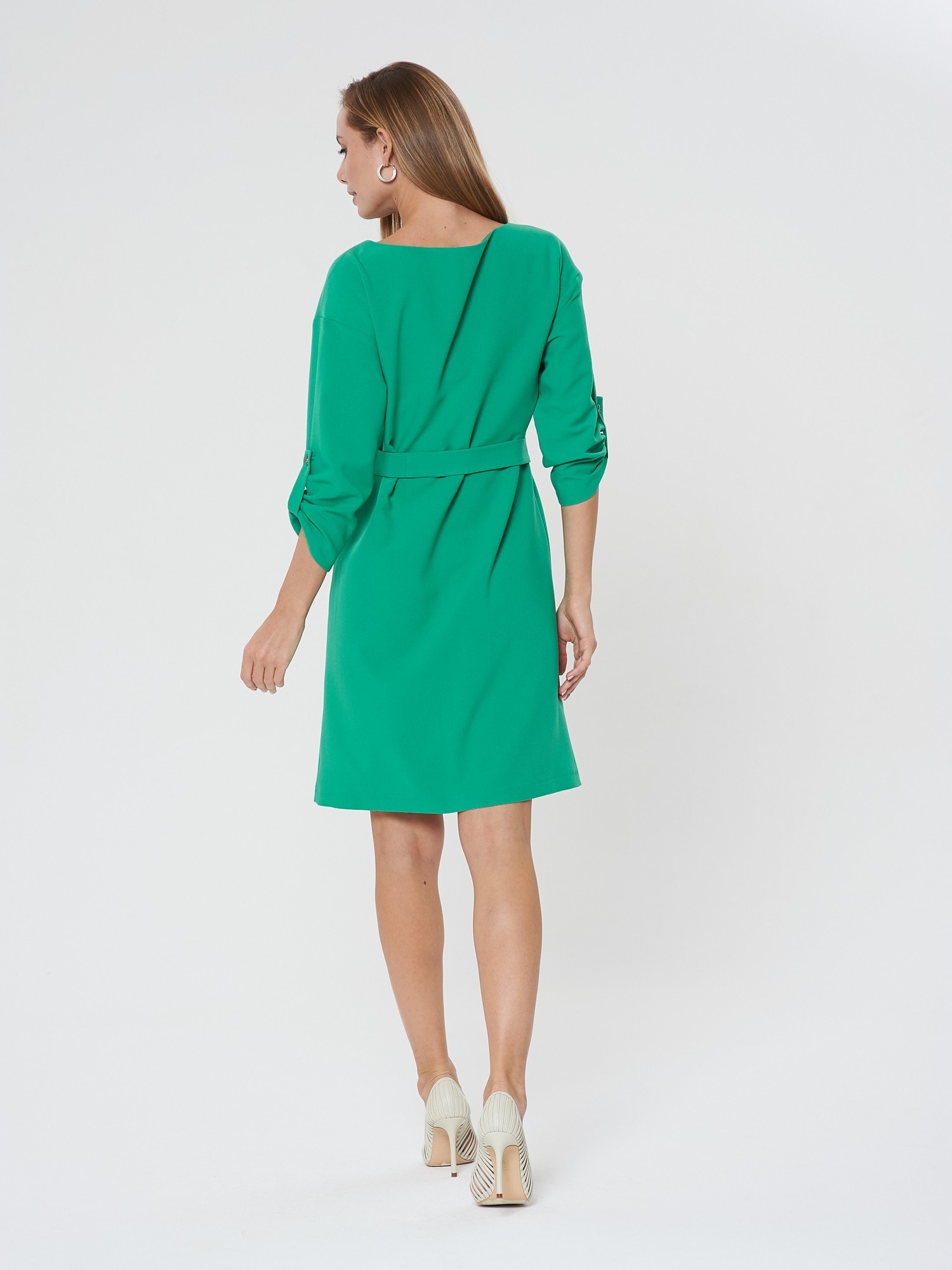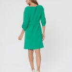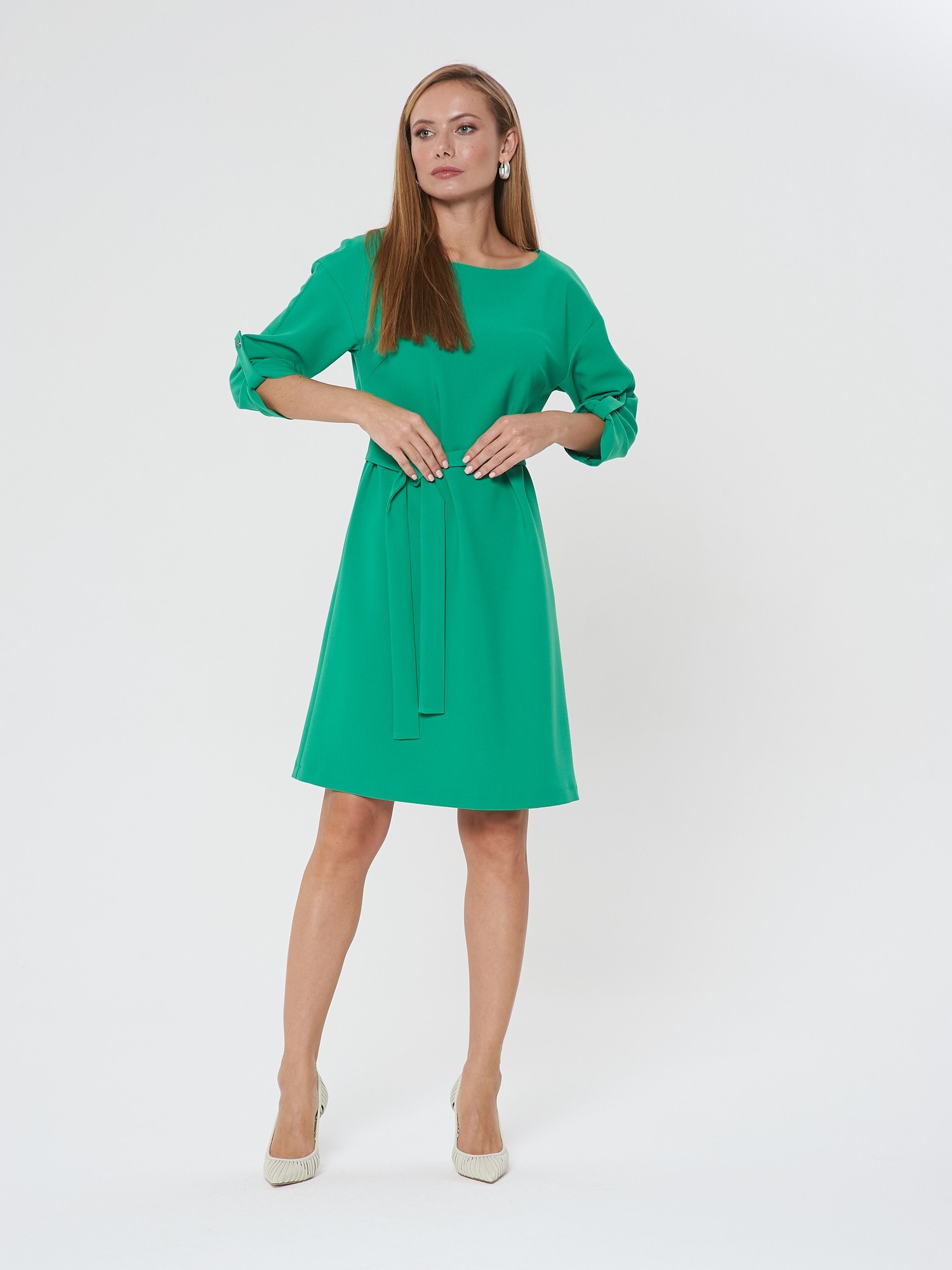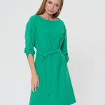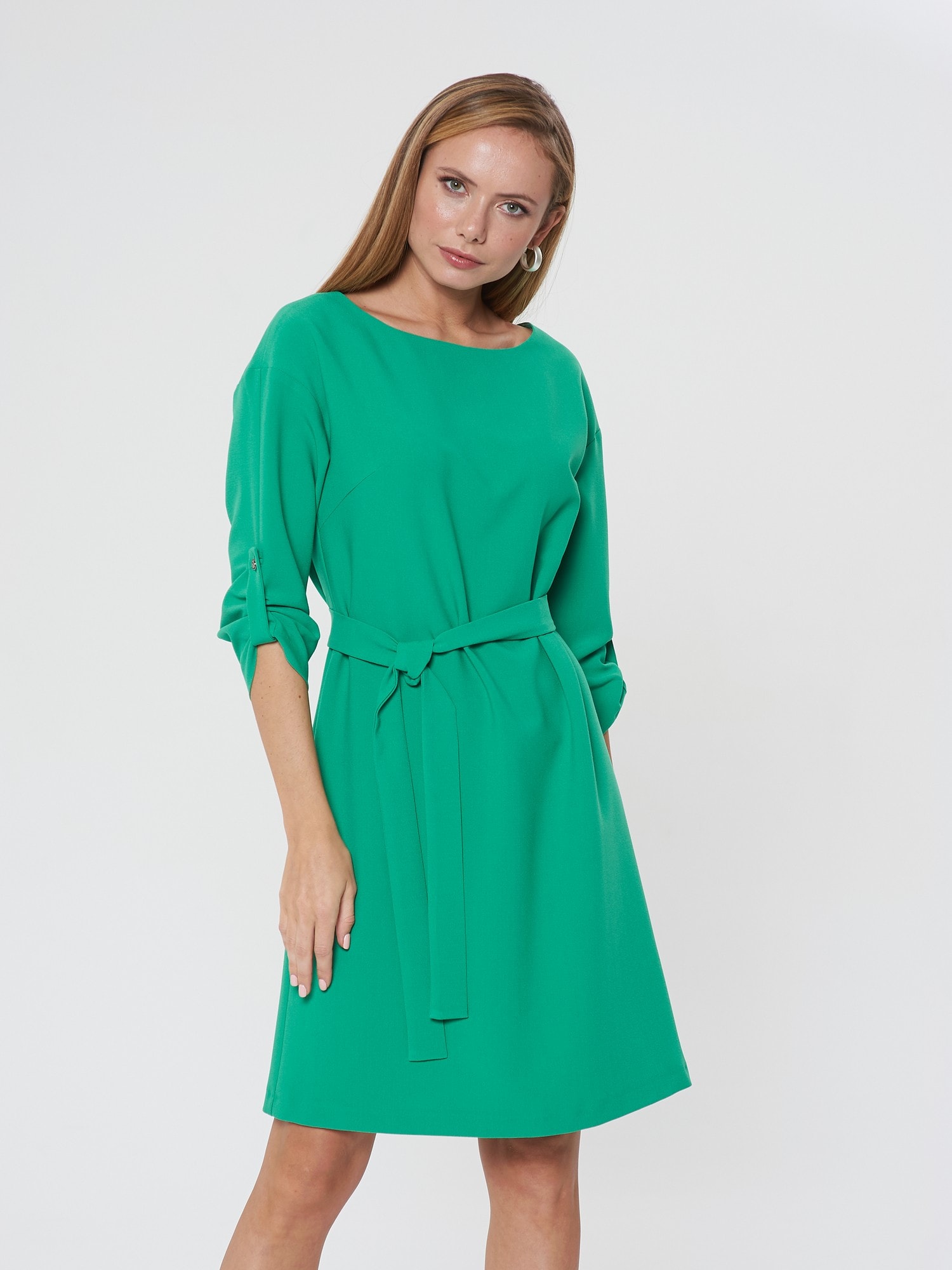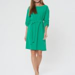 Платье насыщенного зеленого цвета с поясом. Округлый вырез горловины, рукава, собирающиеся на хлястик и пуговицу. Длина до колена. Подходит для разных типов фигуры.