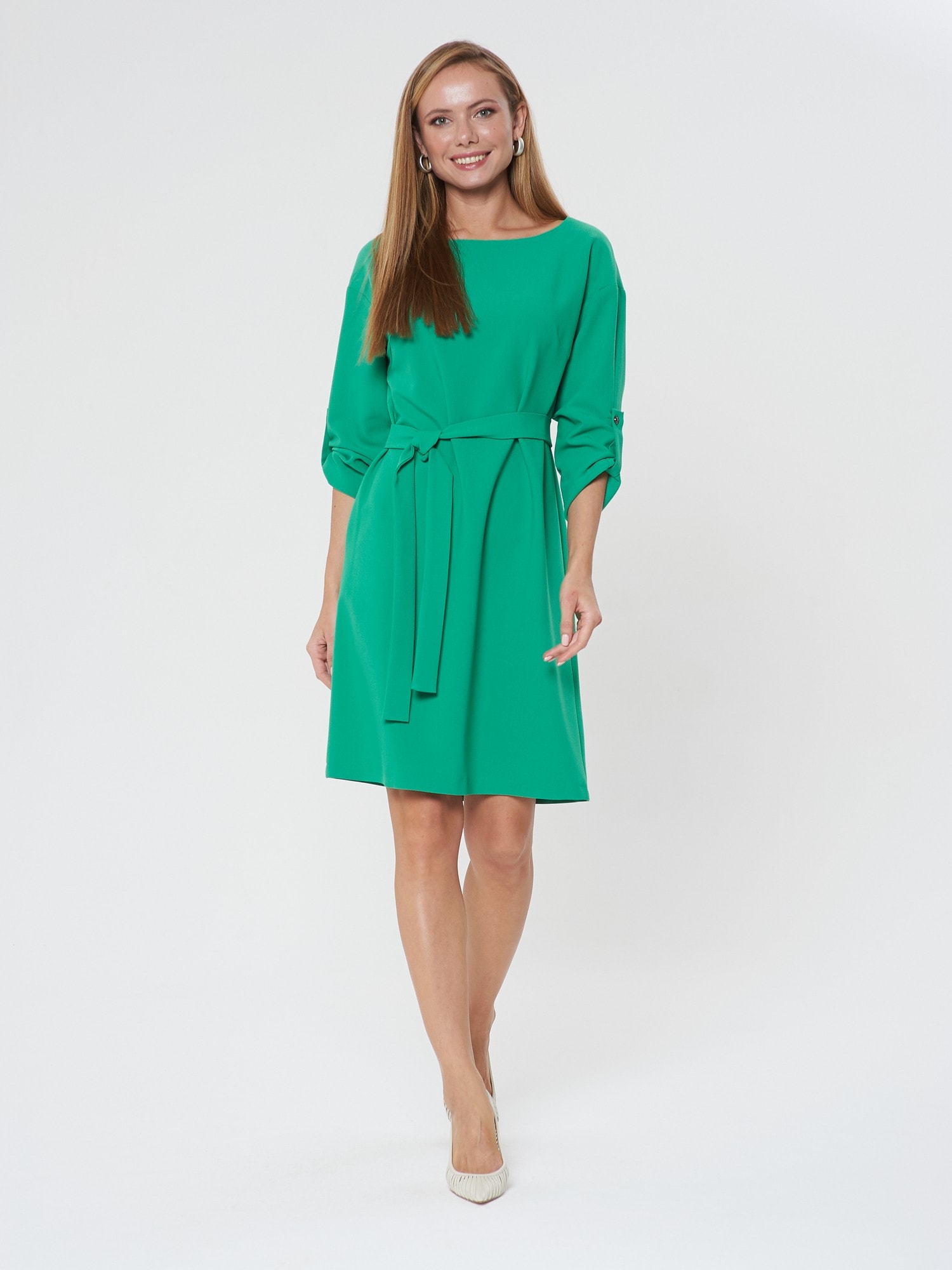 Платье насыщенного зеленого цвета с поясом. Округлый вырез горловины, рукава, собирающиеся на хлястик и пуговицу. Длина до колена. Подходит для разных типов фигуры.