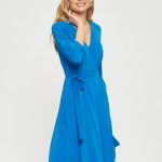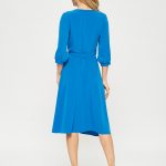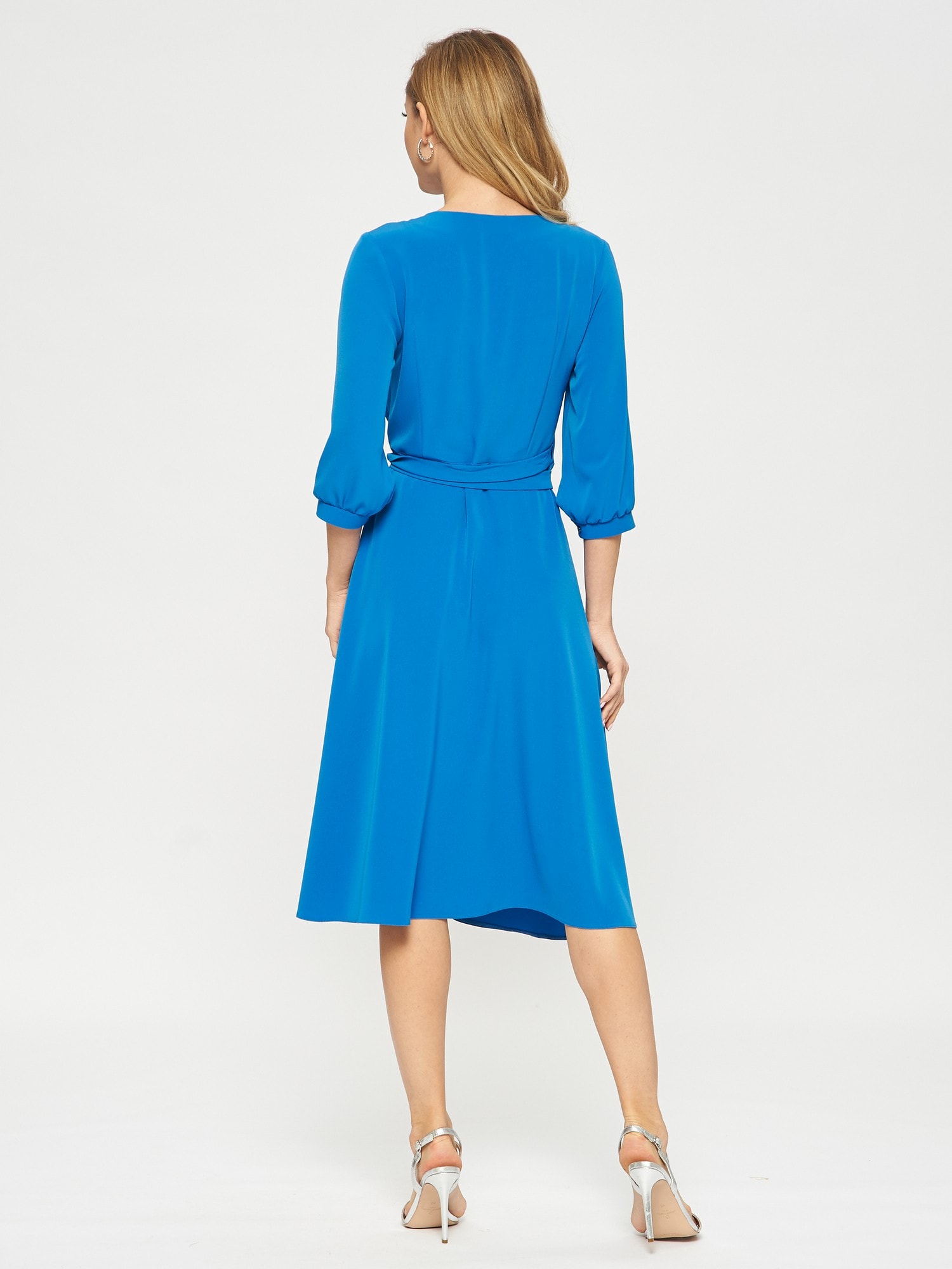 Платье цвета индиго с запахом и притачным поясом. Выполнено из текстурированной ткани, летящий подол.