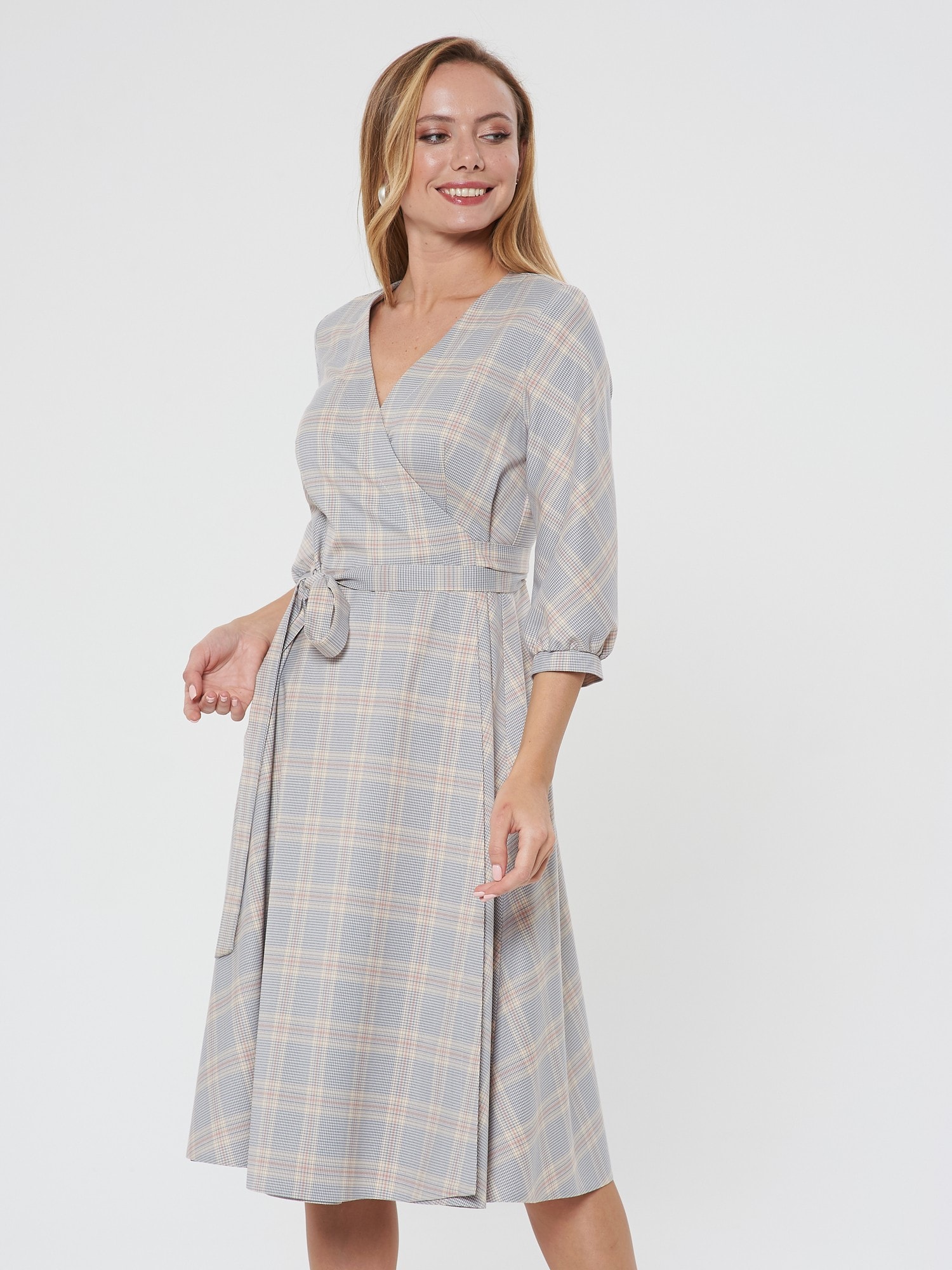 Нежное платье с запахом. Выполнено из серо-розовой шотландки. Объемные рукава собраны на манжеты. Струящаяся юбка будет украшать ваши движения при ходьбе.