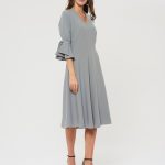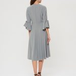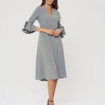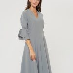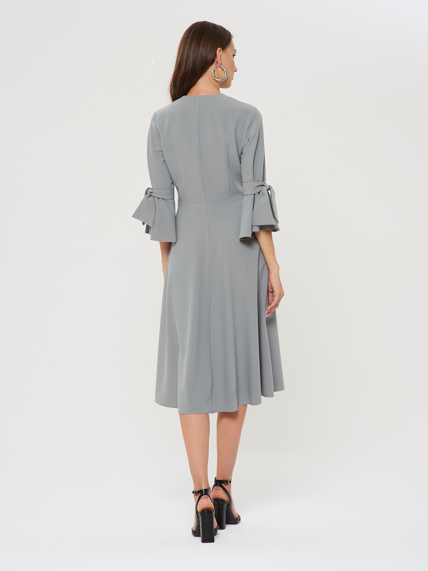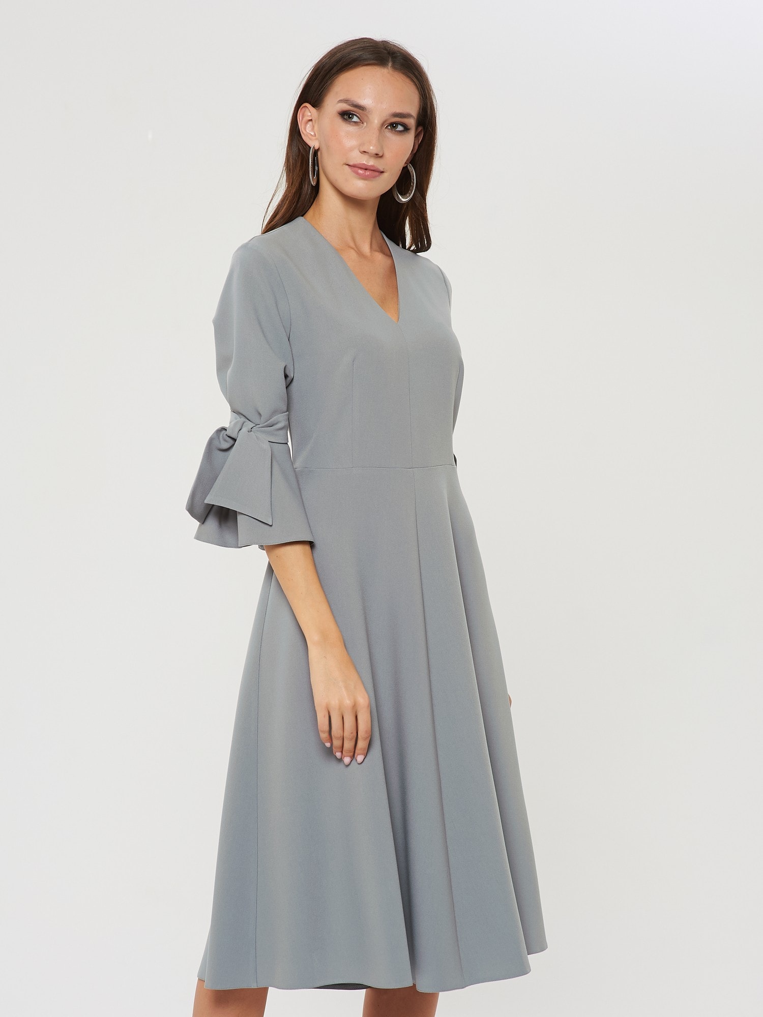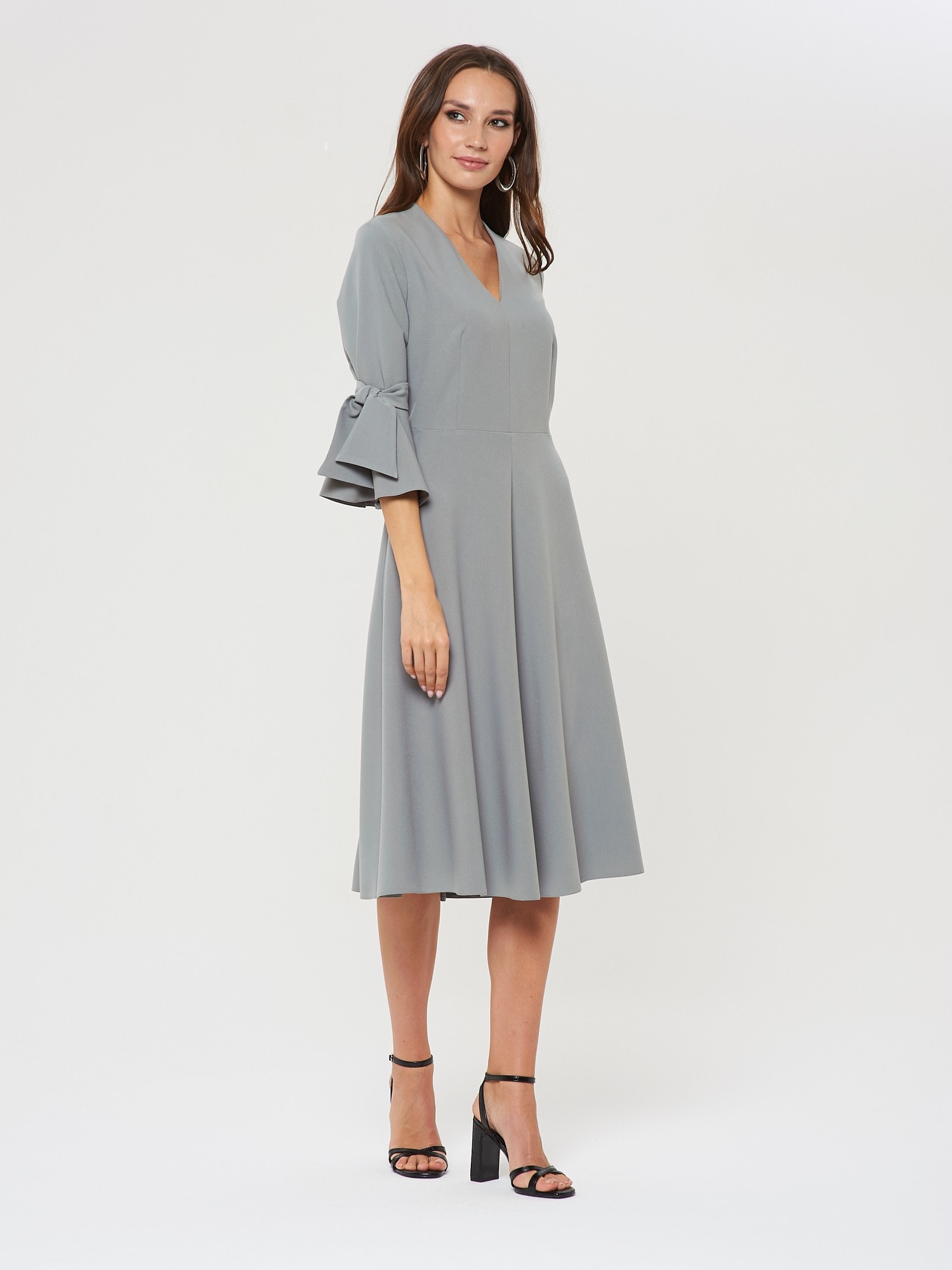 Платье в стиле английской леди в благородном пыльно-сером оттенке. V-образый вырез и юбка-полусолнце. Романтичные завязки на бантики на рукавах и длина ниже колена.