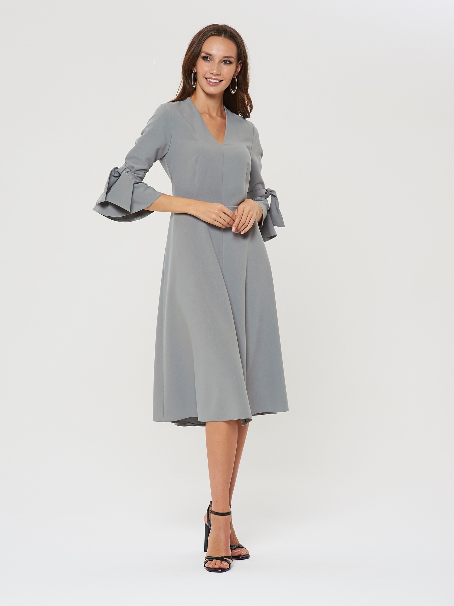 Платье в стиле английской леди в благородном пыльно-сером оттенке. V-образый вырез и юбка-полусолнце. Романтичные завязки на бантики на рукавах и длина ниже колена.