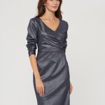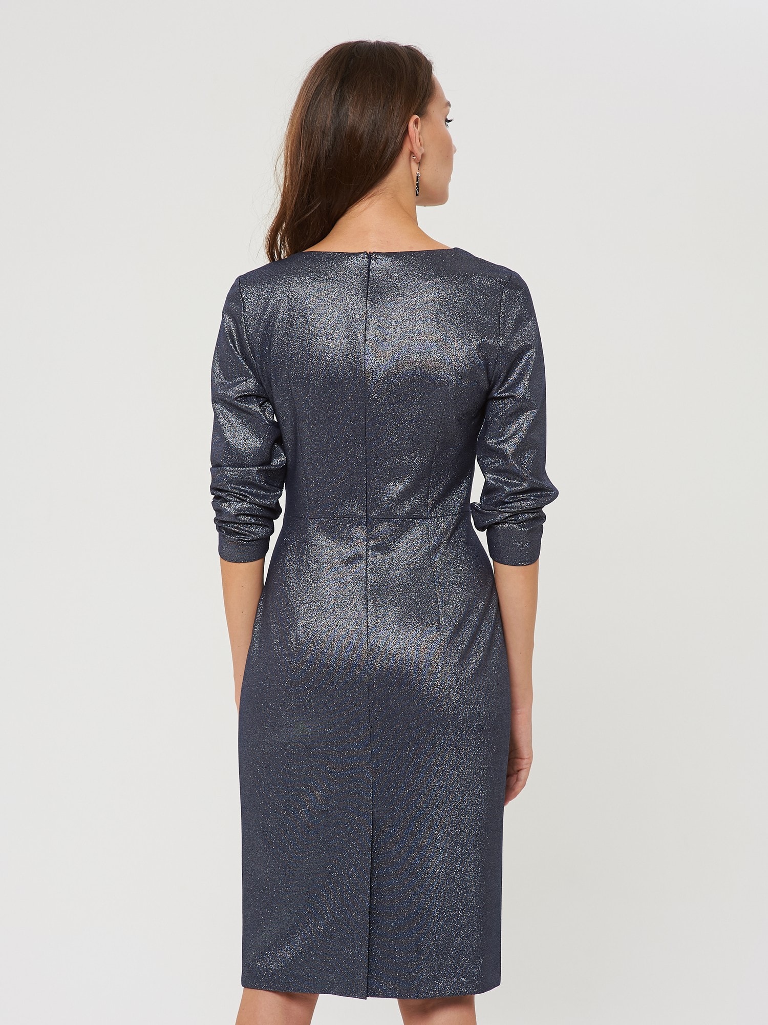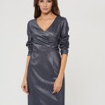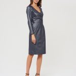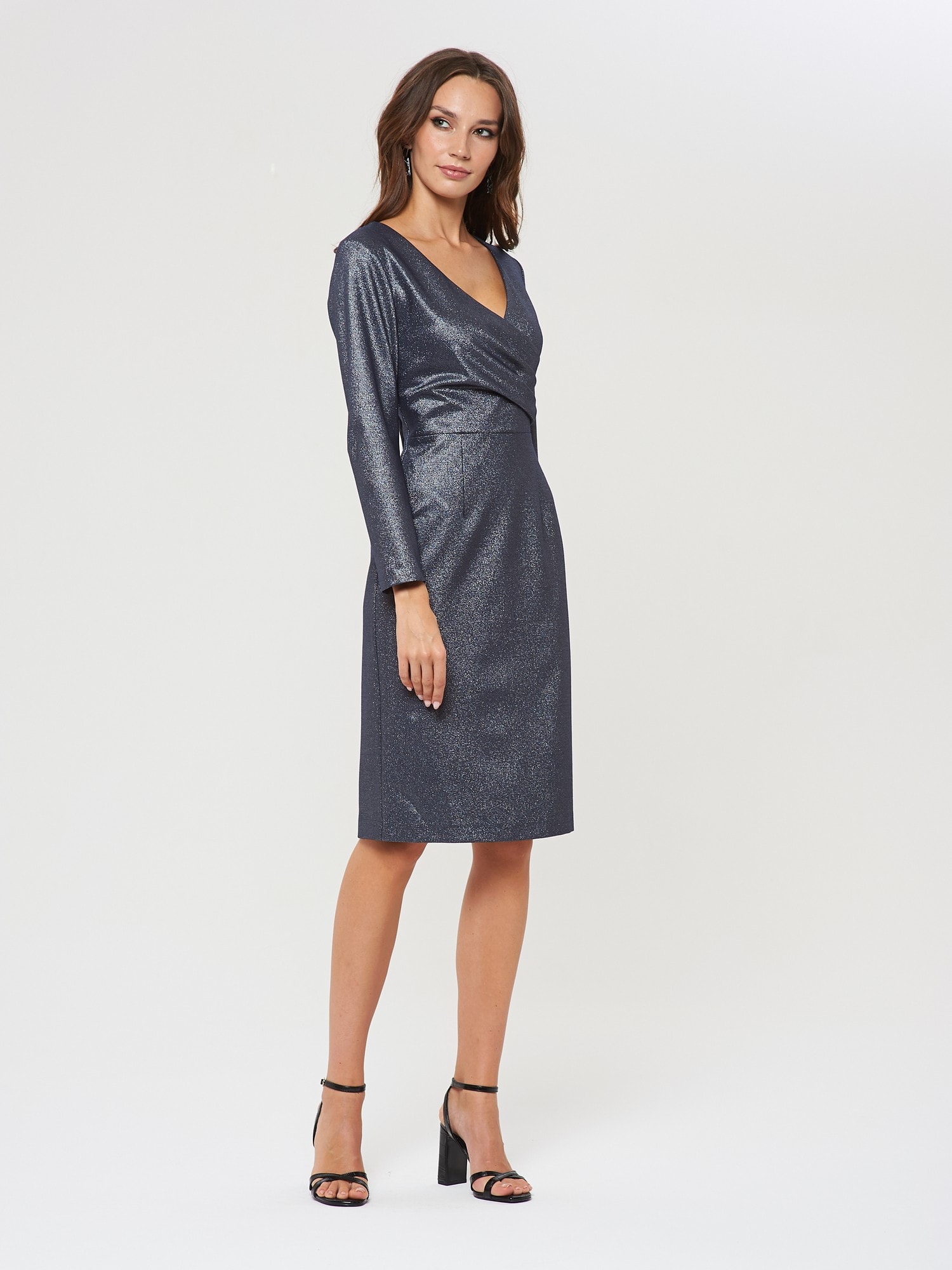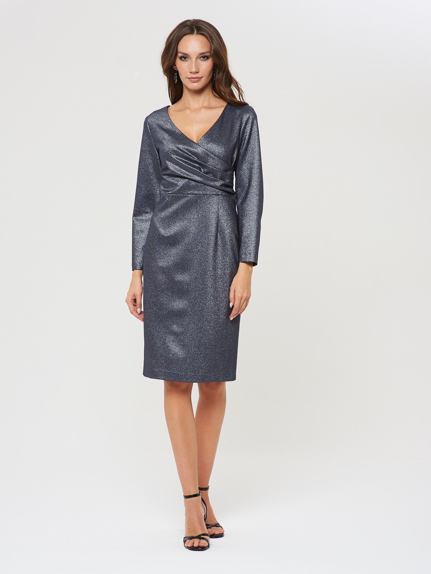 Ультра-элегантное платье на запах с драпировкой. Выполнено из блестящей фактурной ткани специально под особые случаи и торжественные мероприятия. Застежка на потайную молнию в серединном шве на спинке.