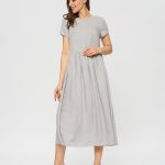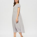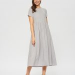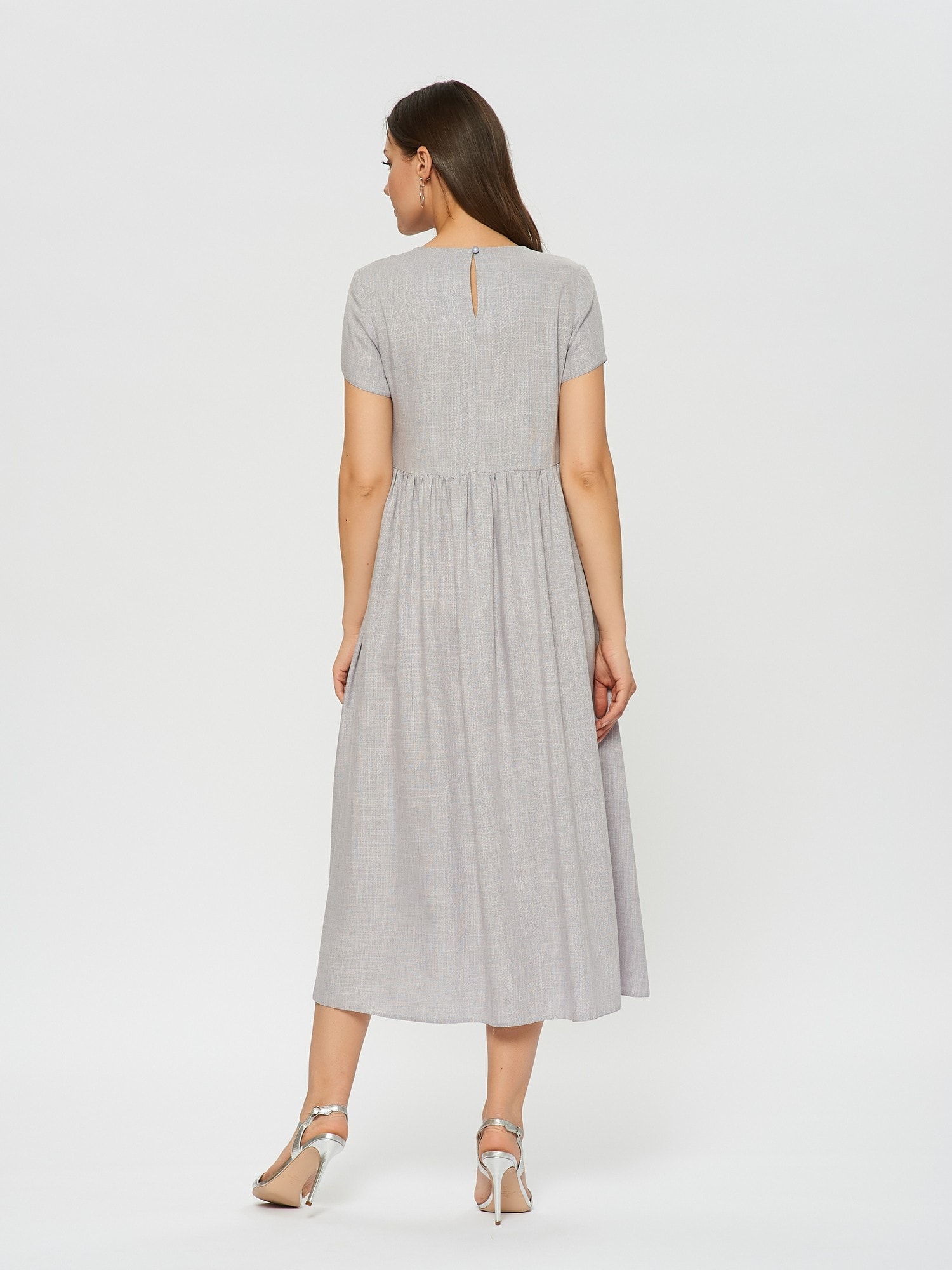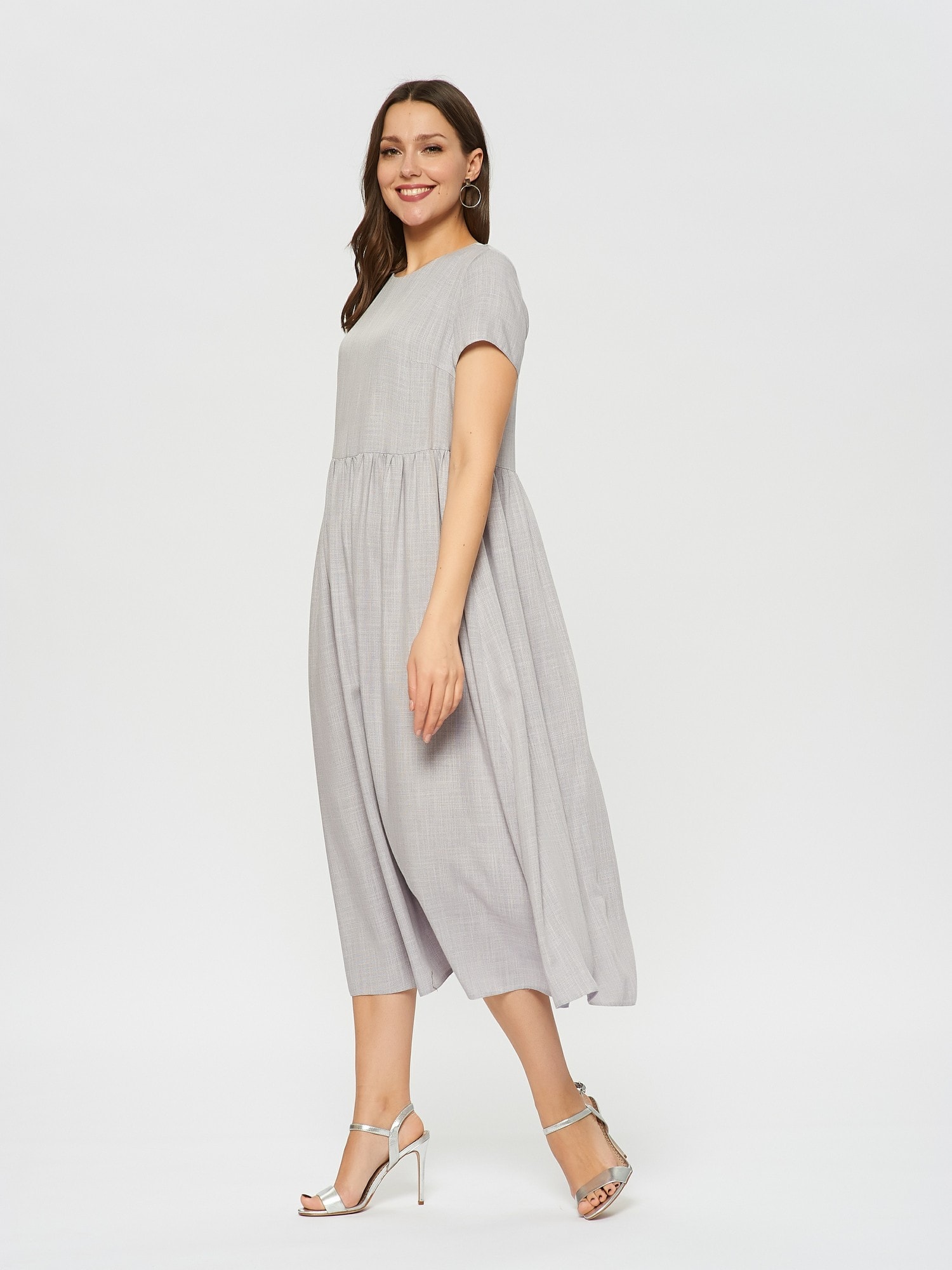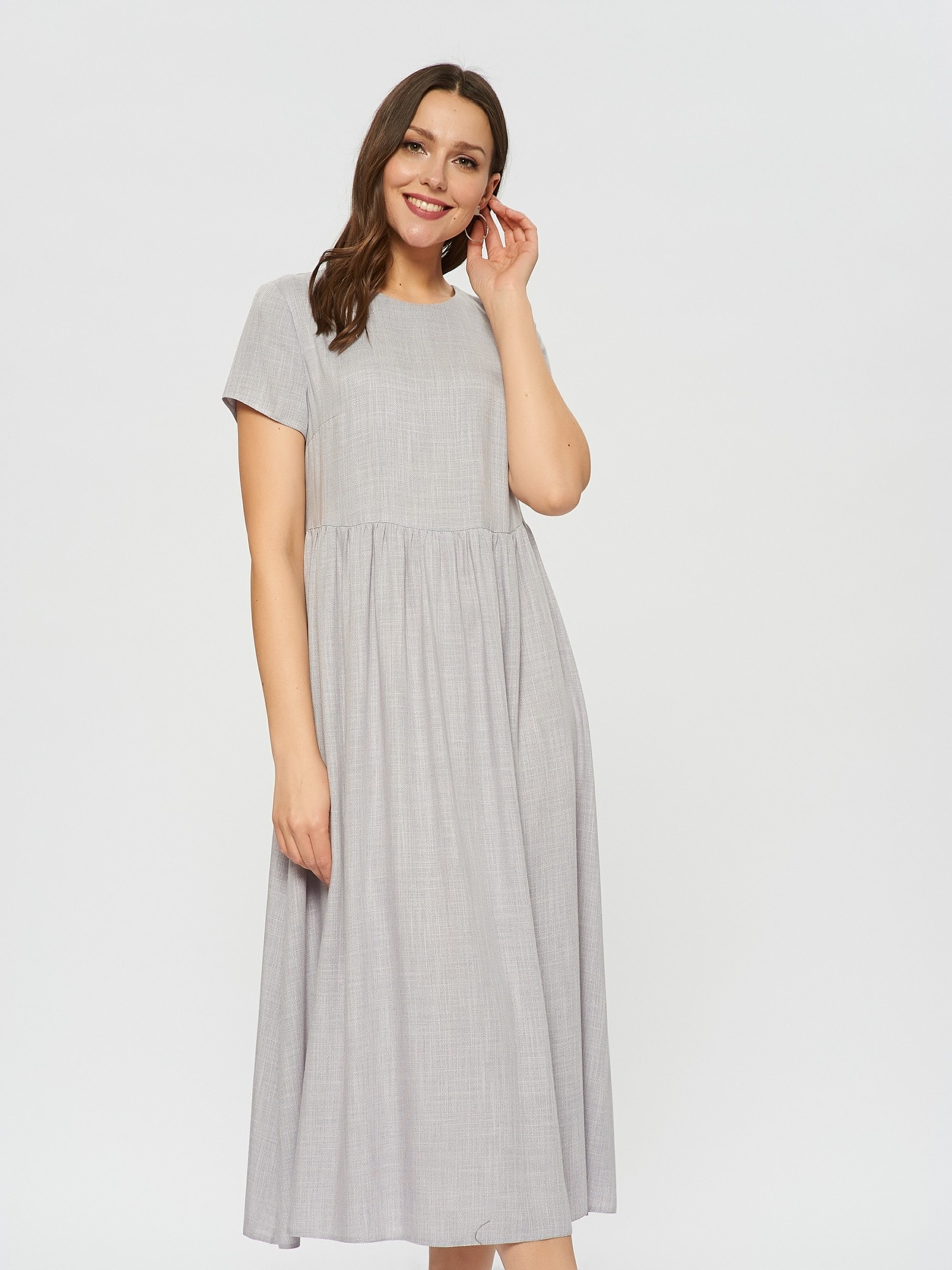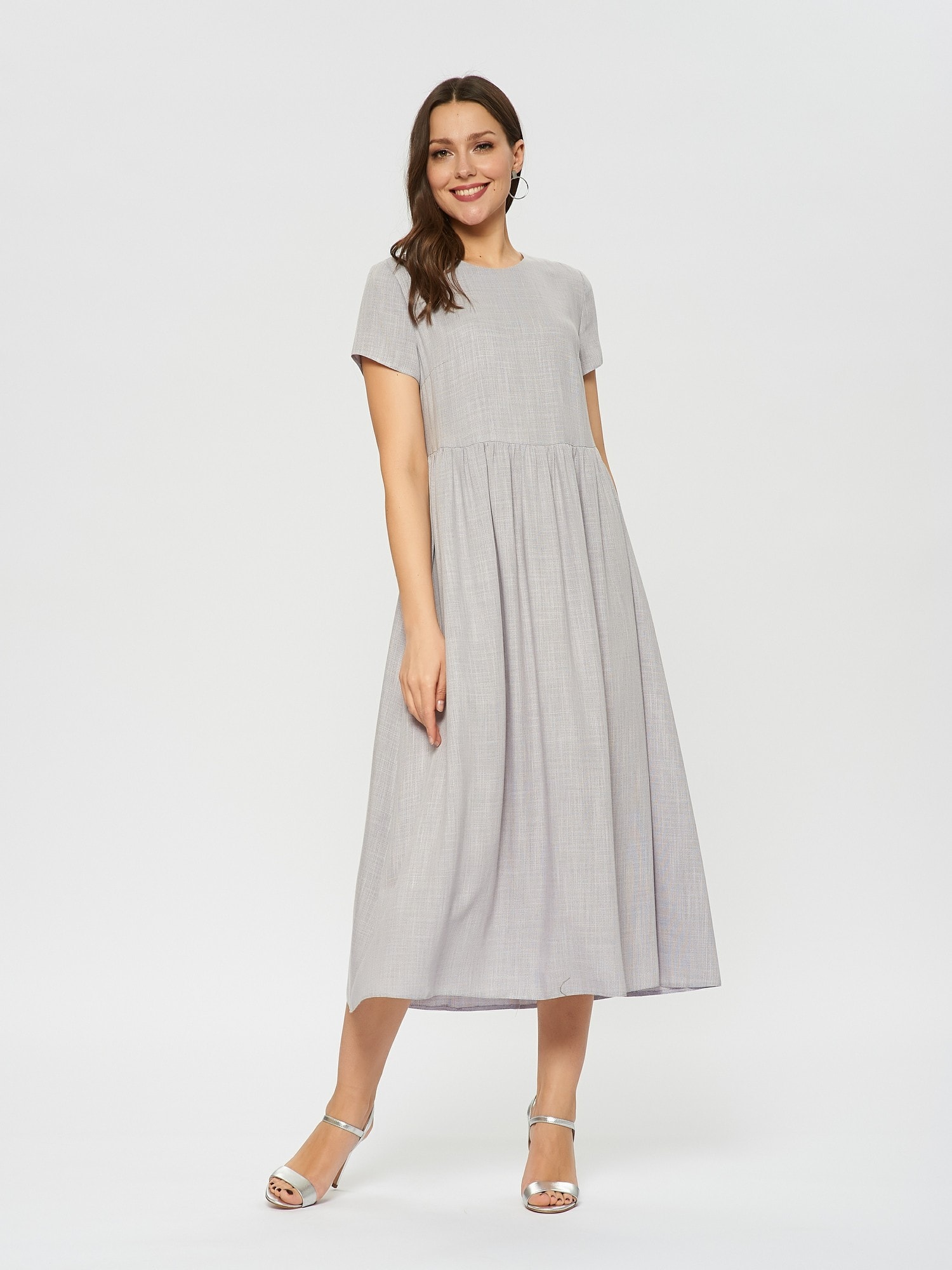 Свободное платье, отрезное по талии. Женственный фасон baby-doll в приглушенно-фиалковом пастельном цвете. Мягкая ткань с фактурной выделкой.Слегка завышенная талия со сборками.