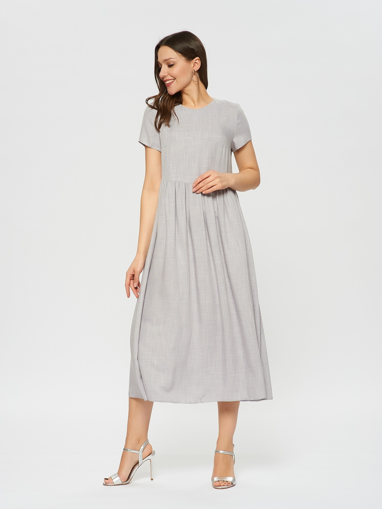 Свободное платье, отрезное по талии. Женственный фасон baby-doll в приглушенно-фиалковом пастельном цвете. Мягкая ткань с фактурной выделкой.Слегка завышенная талия со сборками.