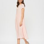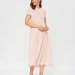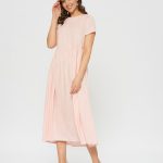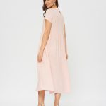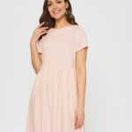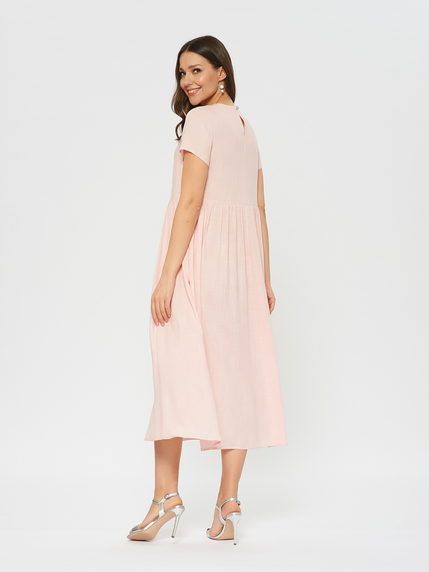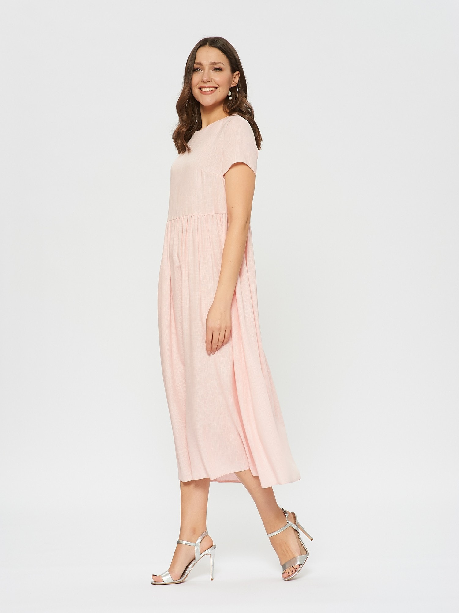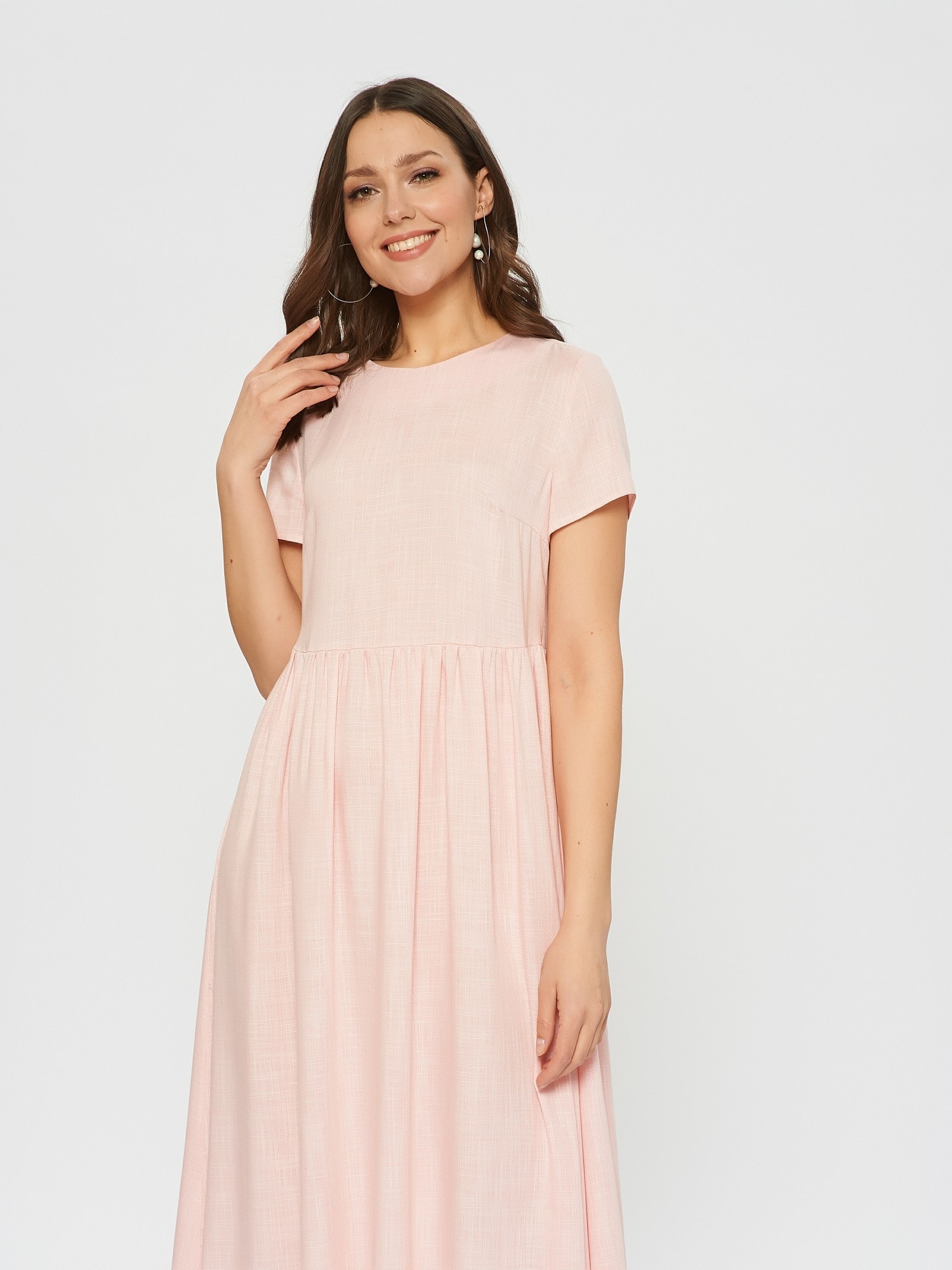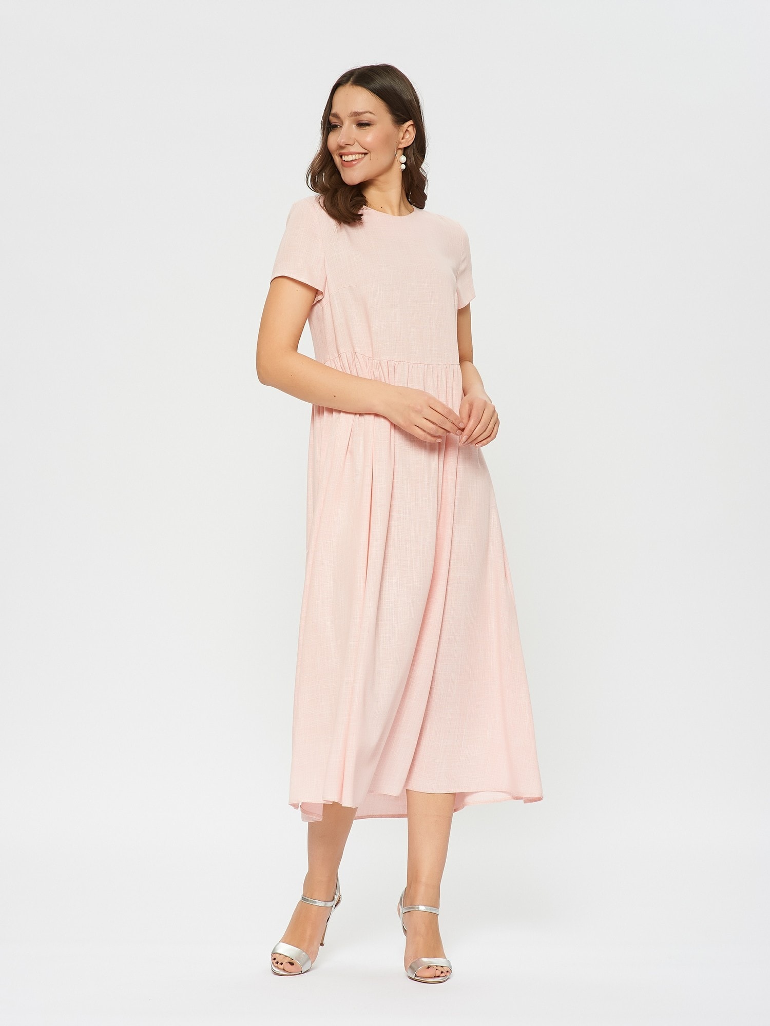 Свободное платье, отрезное по талии. Женственный фасон baby-doll в цвете цветущей яблони. Мягкая ткань с фактурной выделкой.Слегка завышенная талия со сборками.