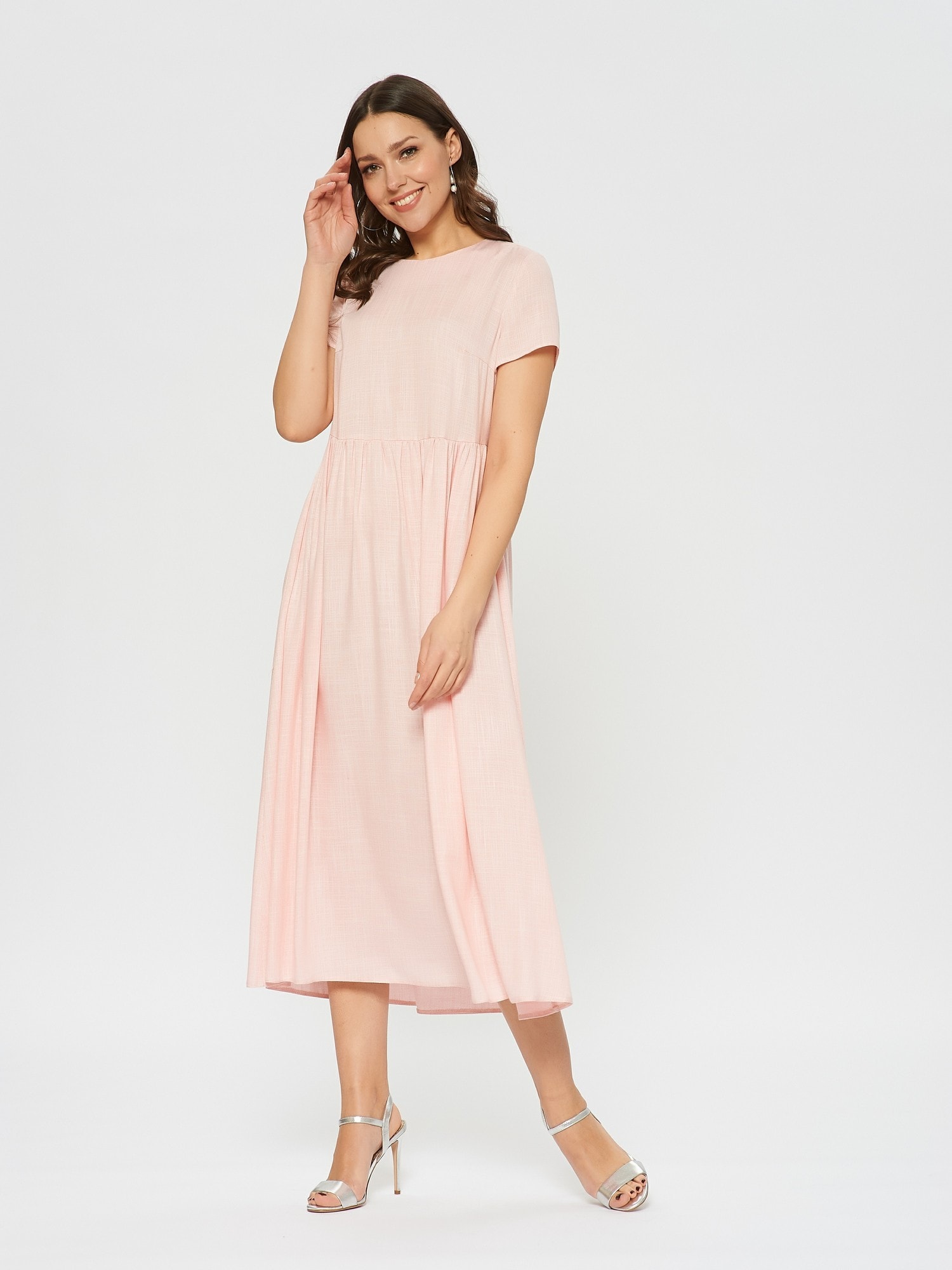 Свободное платье, отрезное по талии. Женственный фасон baby-doll в цвете цветущей яблони. Мягкая ткань с фактурной выделкой.Слегка завышенная талия со сборками.