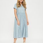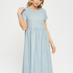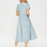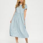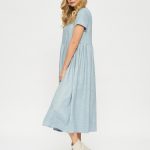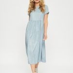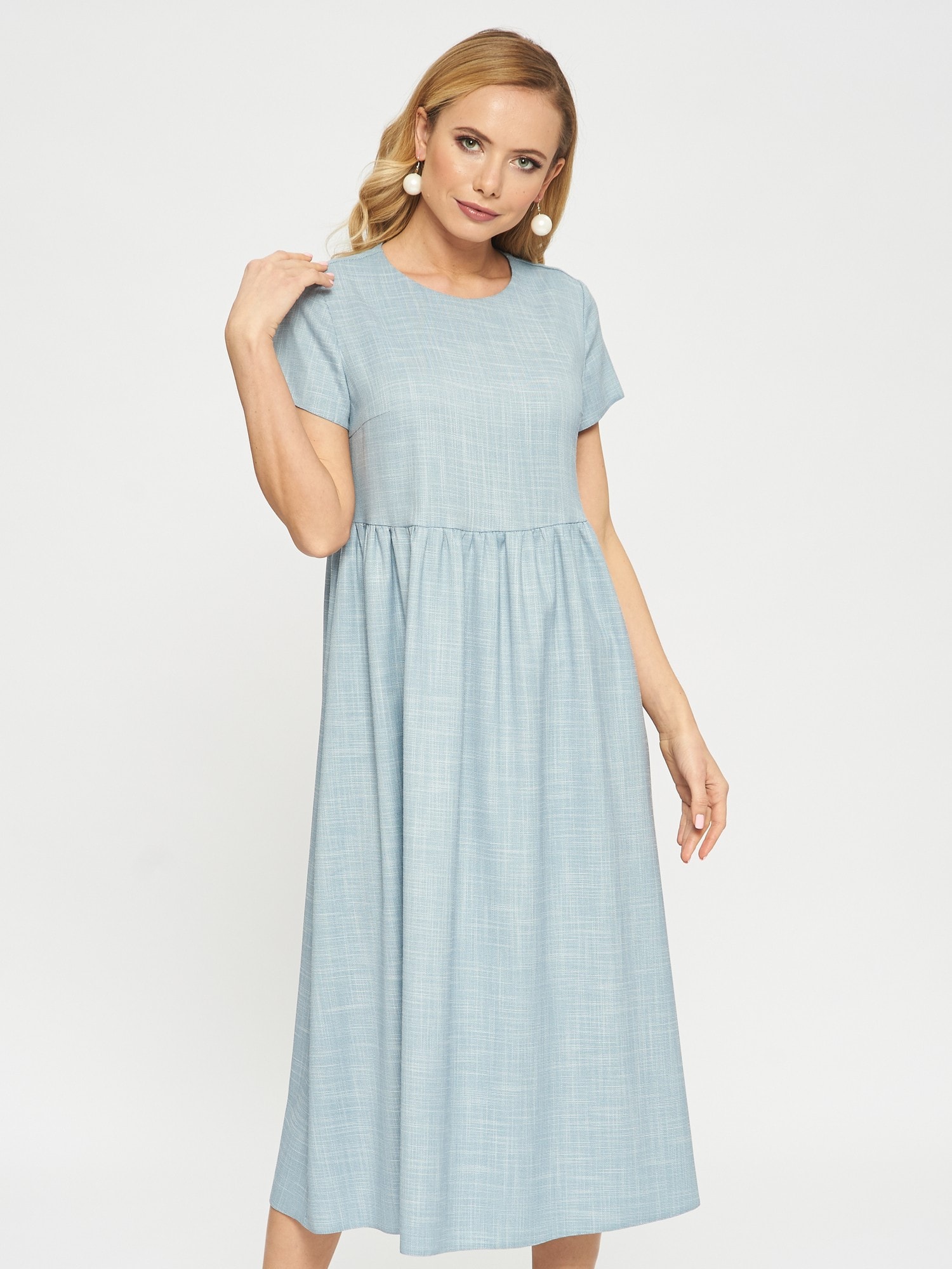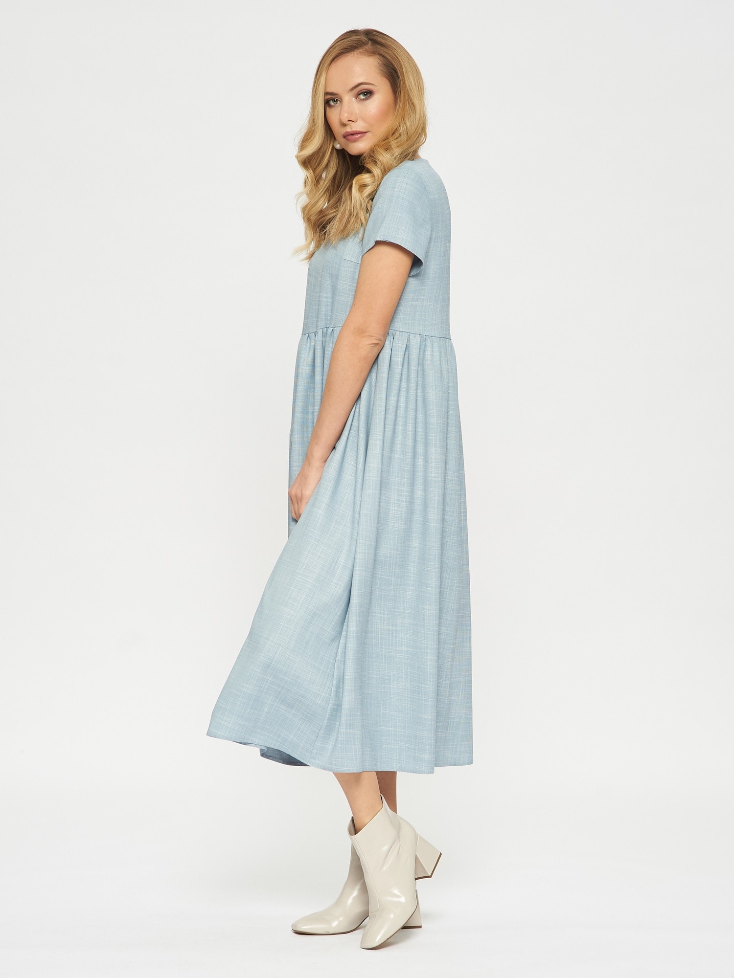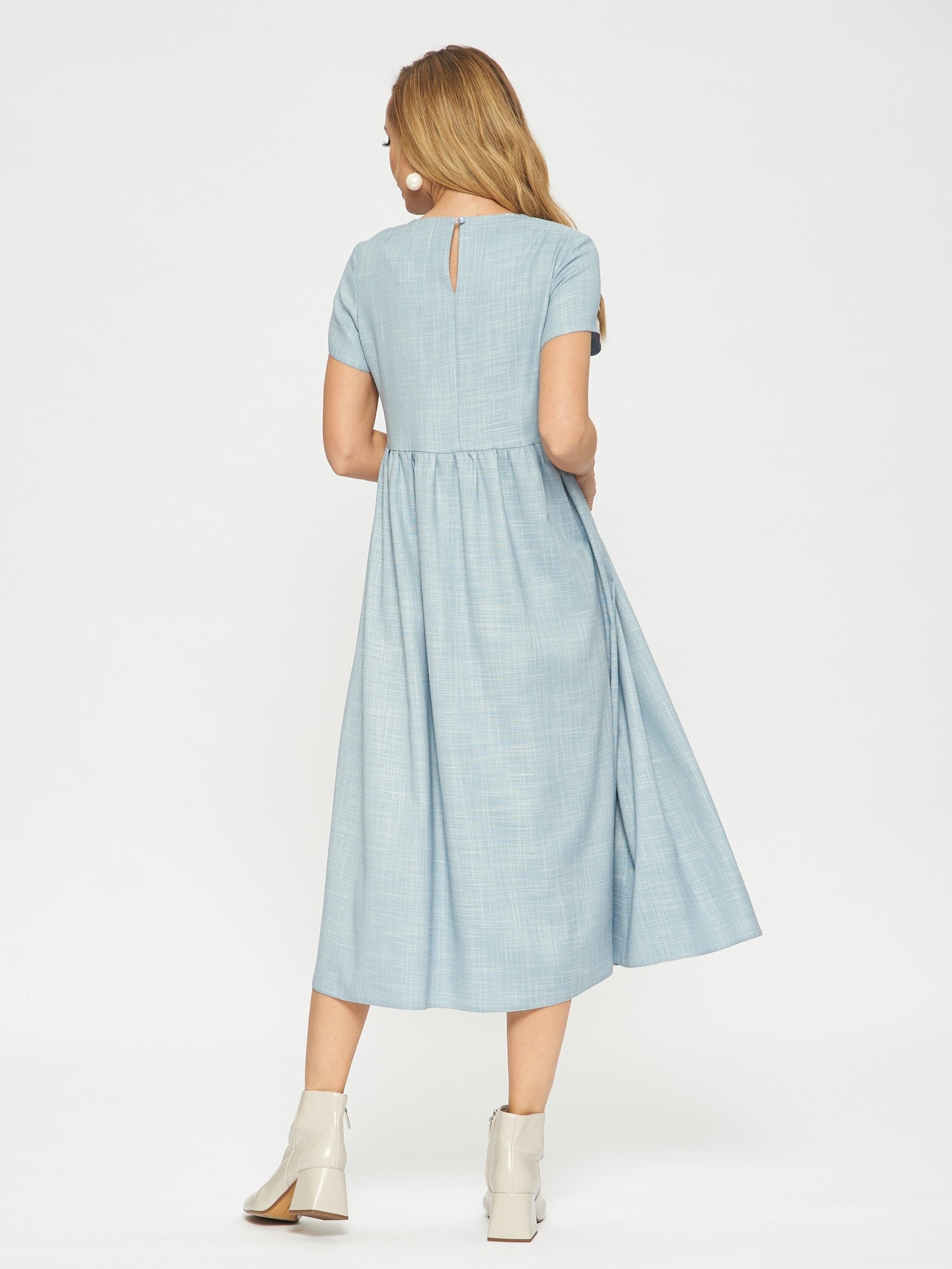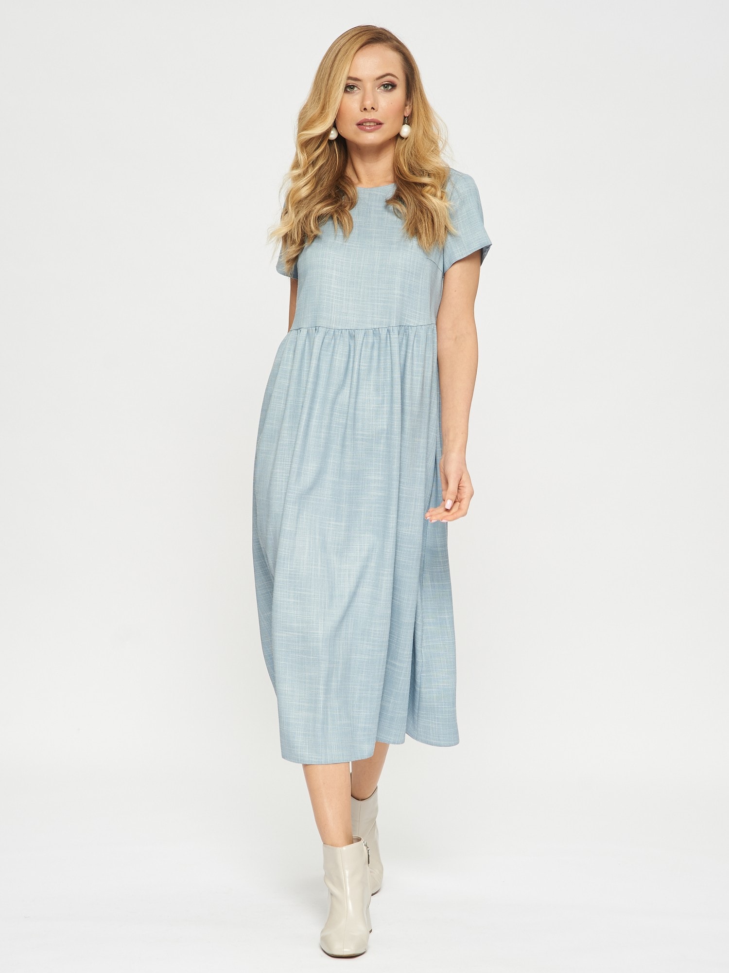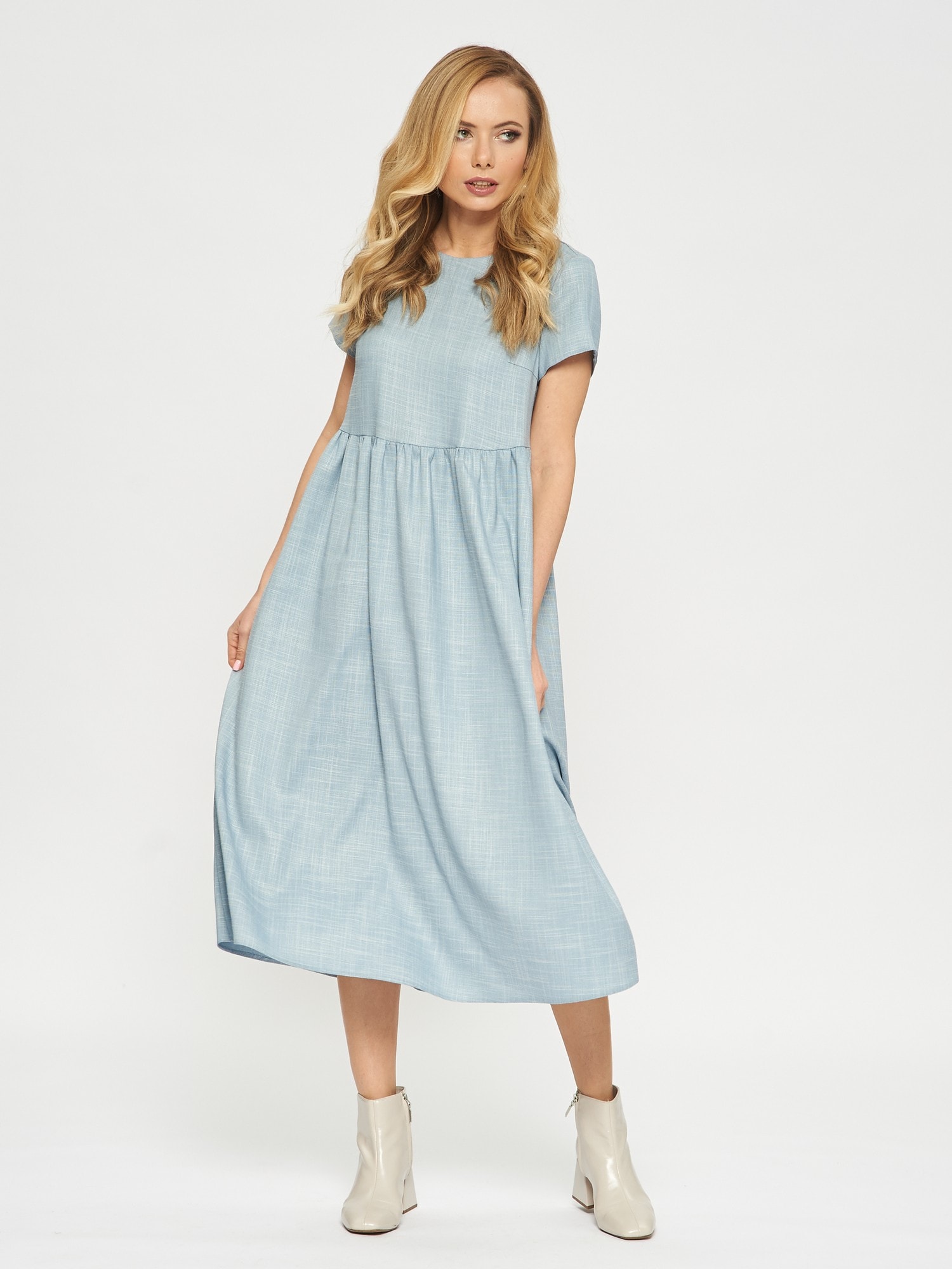 Платье в стиле baby doll. Слегка завышенная талия со сборками. Выполнено из небесно-голубой ткани с фактурой. Прекрасно сочетается как с лодочками, так и с кроссовками.