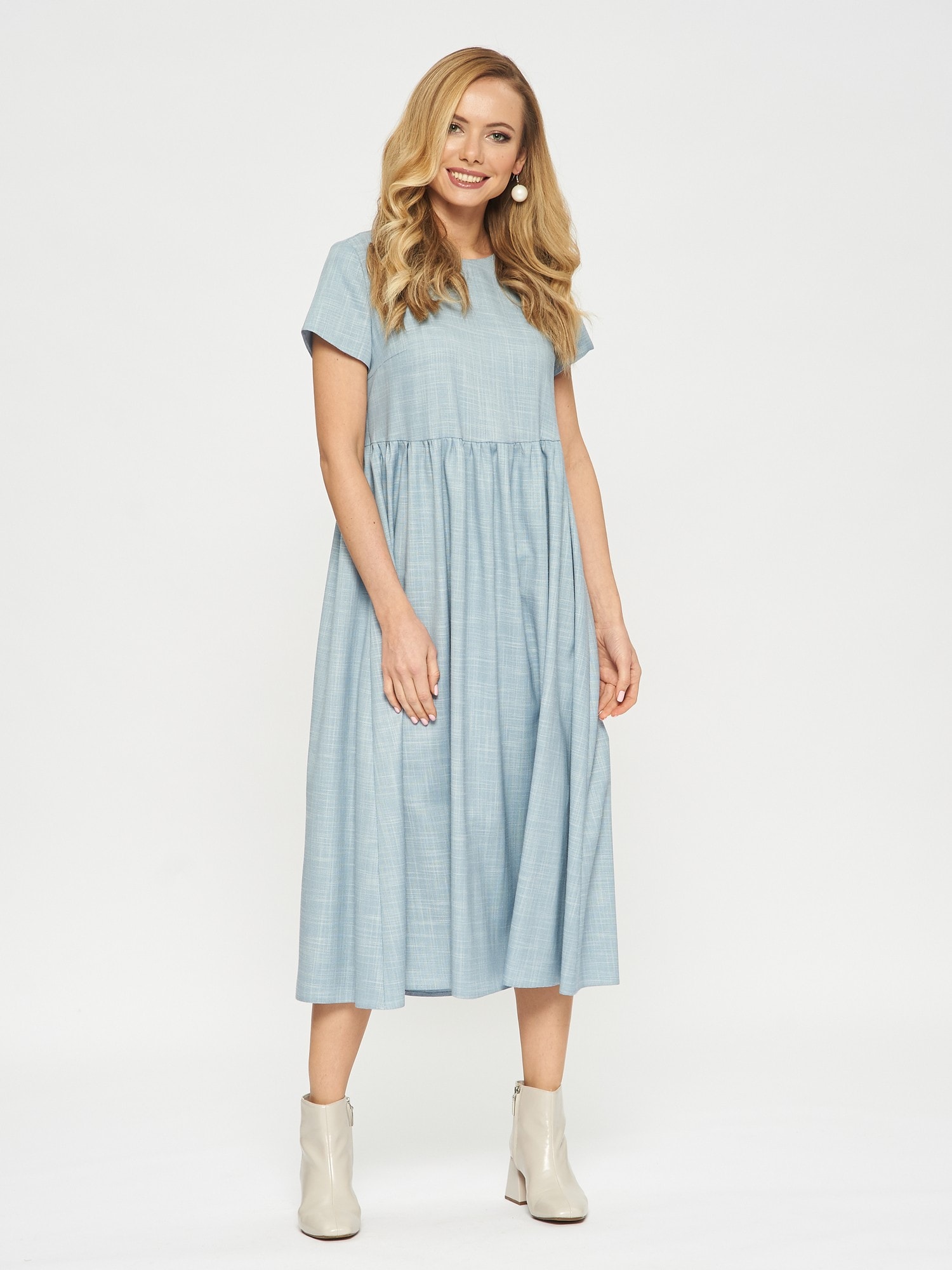 Платье в стиле baby doll. Слегка завышенная талия со сборками. Выполнено из небесно-голубой ткани с фактурой. Прекрасно сочетается как с лодочками, так и с кроссовками.