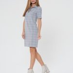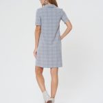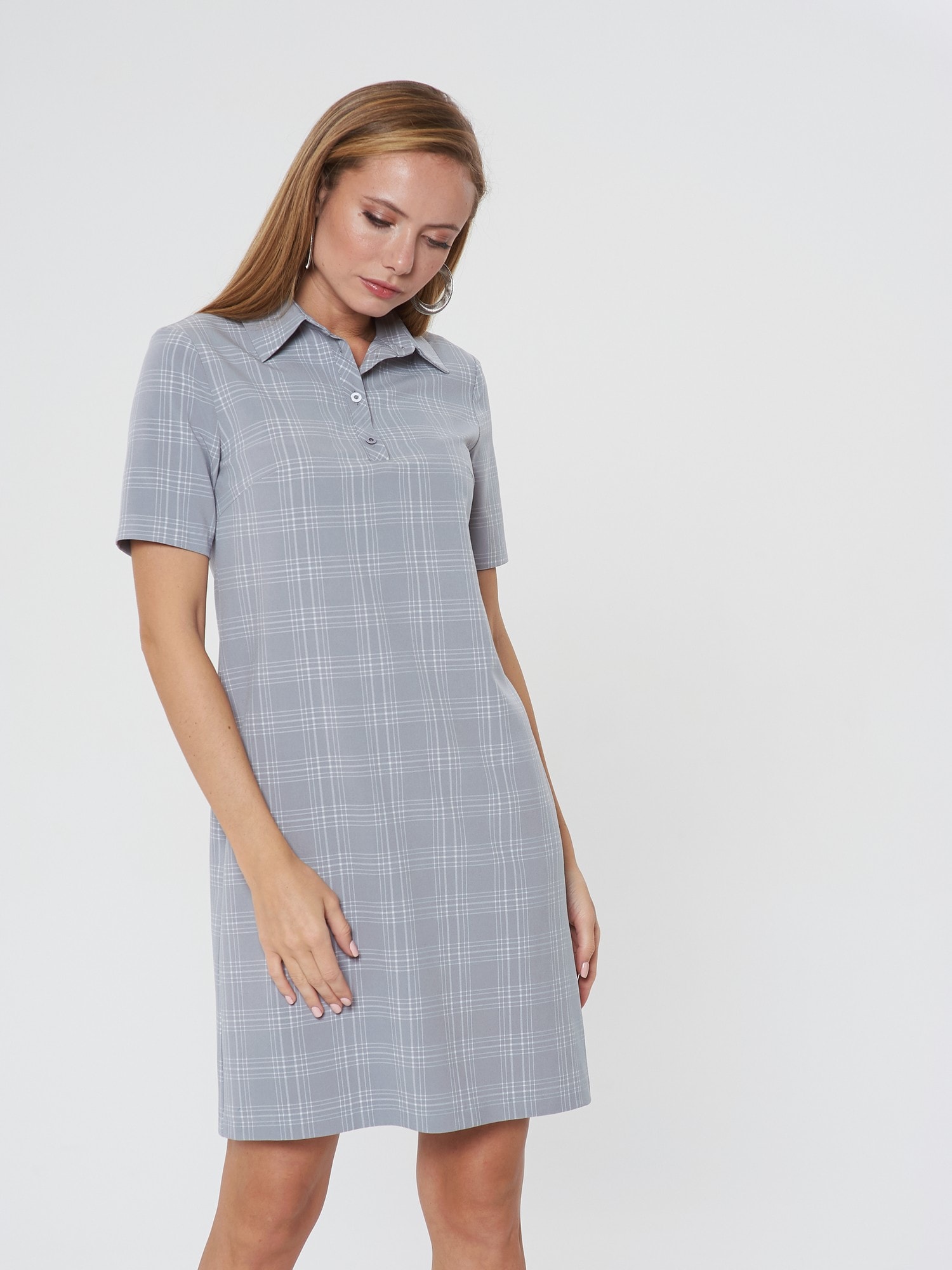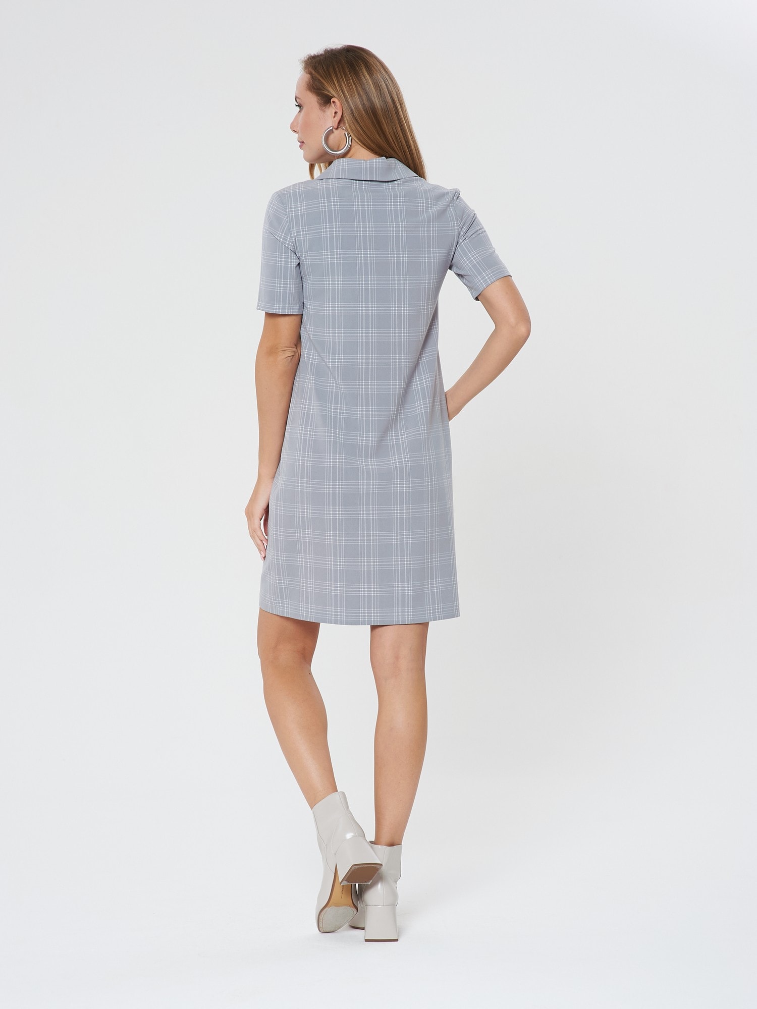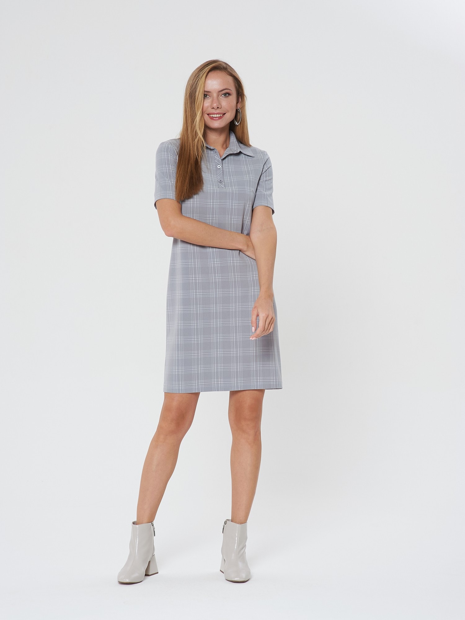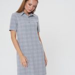 Платье-поло с коротким рукавом. Выполнено из светло-серой ткани в светлую тонкую клеточку. Застежка на усеченную планку спереди. Прекрасно сочетается как с кедами, так и с сапожками.