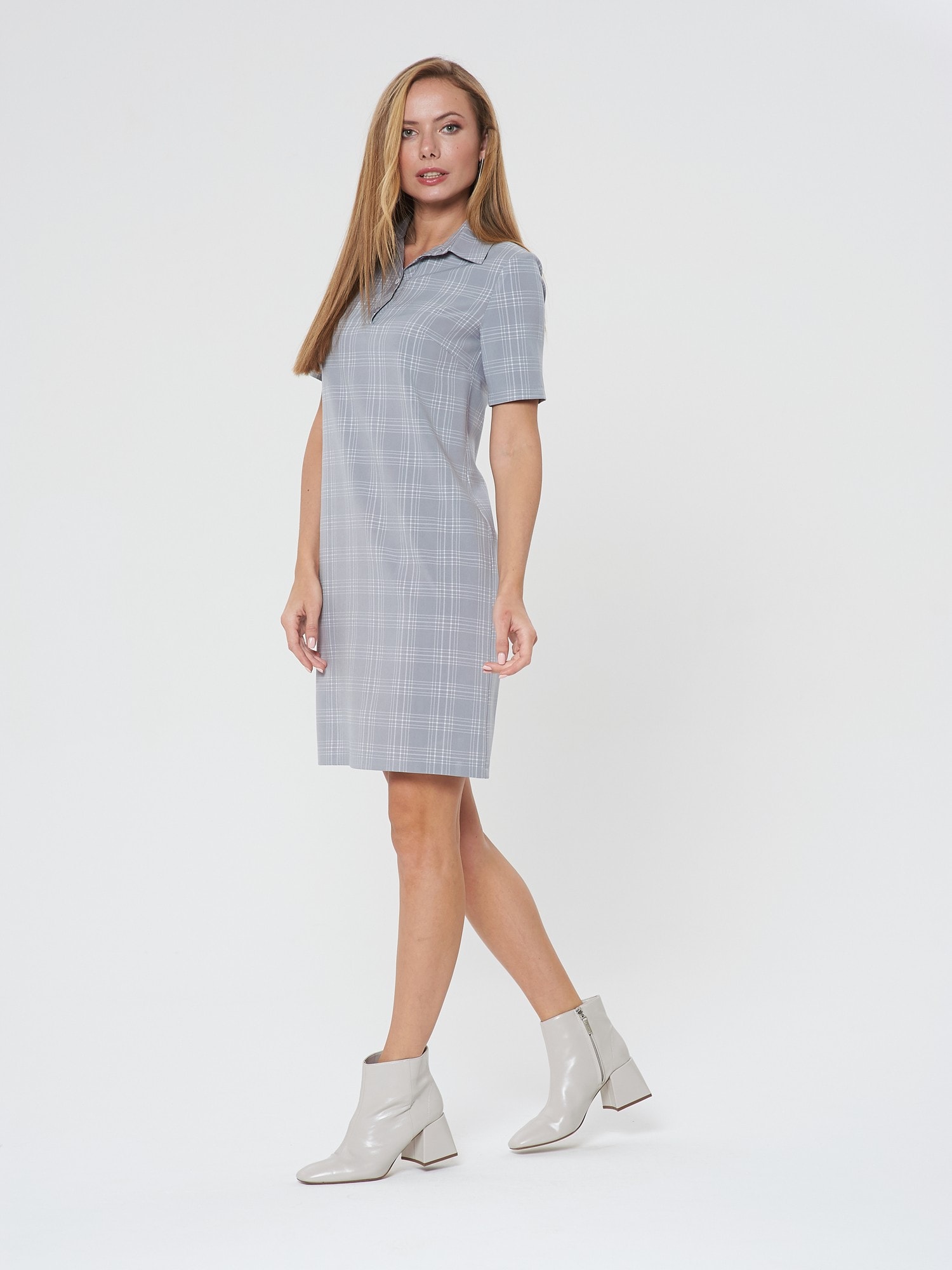 Платье-поло с коротким рукавом. Выполнено из светло-серой ткани в светлую тонкую клеточку. Застежка на усеченную планку спереди. Прекрасно сочетается как с кедами, так и с сапожками.