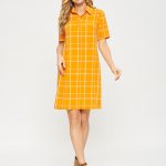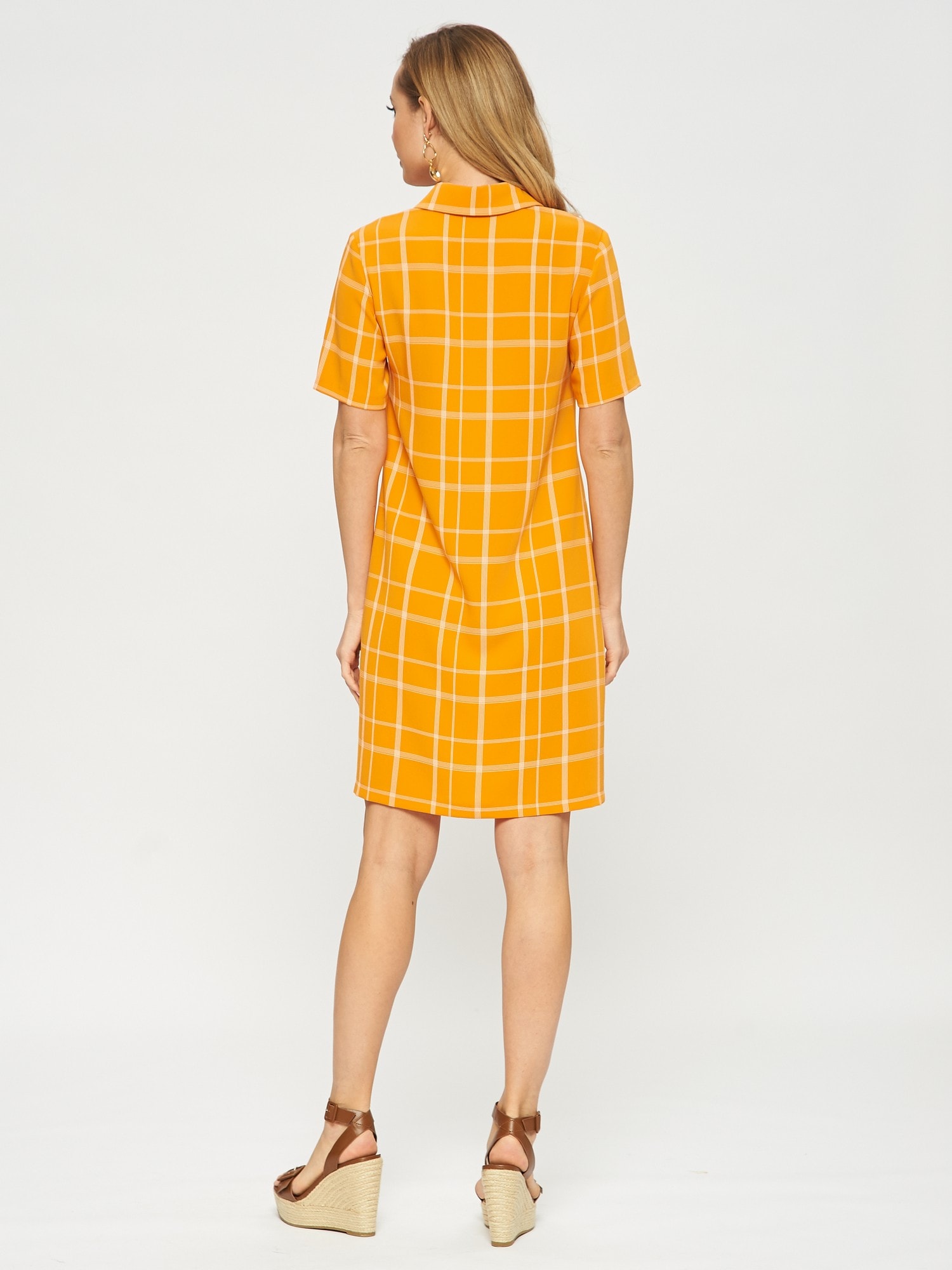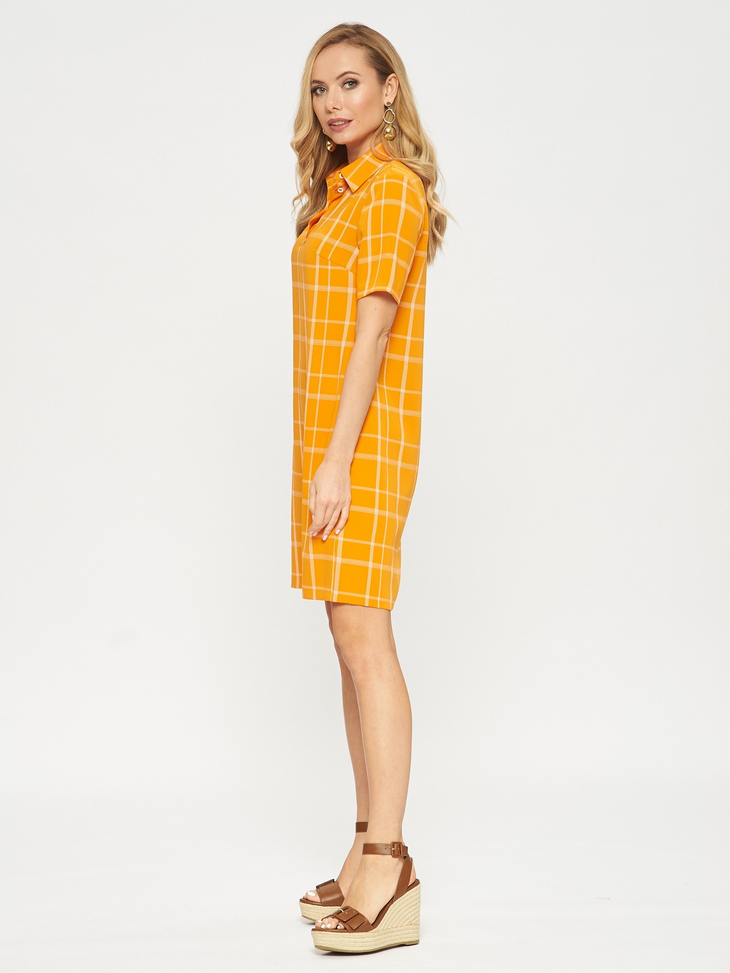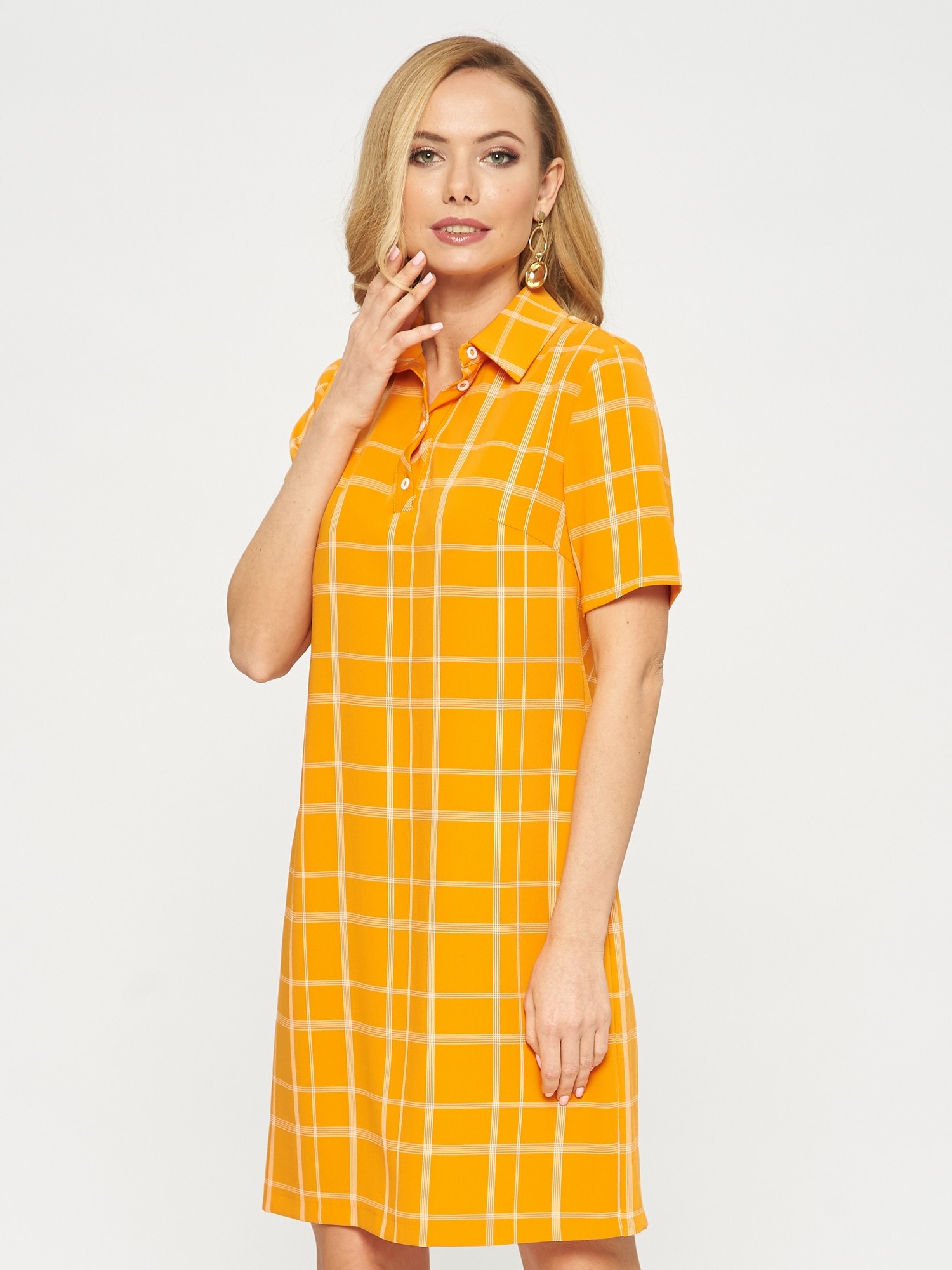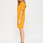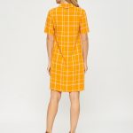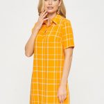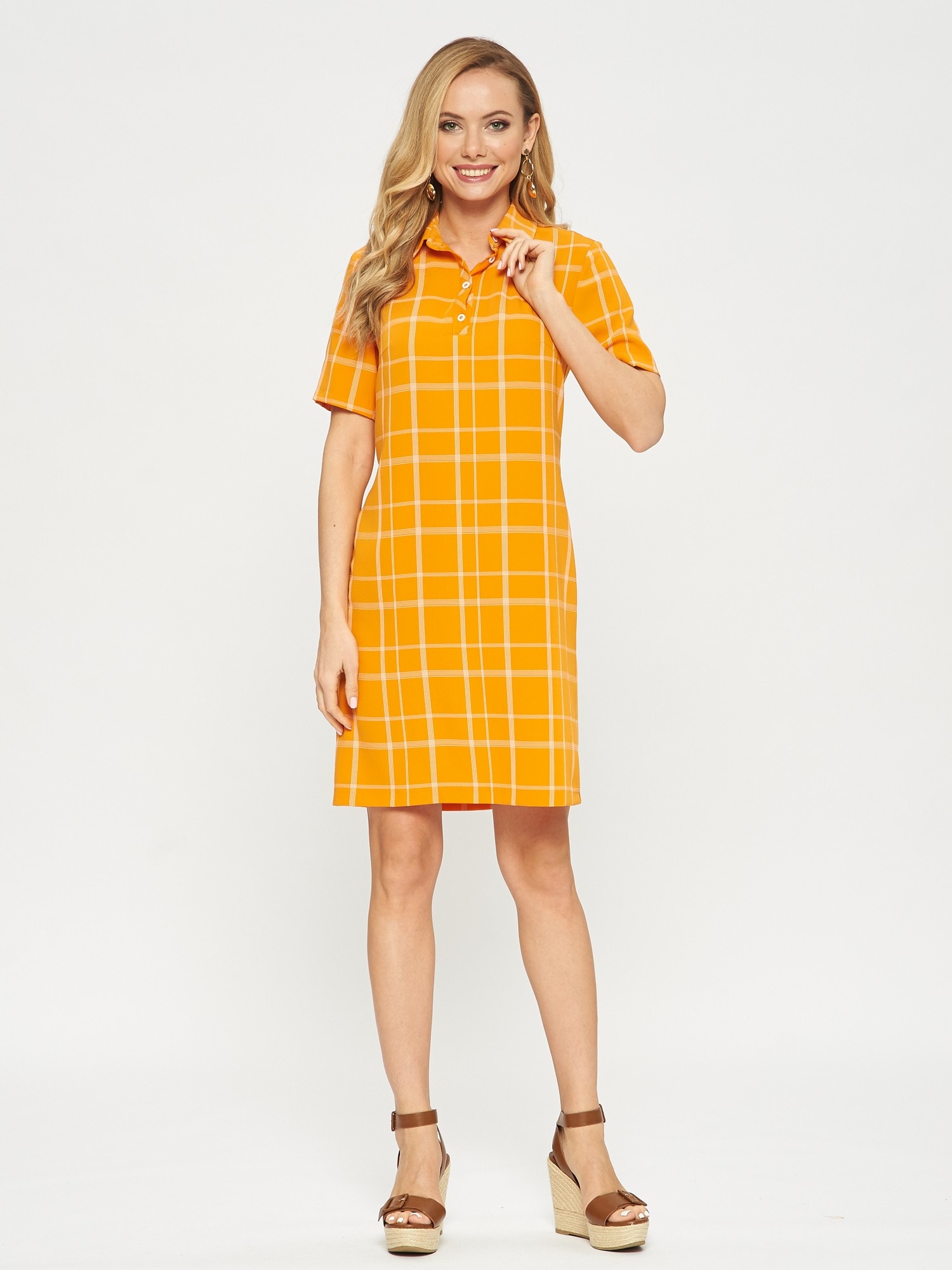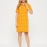 Платье-поло с коротким рукавом. Выполнено из ткани апельсинового цвета в светлую тонкую клеточку. Застежка на усеченную планку спереди. Прекрасно сочетается как с кедами, так и с сапожками.