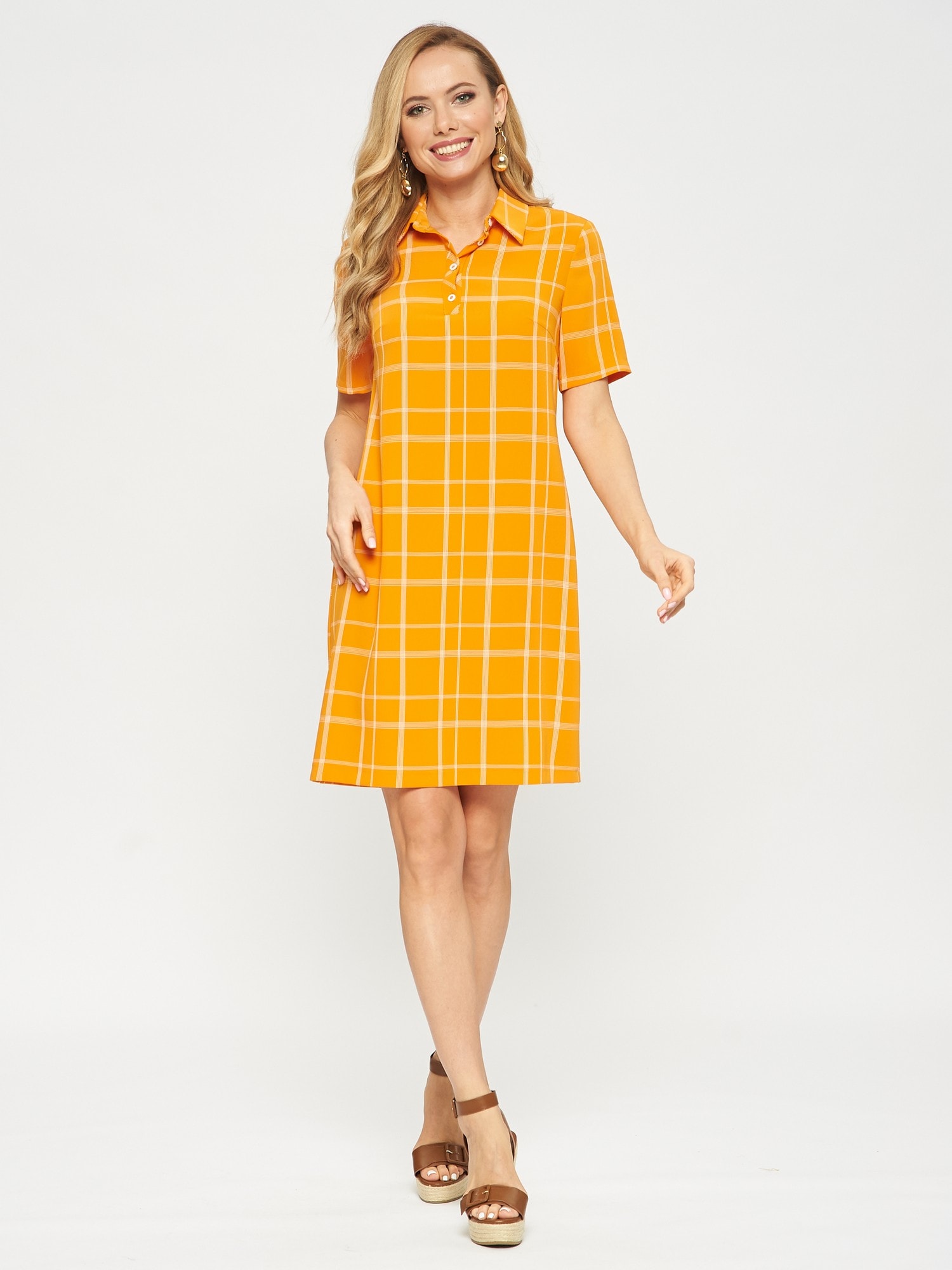Платье-поло с коротким рукавом. Выполнено из ткани апельсинового цвета в светлую тонкую клеточку. Застежка на усеченную планку спереди. Прекрасно сочетается как с кедами, так и с сапожками.
