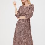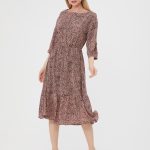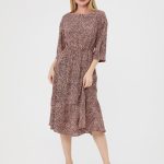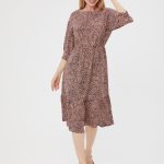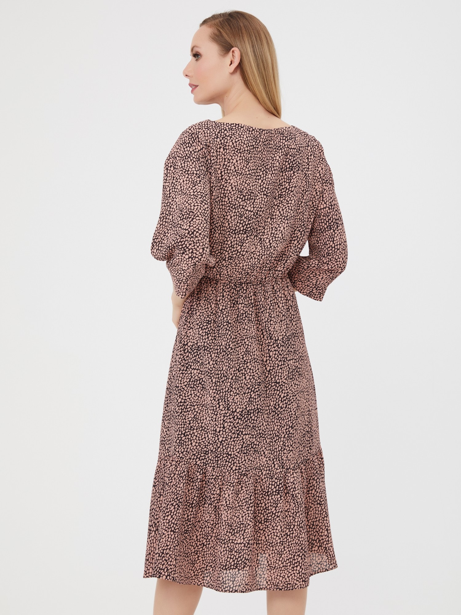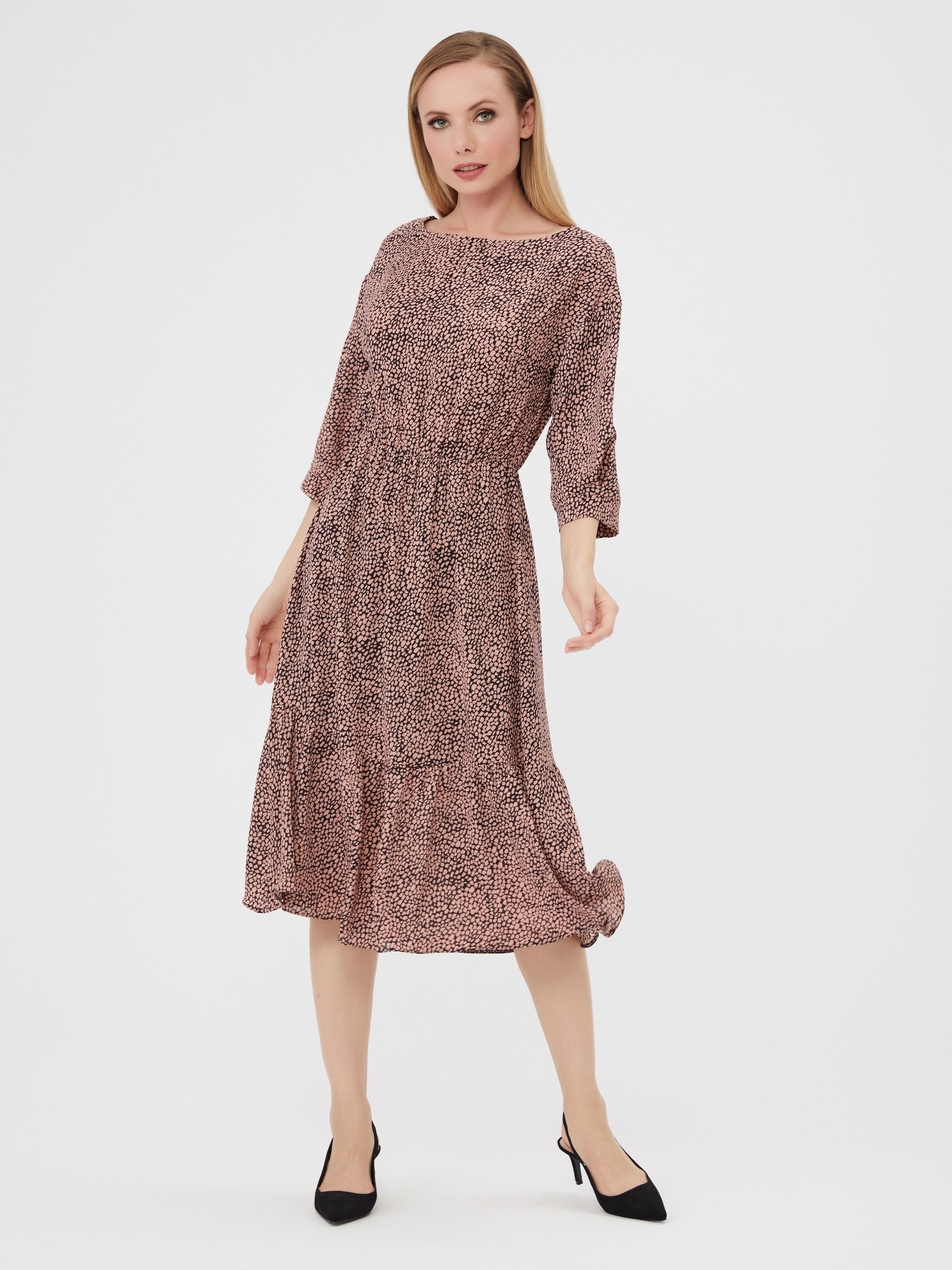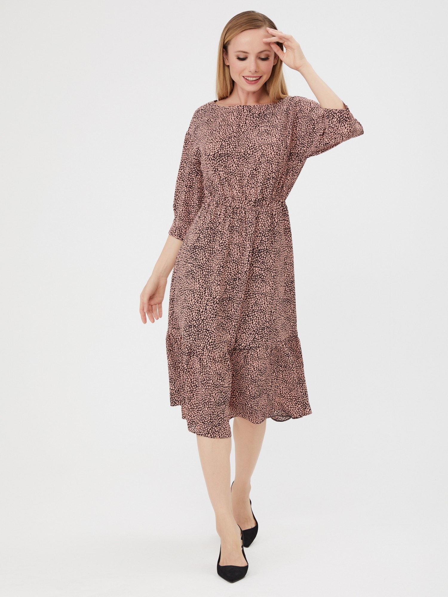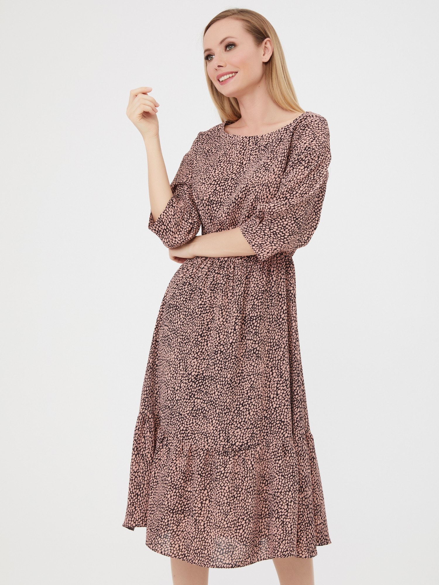 Романтичное платье на подкладке, с принтом "камушки". Талия на резинке, волан по низу платья.
