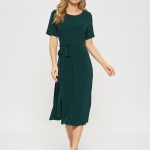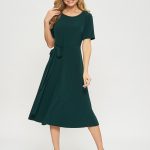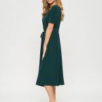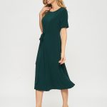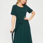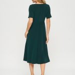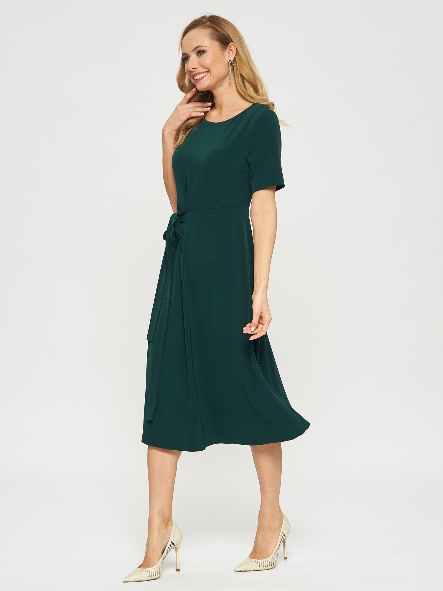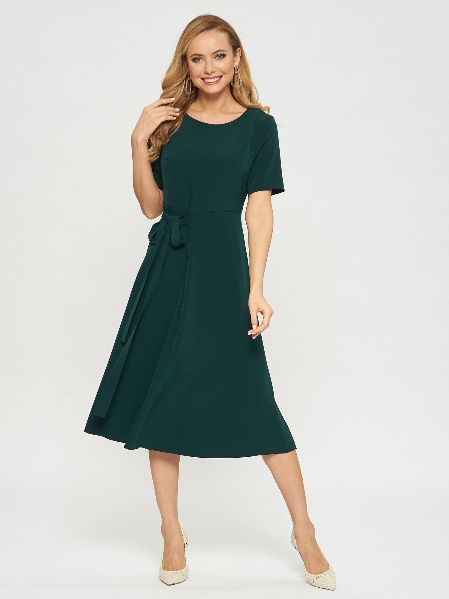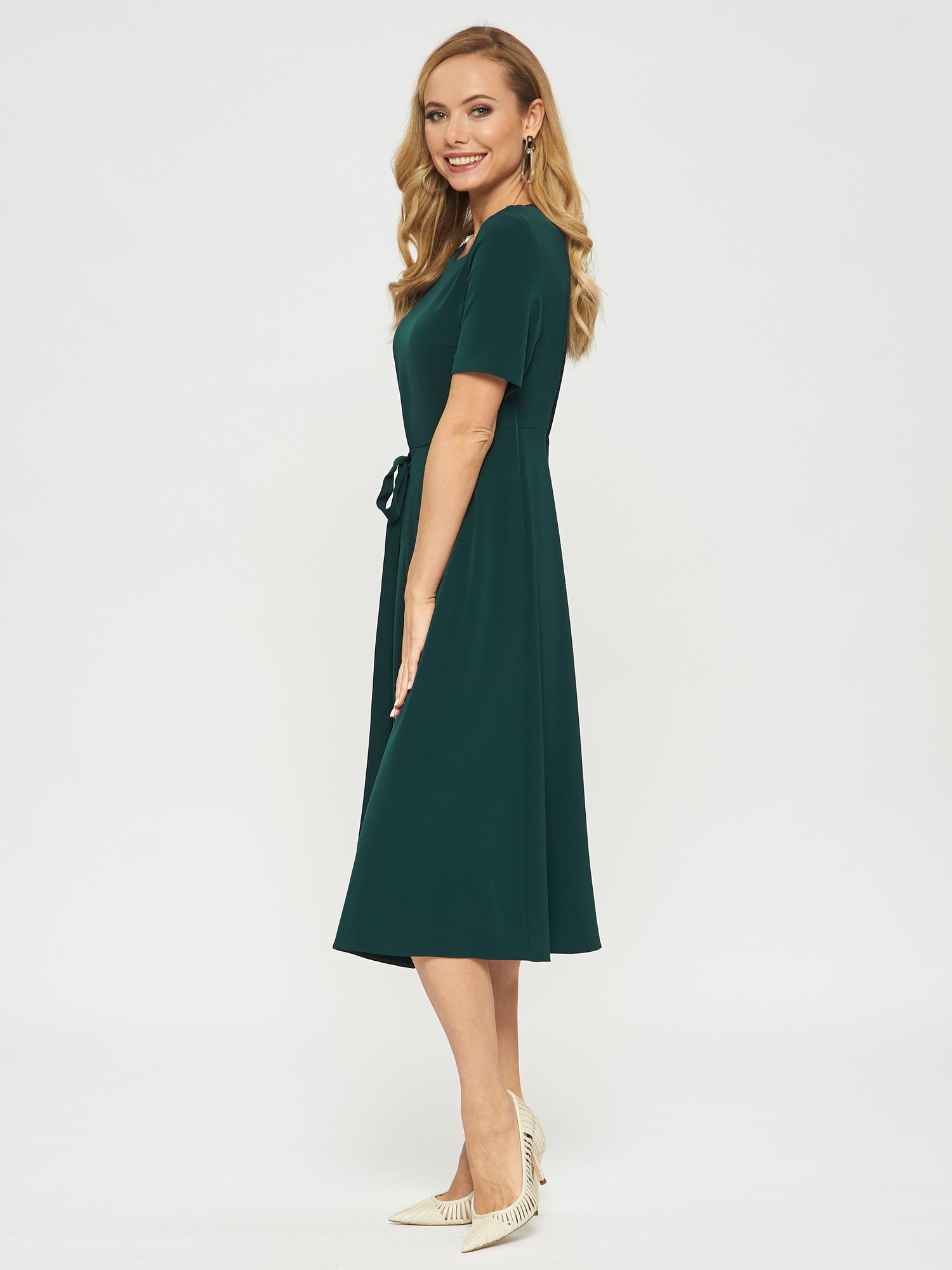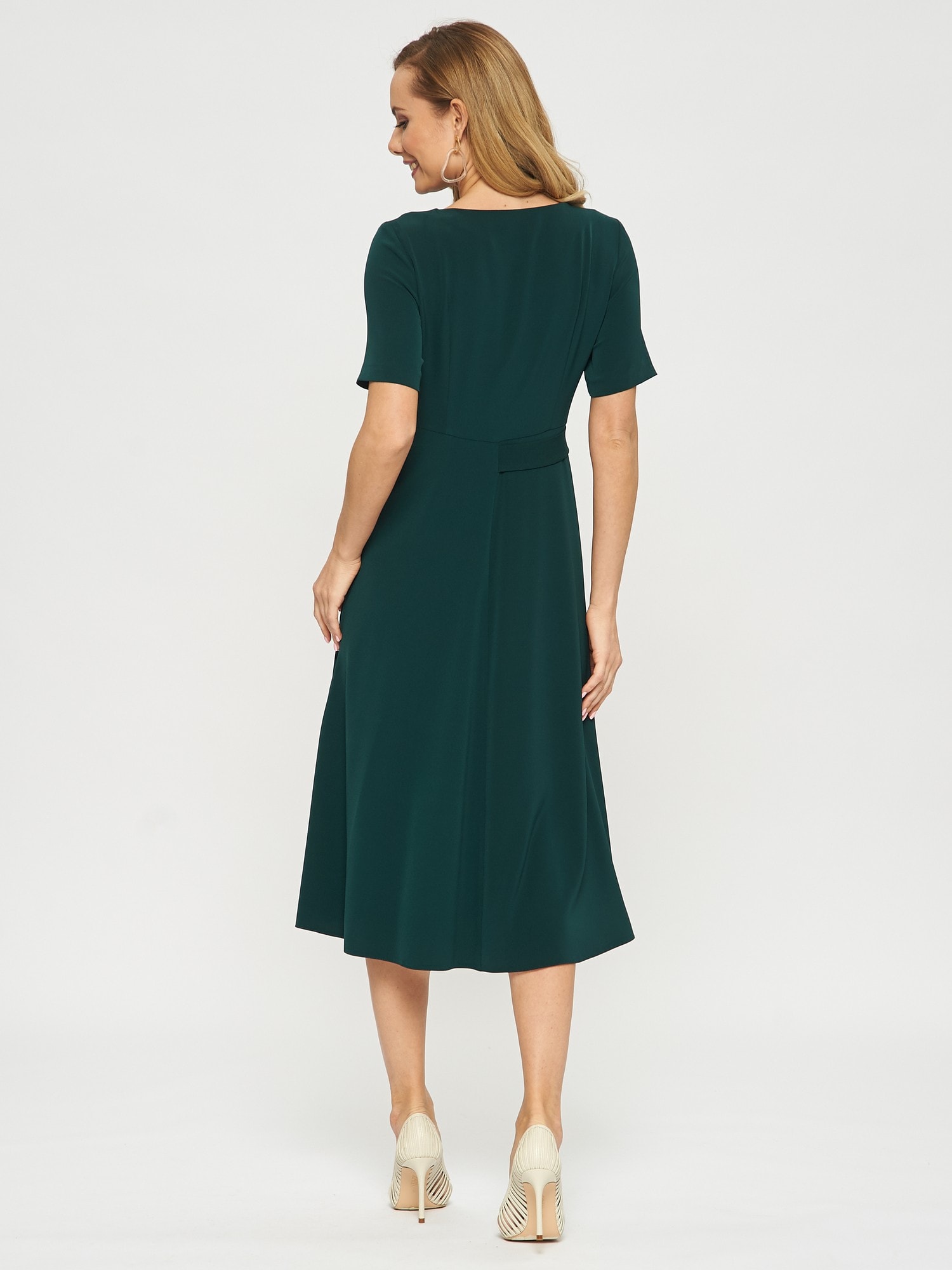 Платье глубокого изумрудного оттенка с отрезной линией талии. Детали втачного пояса расположены сбоку и посередине в линии шва.