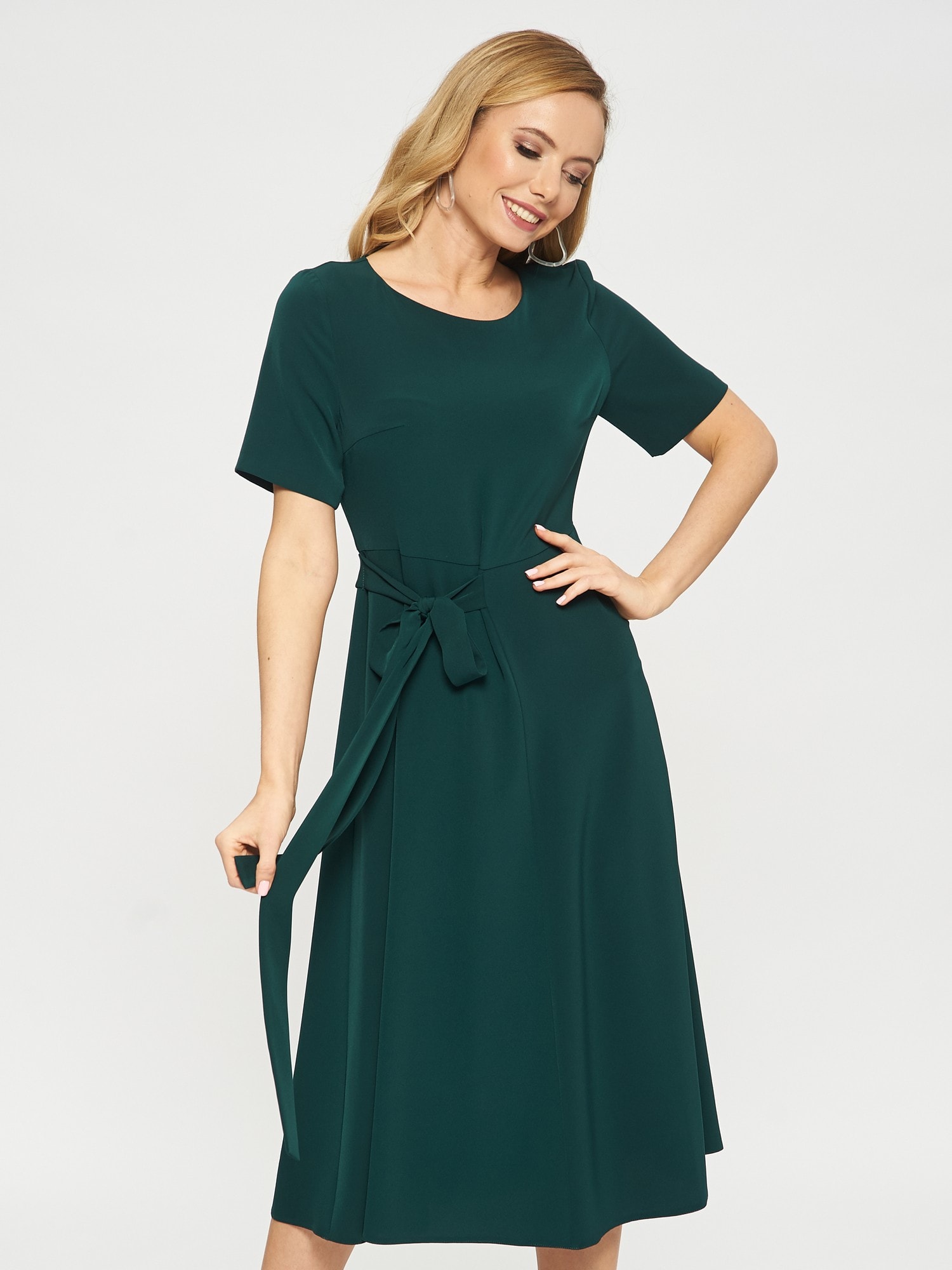 Платье глубокого изумрудного оттенка с отрезной линией талии. Детали втачного пояса расположены сбоку и посередине в линии шва.