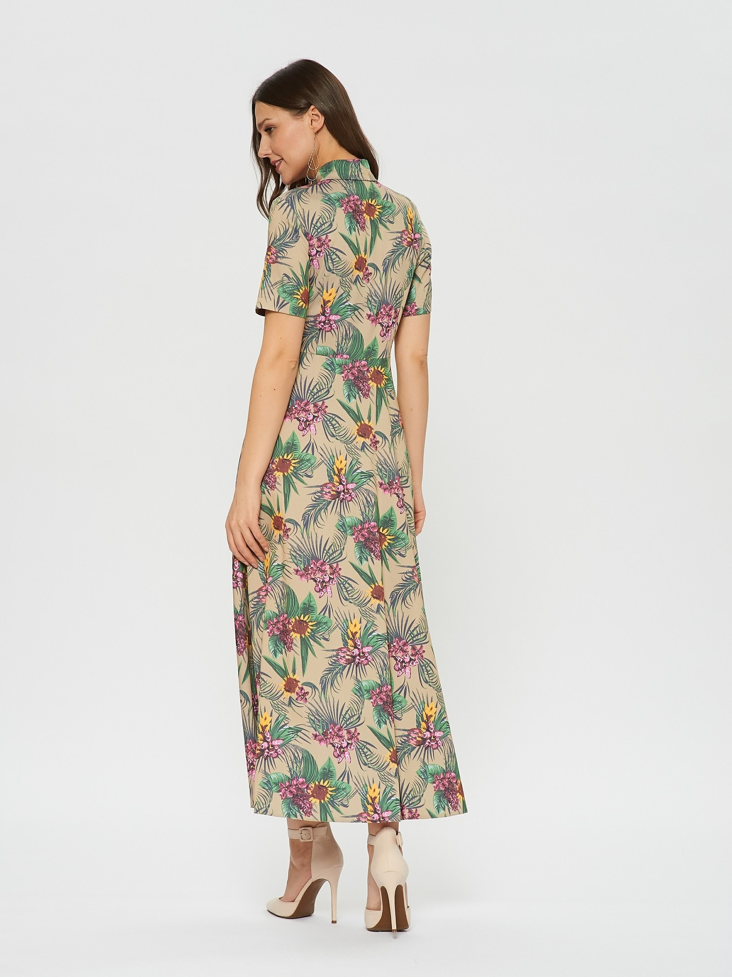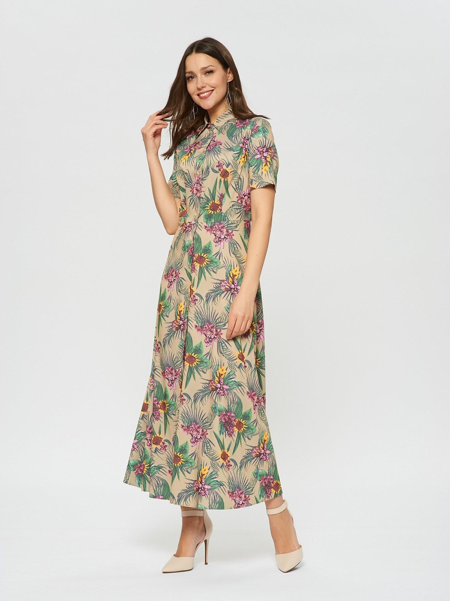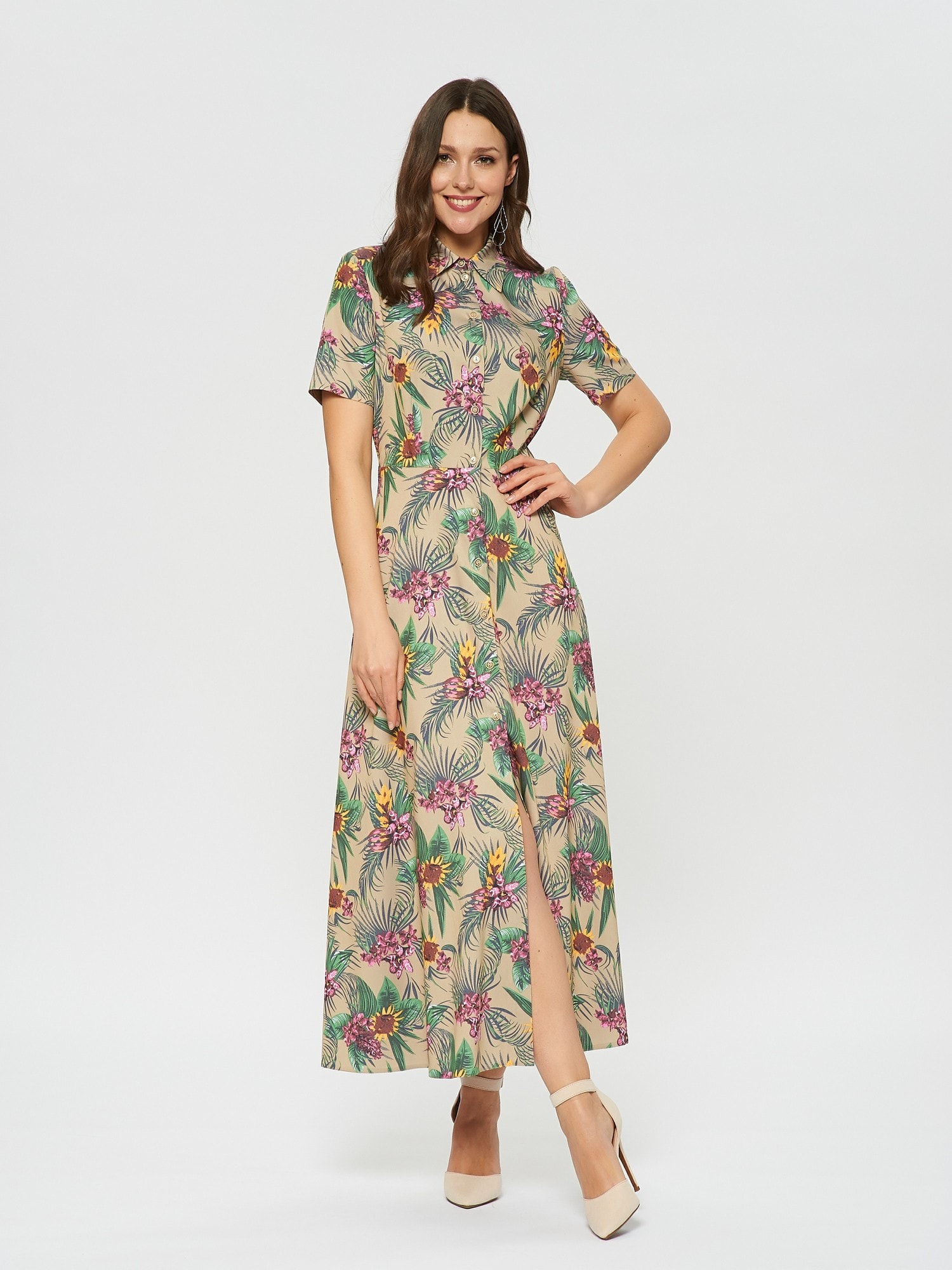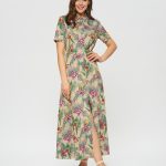 Длинное платье-рубашка с коротким рукавом в гавайском стиле. Планка с пуговицами по всей длине, отложной воротник. Платье вдохновлено трендом "тропики" летнего сезона.
