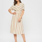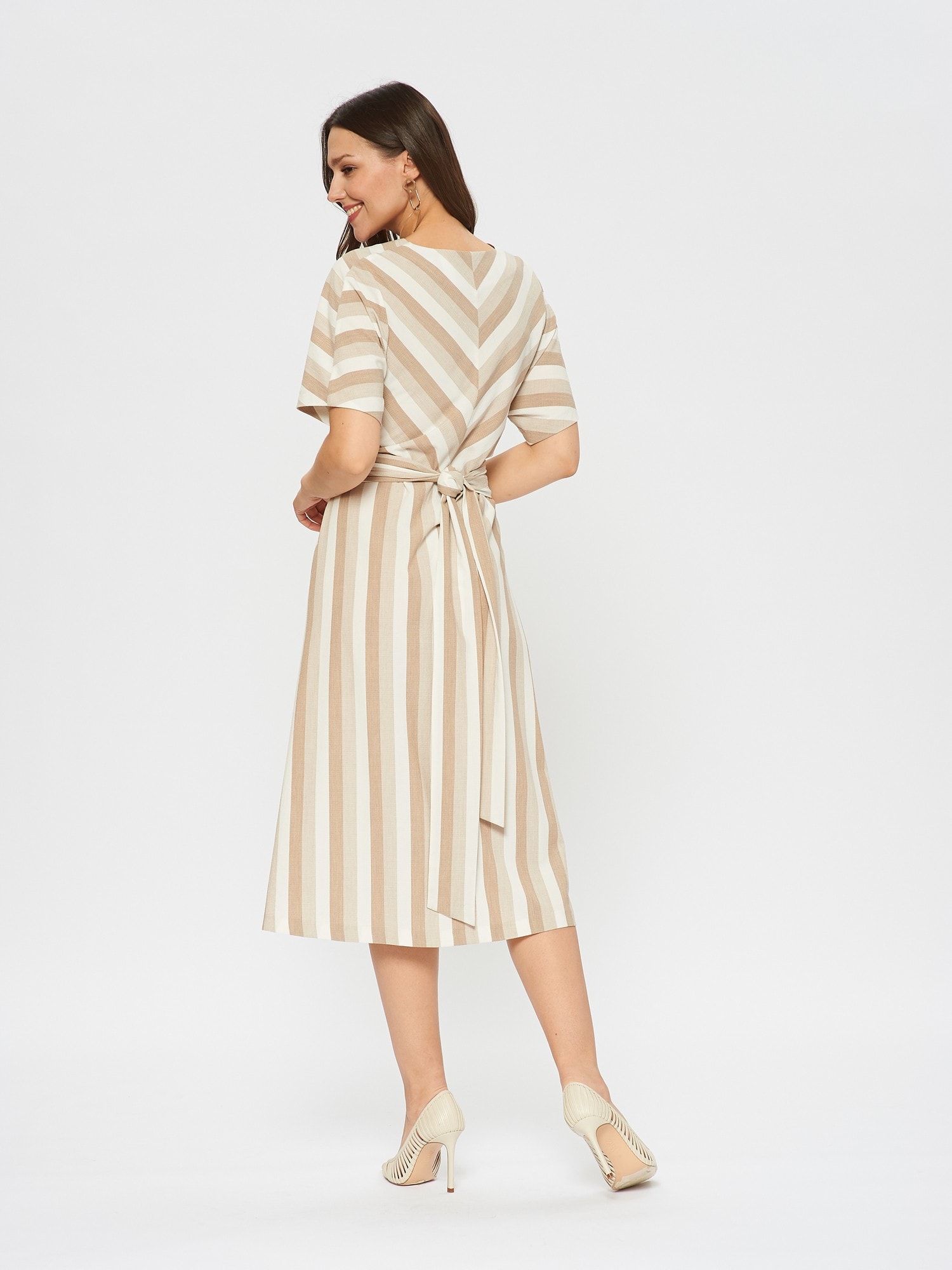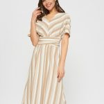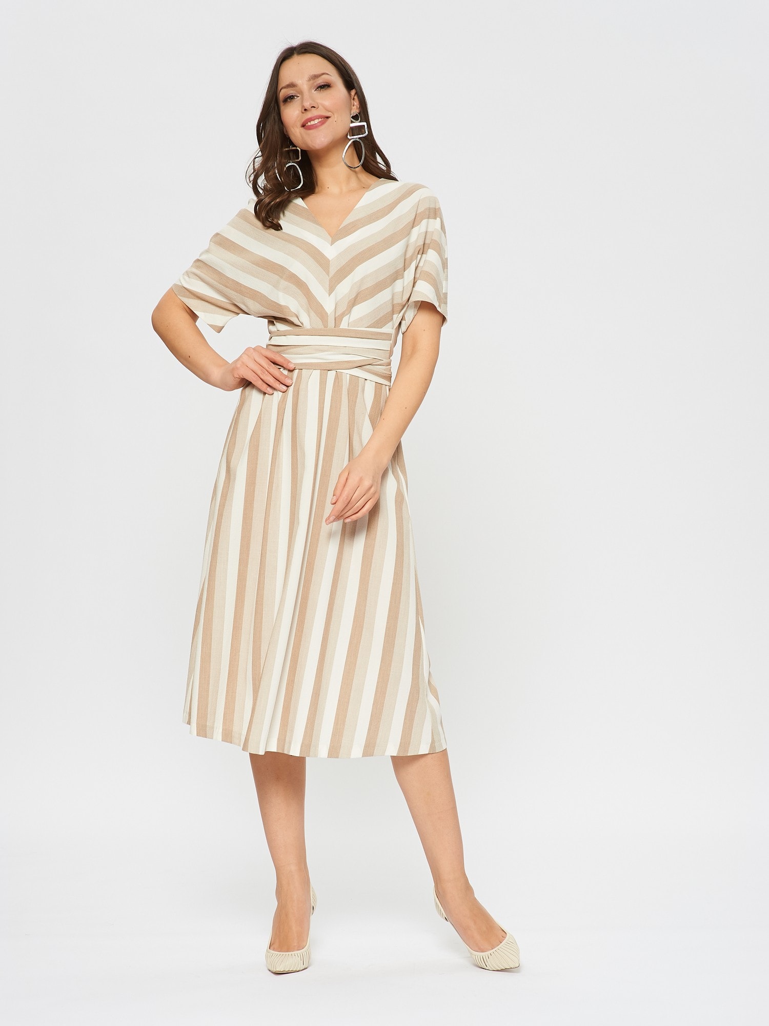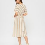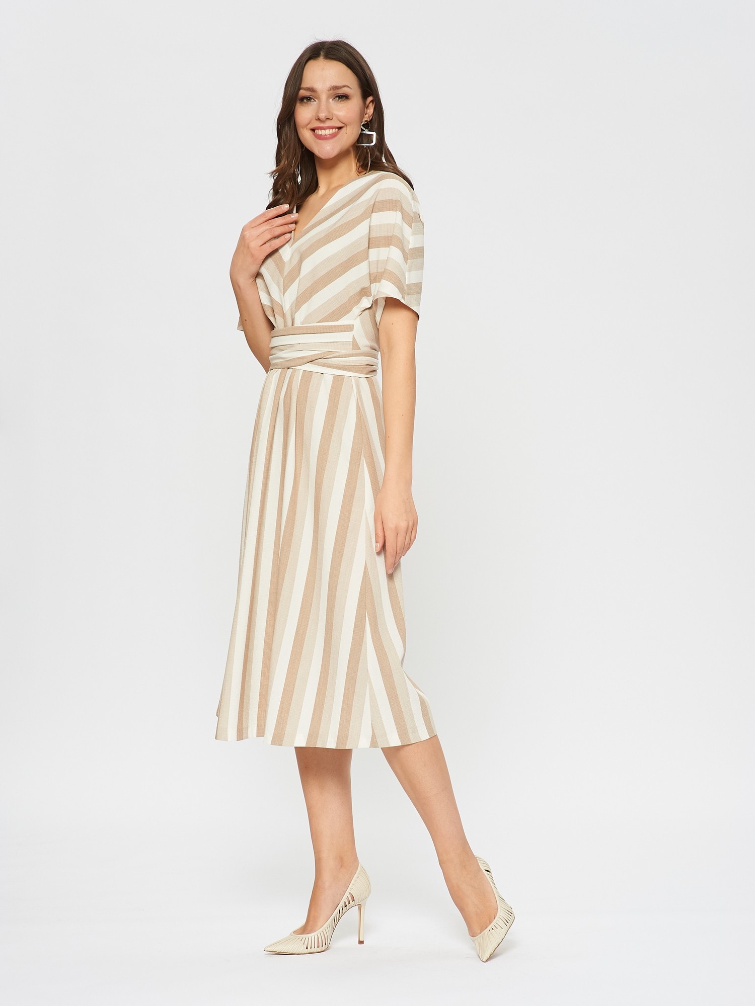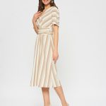 Платье в полоску с V-образным вырезом и цельнокроенным рукавом. Широкий пояс вшит в боковые швы, поэтому смело экспериментируйте с его завязыванием. Это платье идеально и для встречи в городе, и для прогулки по греческим пляжам.